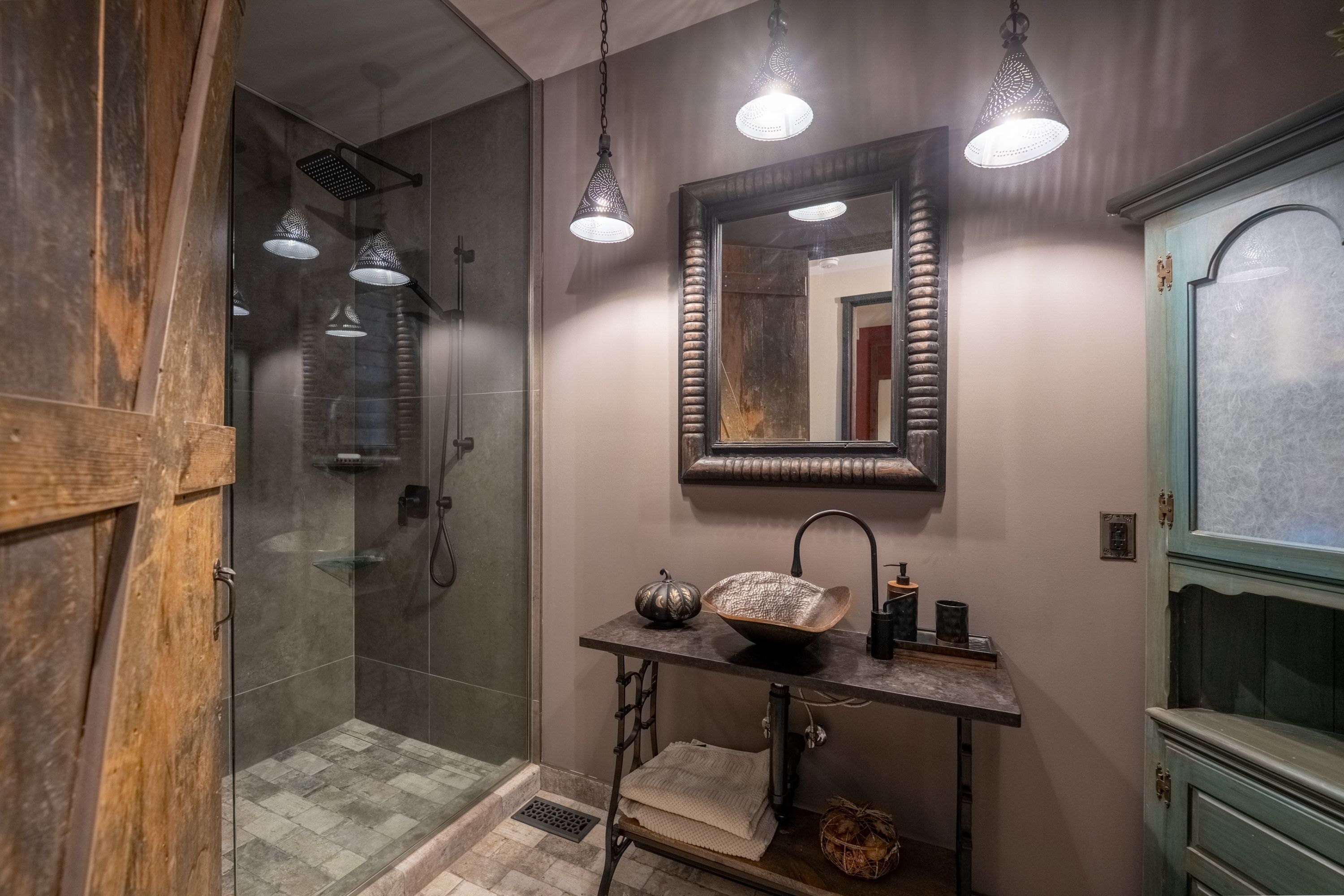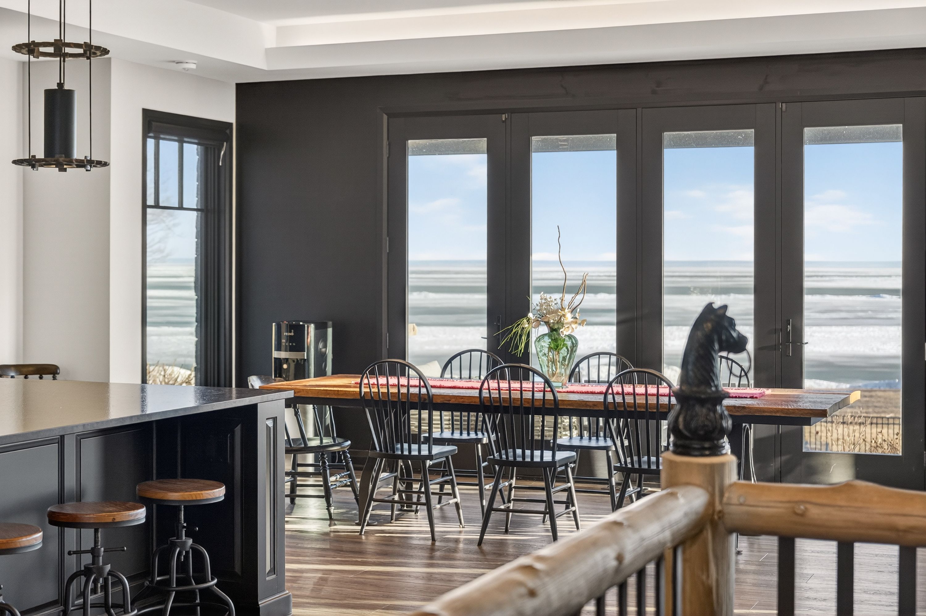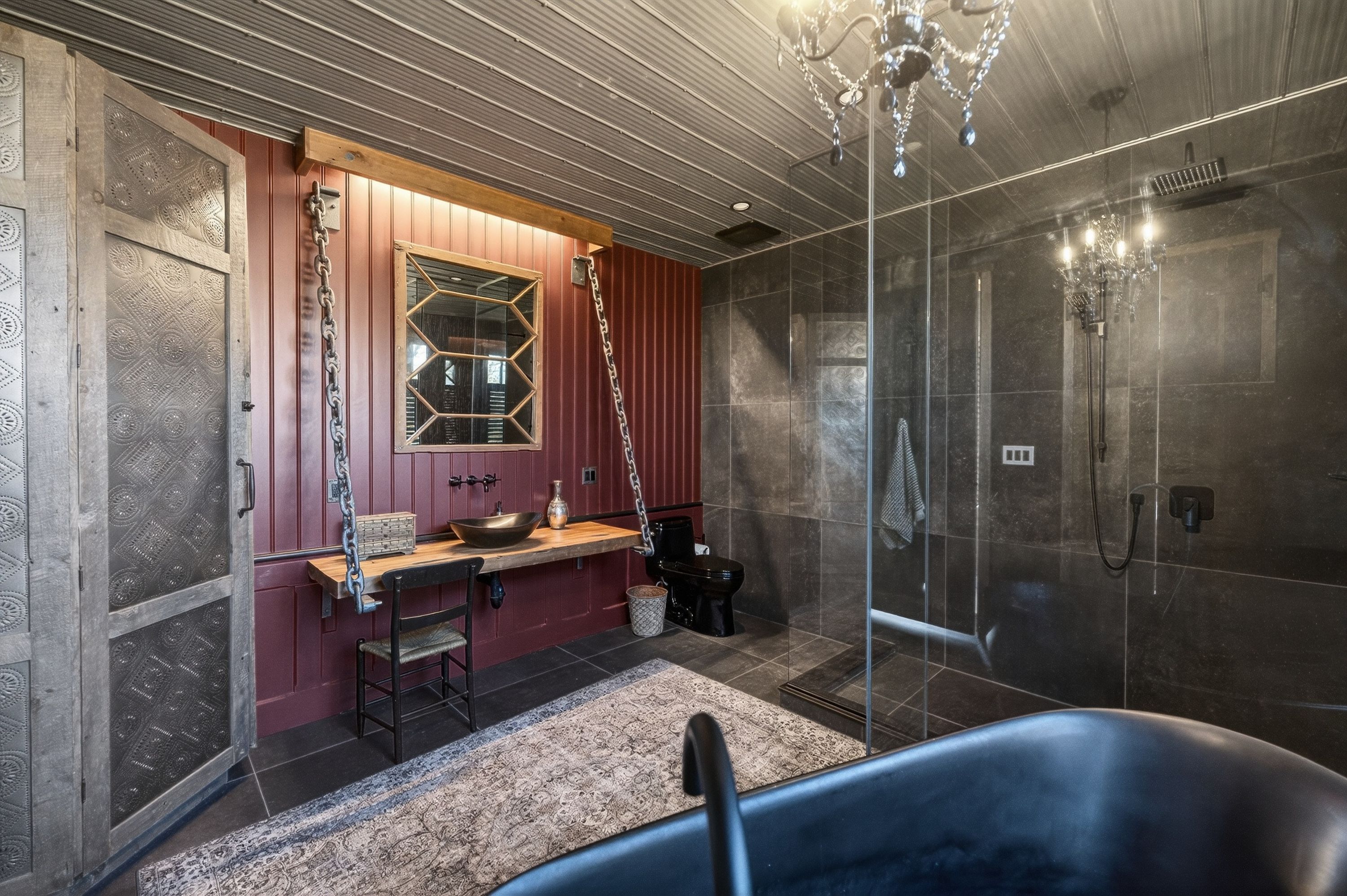 • Kitchen features high-end appliances, large island, and custom repurposed door.