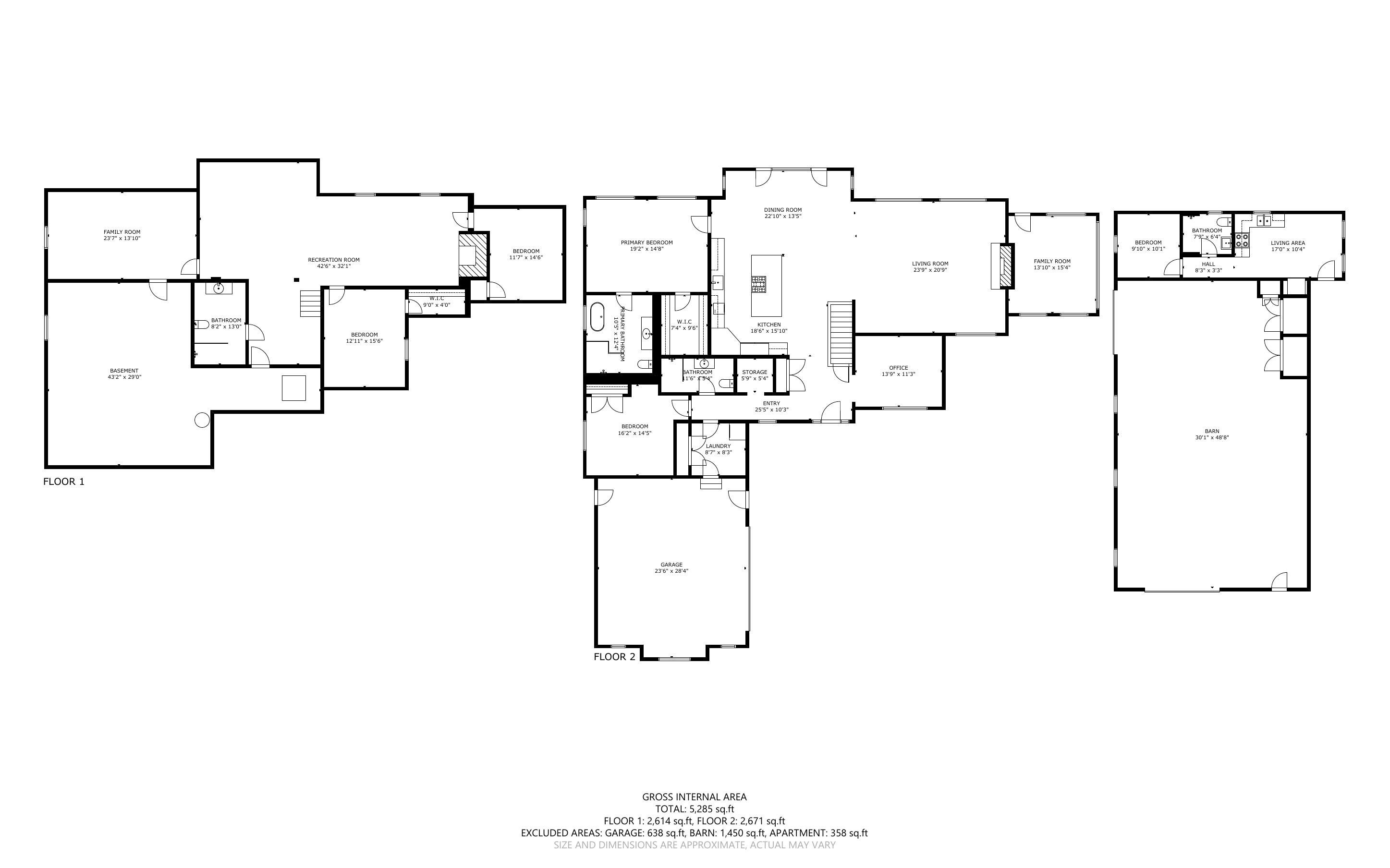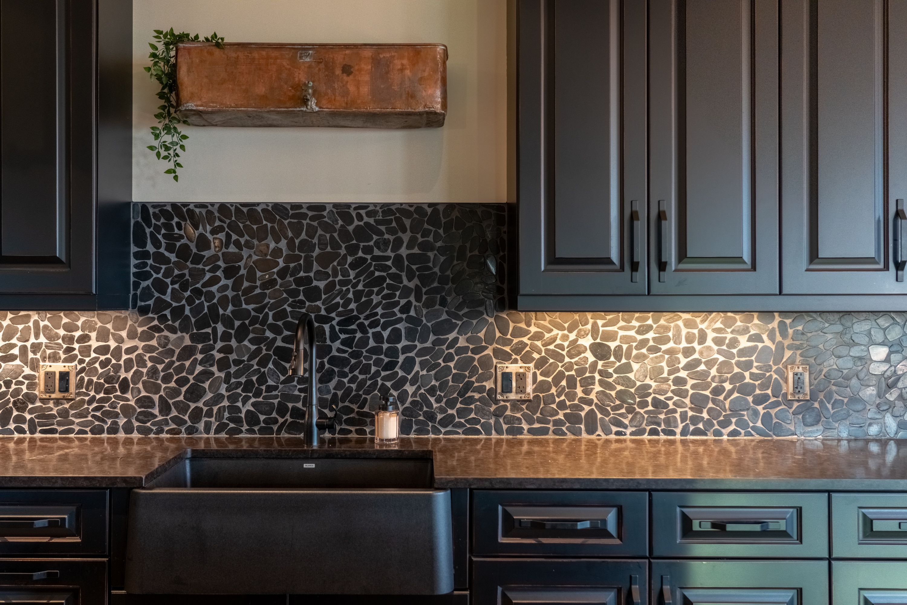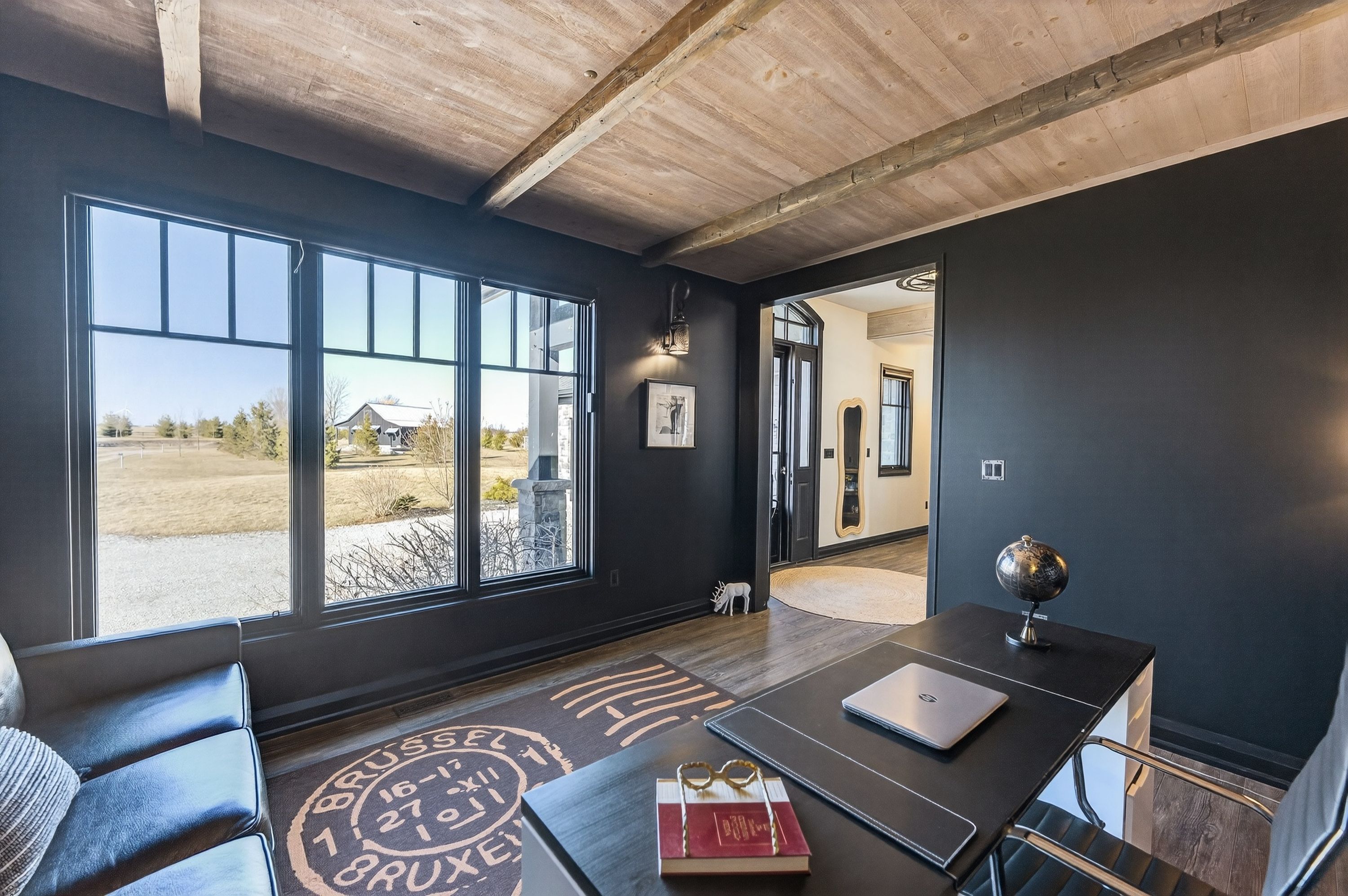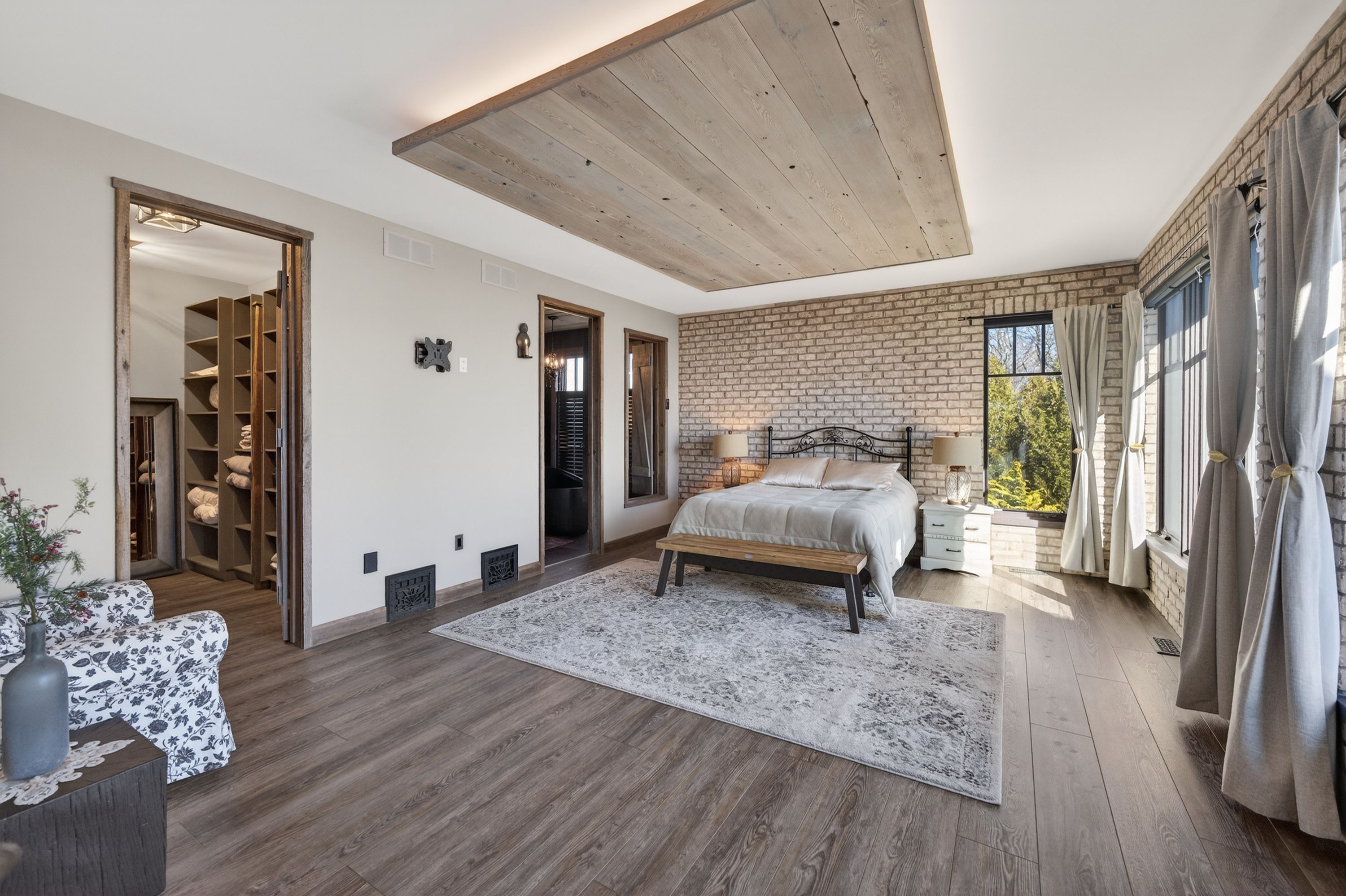 • Kitchen features high-end appliances, large island, and custom repurposed door.