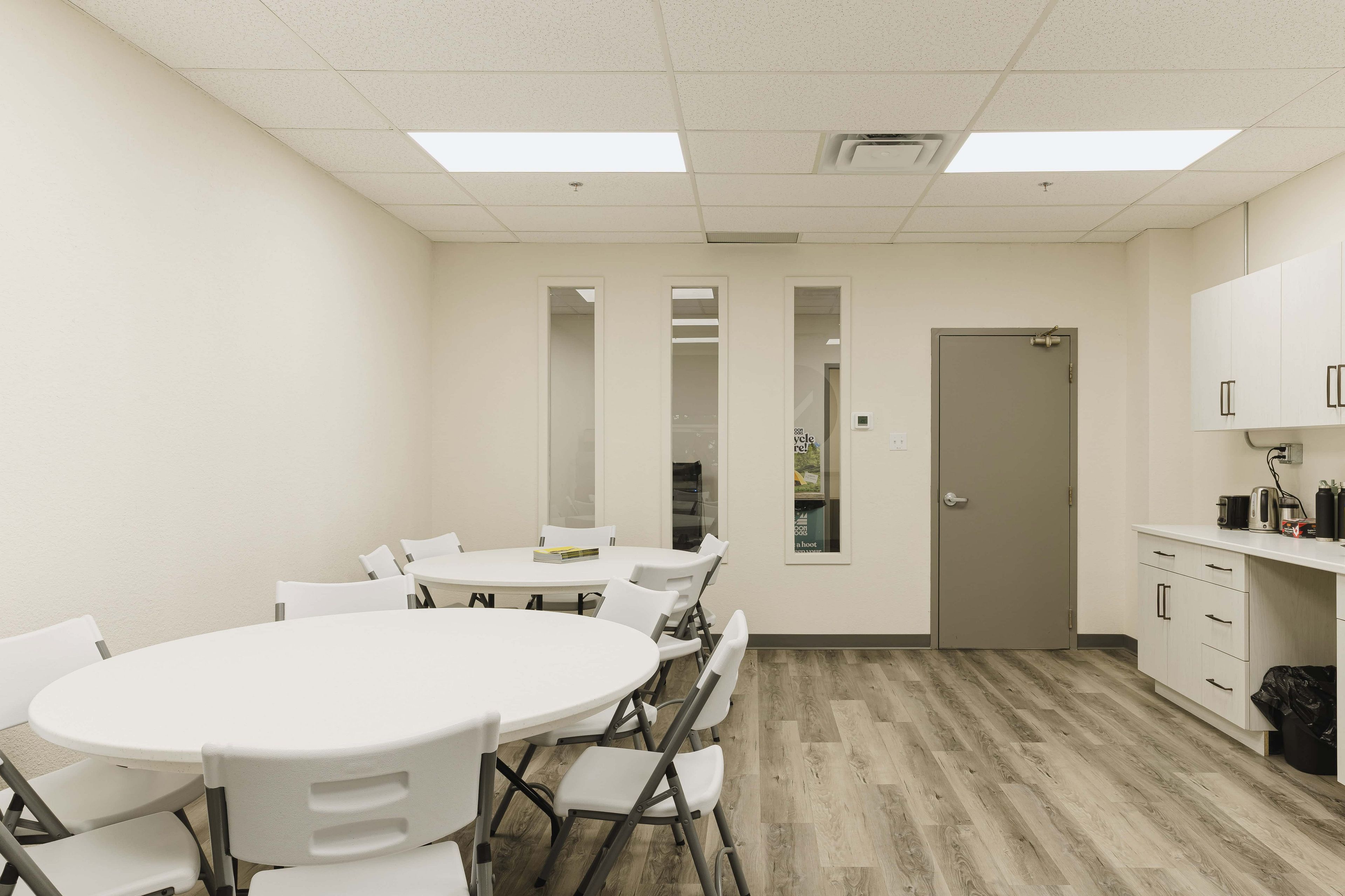 • Includes a board room for meetings and a kitchenette for breaks.