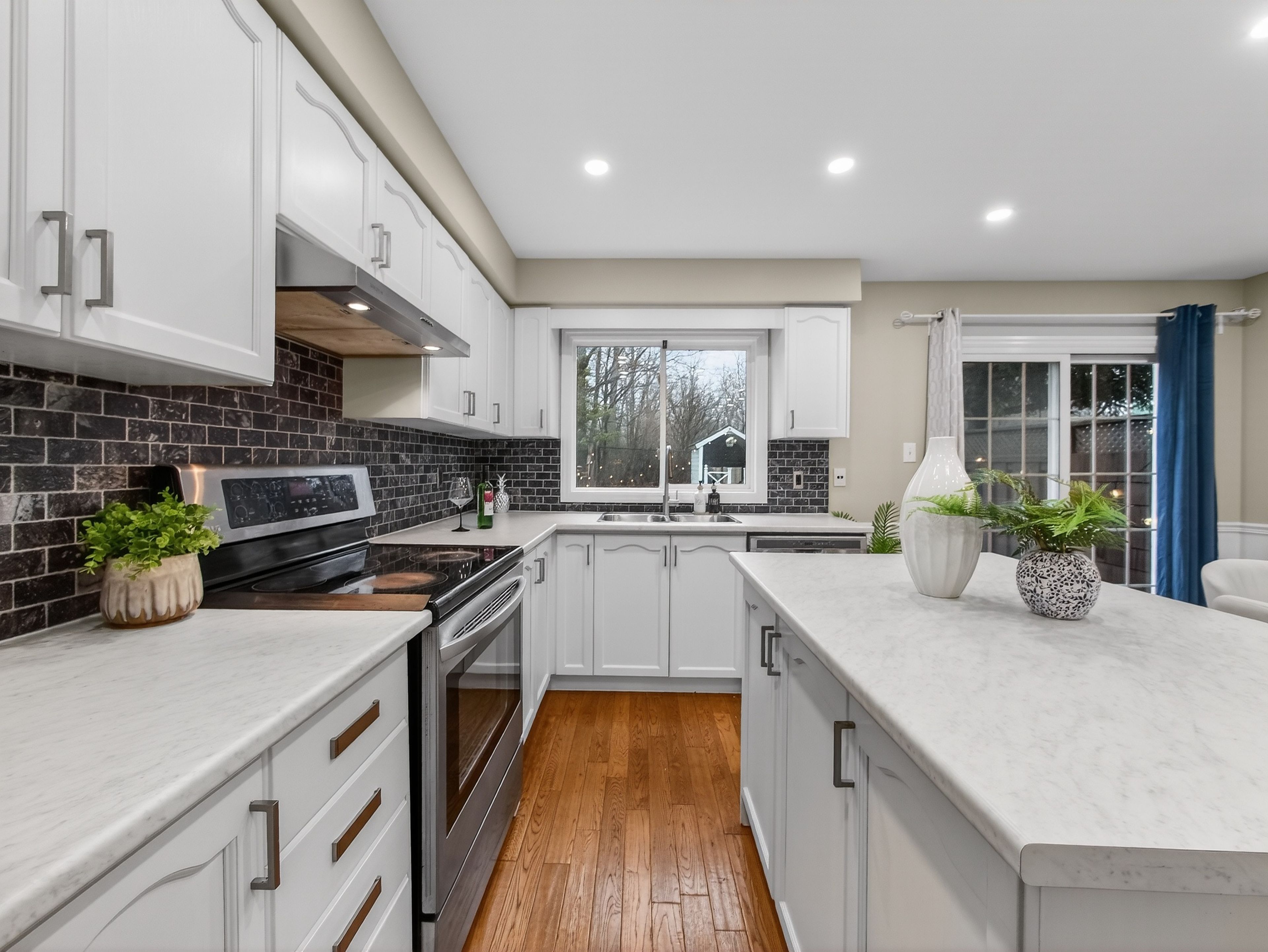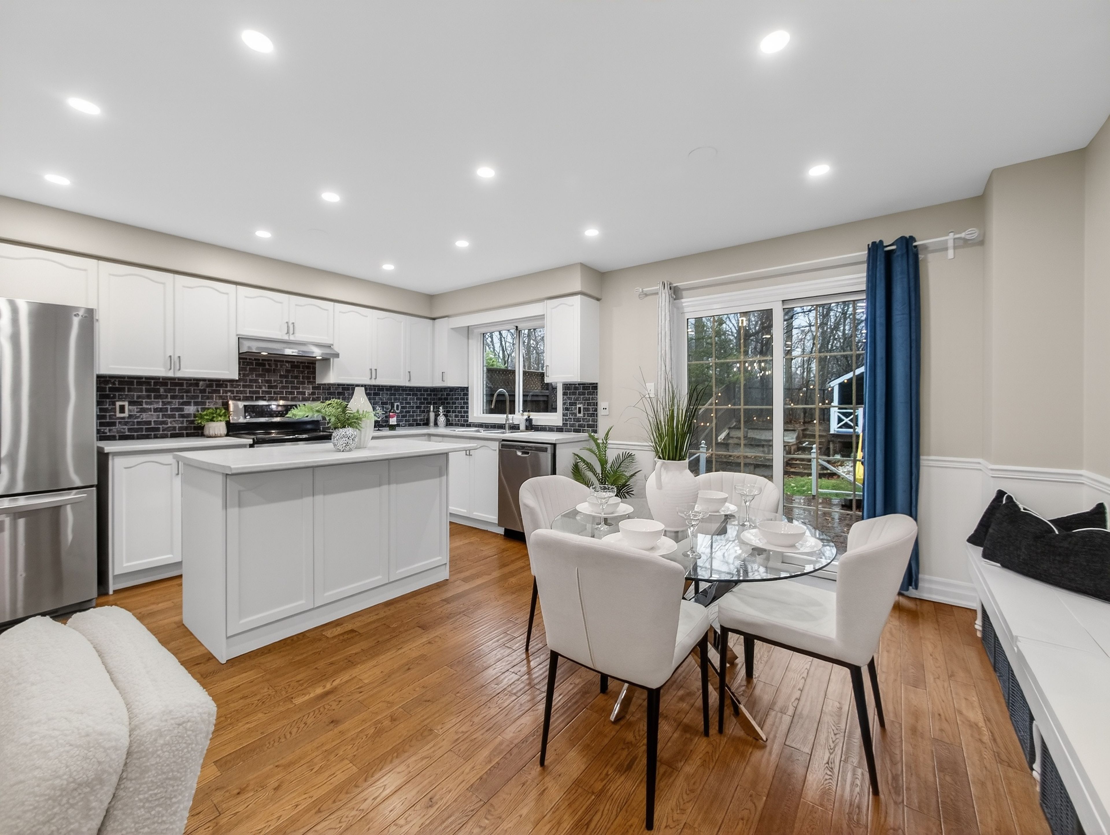 • Updated eat-in kitchen features stainless steel appliances and modern finishes.