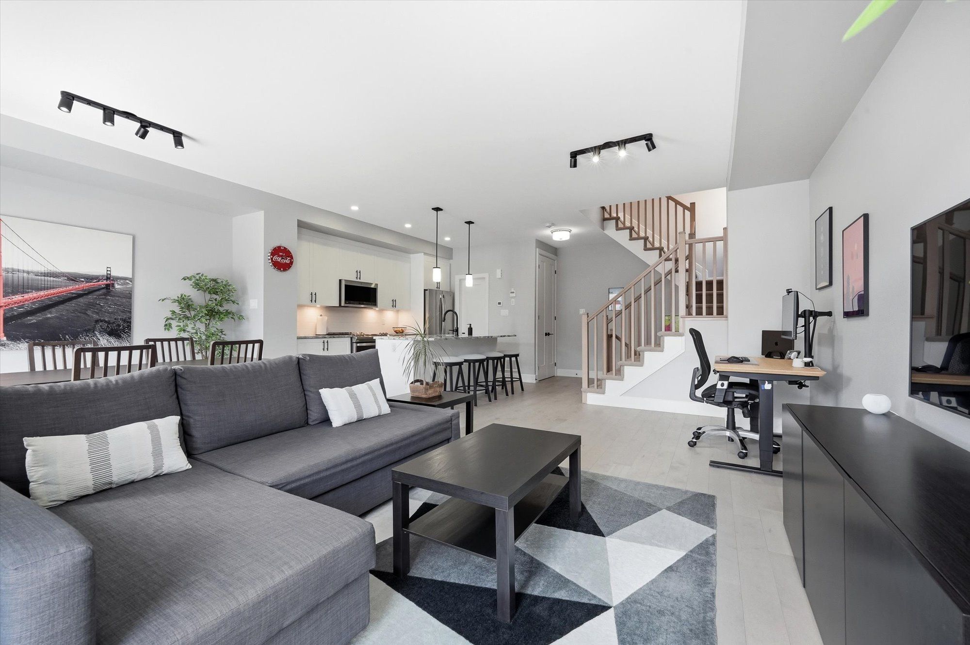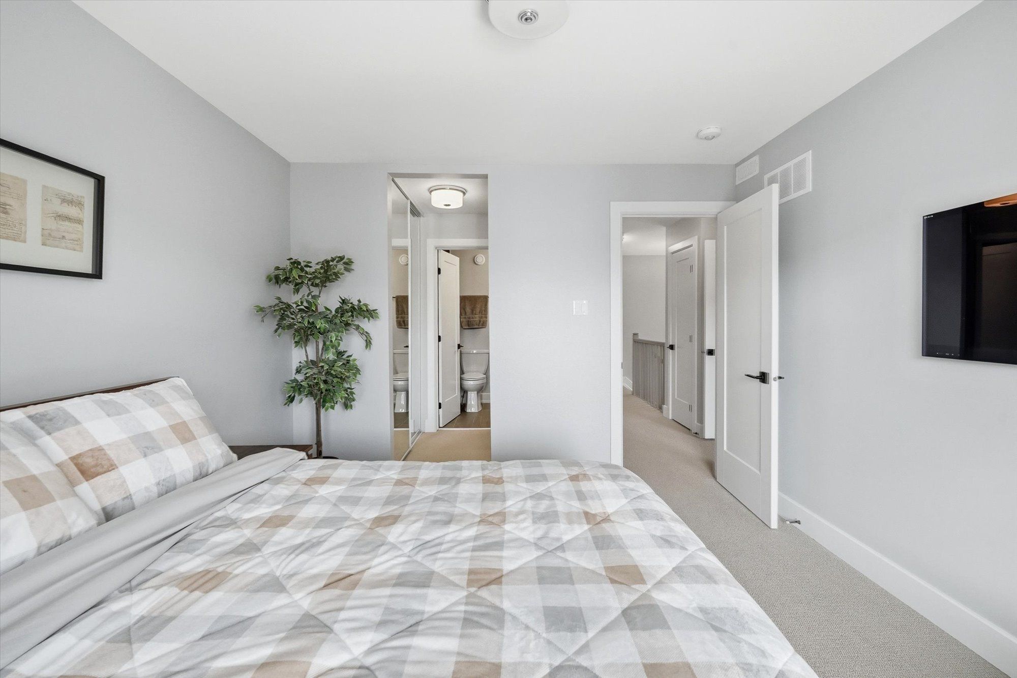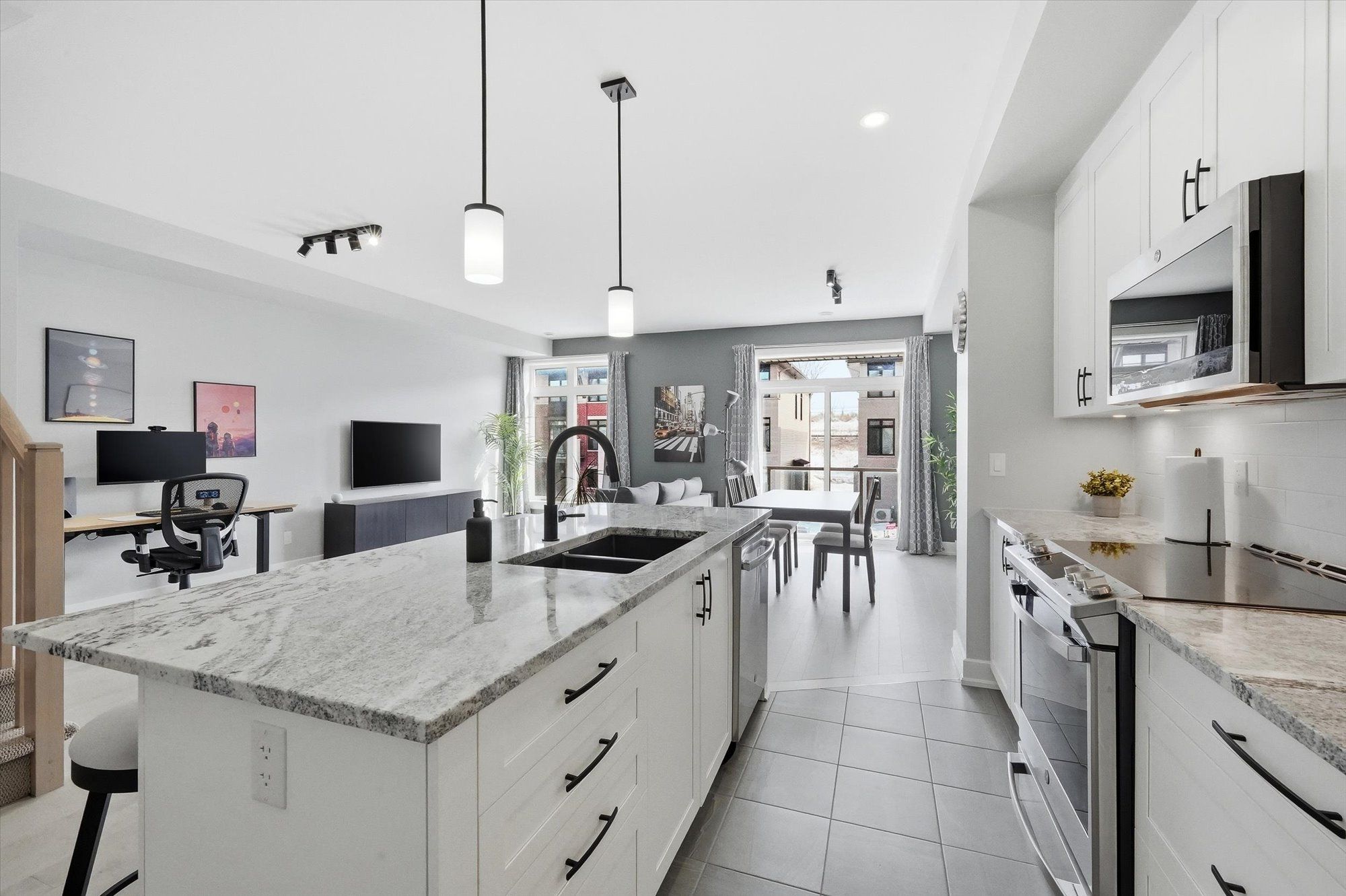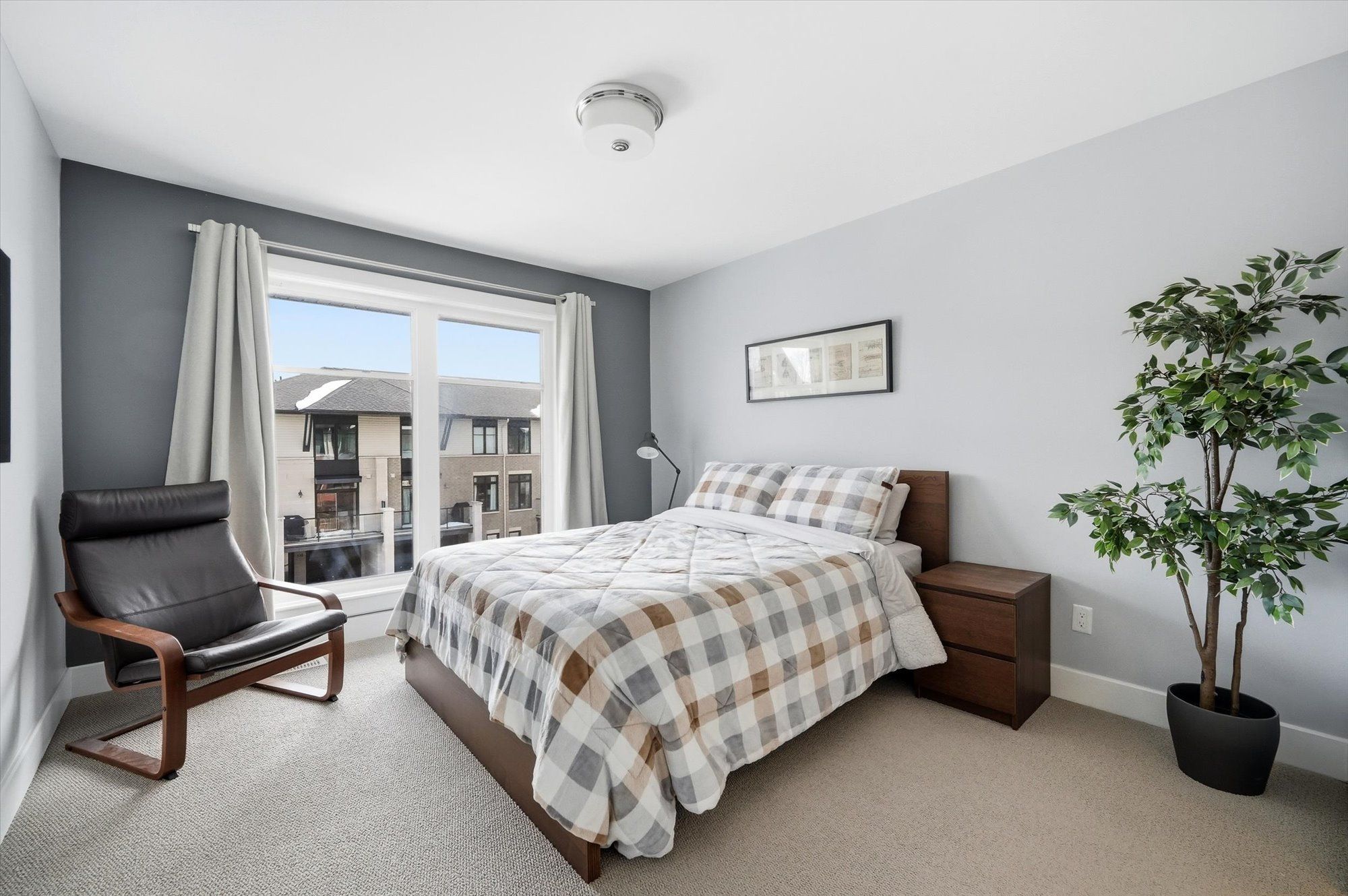 Welcome to this beautifully designed tamarack ashton - a end-unit freehold townhome offering 2 bedrooms, 3 bathrooms and a basement, this stylish home blends modern finishes with a practical layout ideal for everyday living. Arrive to a private driveway with space for two vehicles before stepping inside to the inviting main level featuring 12" x 24" tile flooring, inside access to the garage, and a sleek powder room. Head up to the second level where the bright open-concept living space unfolds with gleaming maple hardwood flooring throughout. The stunning kitchen is both functional and eye-catching, showcasing white shaker cabinetry, granite countertops, stainless steel appliances, microwave hood fan, soft close cabinets & drawers, under cabinet lighting, a walk-in pantry, and a spacious island with seating. The kitchen flows seamlessly into the dining and living areas, all illuminated by large patio doors that lead out to a private balcony and allow natural light to pour in. The upper level offers comfortable sleeping quarters including a spacious primary retreat complete with a generous closet and a stylish 3-piece ensuite with upgraded glass shower, granite counters and soft-close cabinet/drawer. A second well-proportioned bedroom, a full bathroom, and a convenient laundry room with additional storage complete this level, along with a large linen closet for added practicality. The basement provides excellent storage space. Set on a quiet street in a desirable neighbourhood, this home enjoys easy access to the highway, nearby lrt, and is just minutes from shopping, dining, parks and everyday amenities. A fantastic opportunity to own a modern, low-maintenance home in a prime location.
