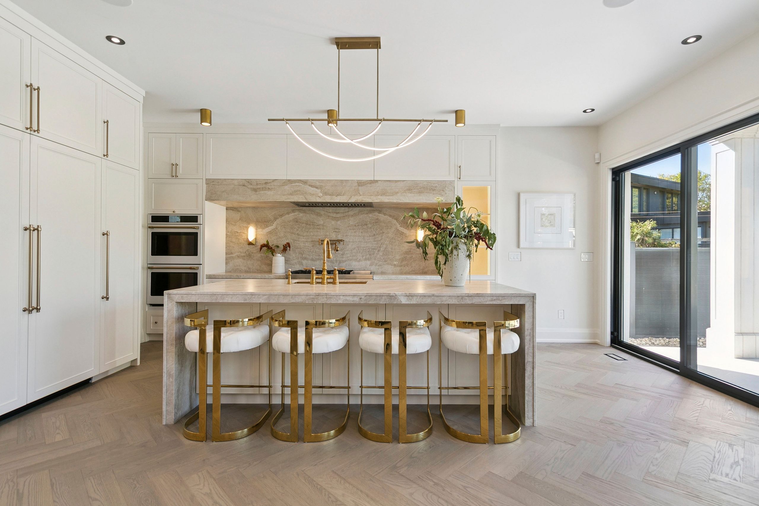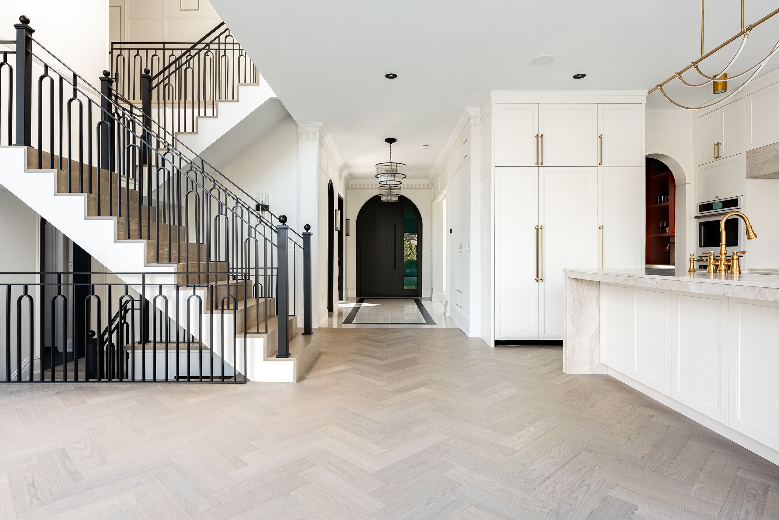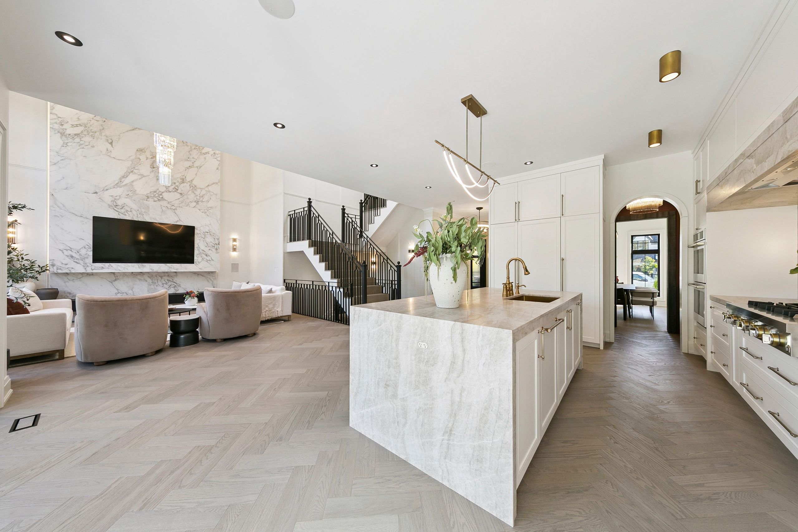 • Luxurious finishes throughout including custom cabinetry and hardwood herringbone flooring.