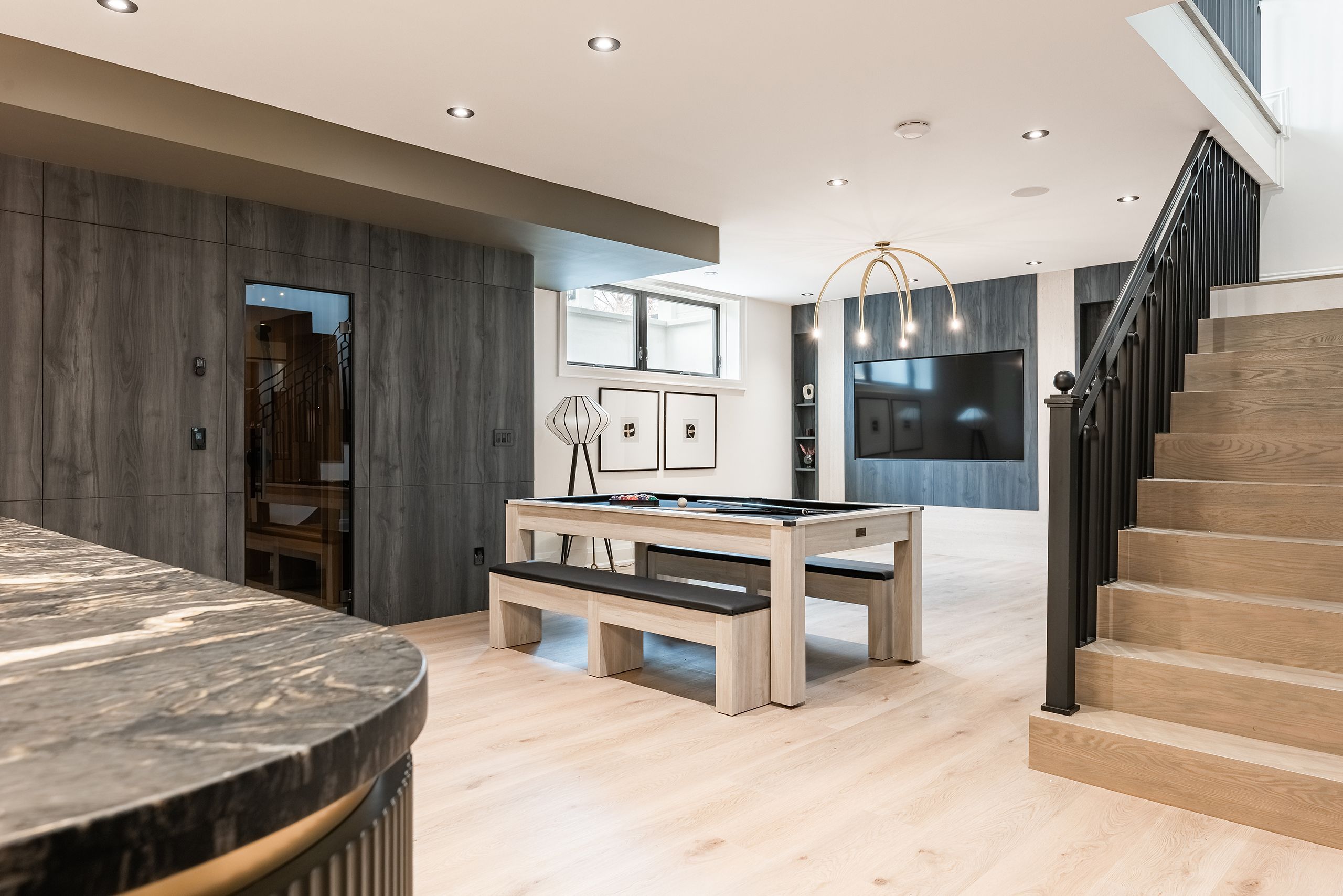 • Home gym, theatre, and rec room offer ample entertainment options.