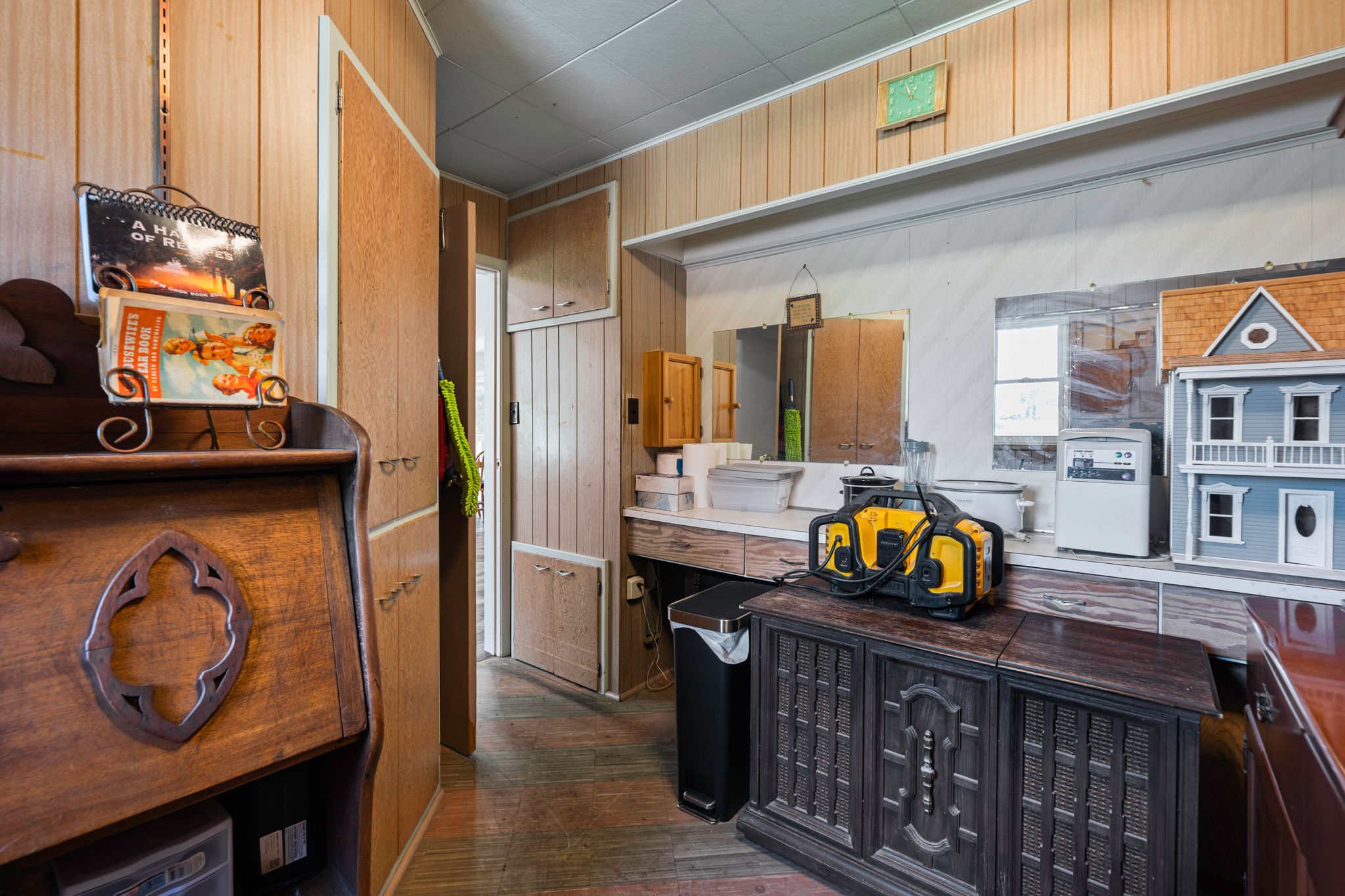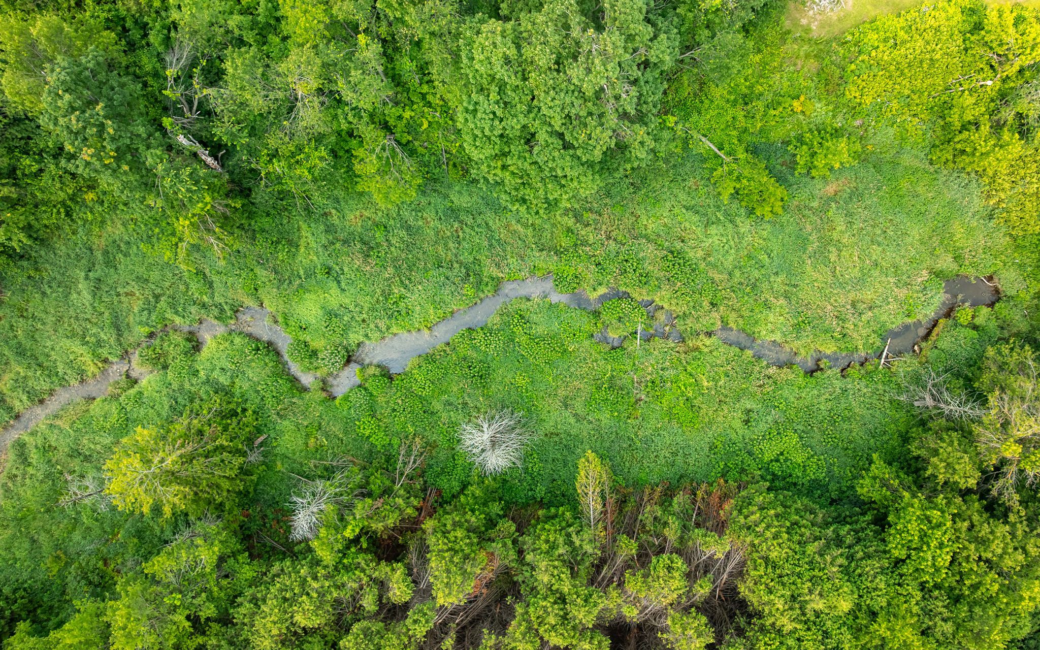 • Outdoor space includes a workshop, sitting areas, and a creek on the property.