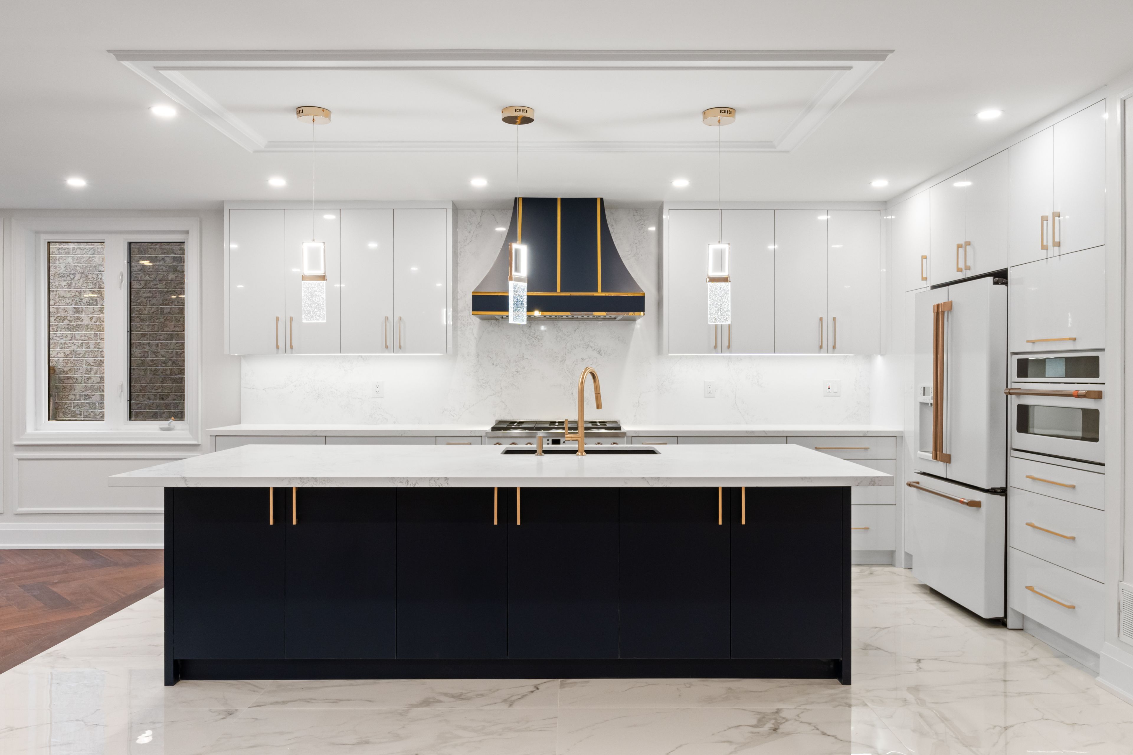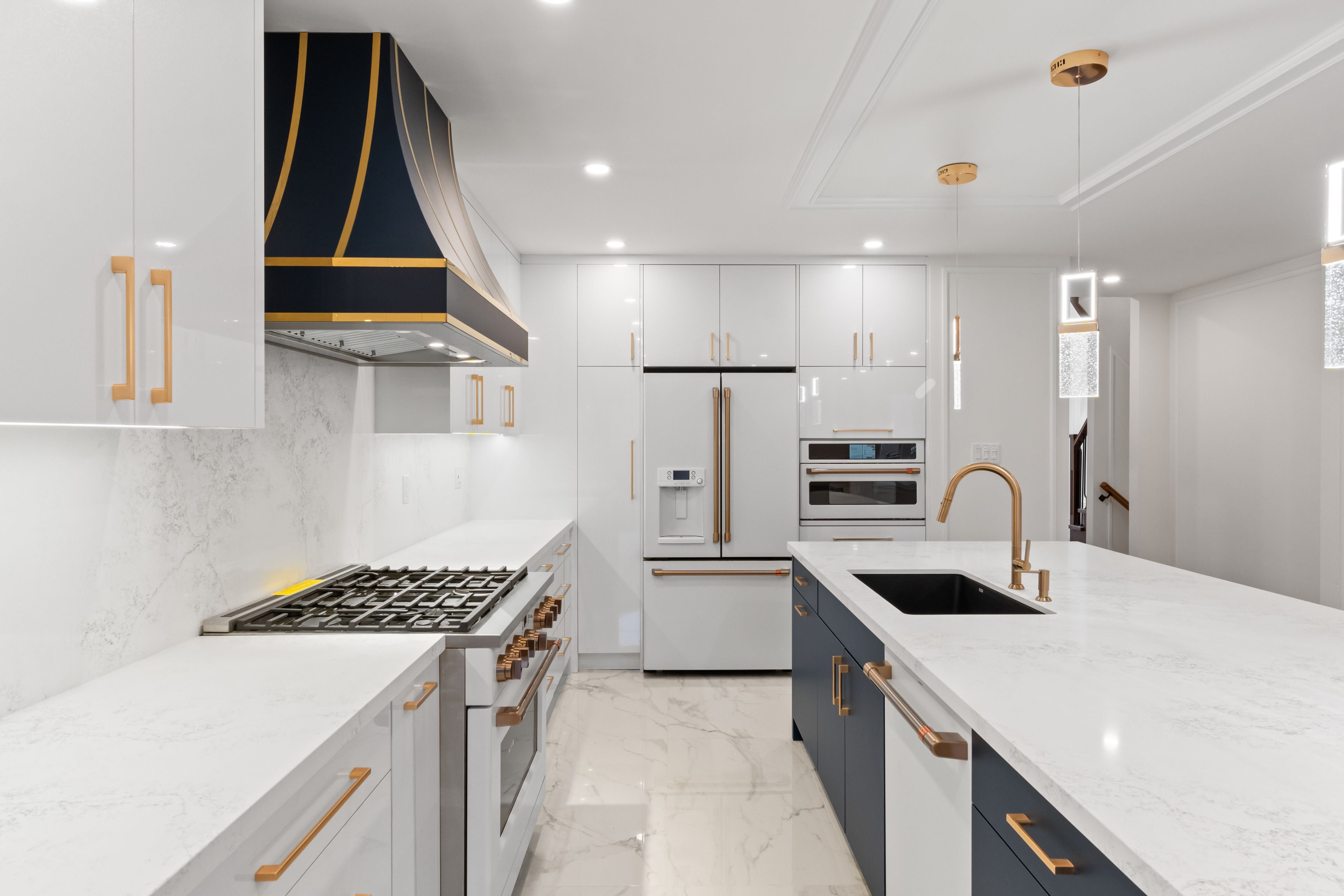 • Gourmet kitchen featuring top appliances, quartz countertops, and large centre island.