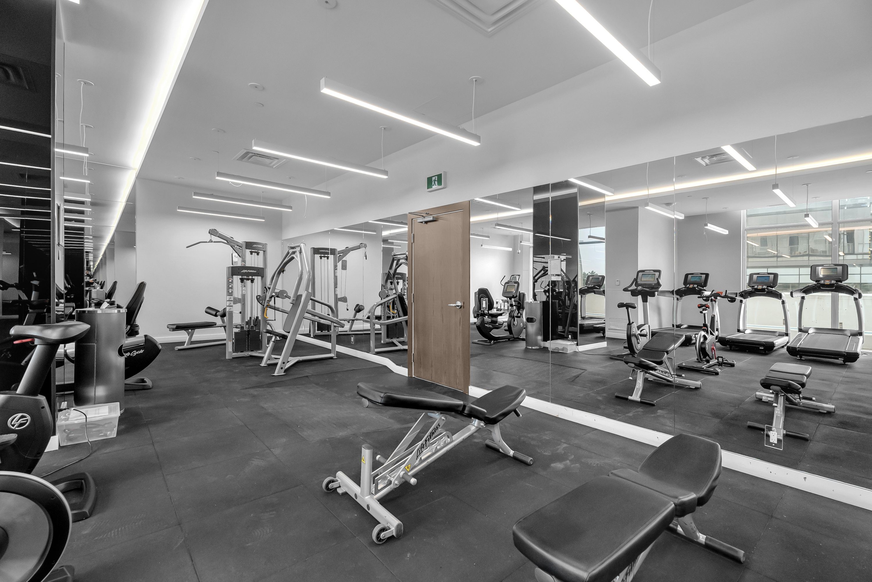 • Building amenities include fitness center, lounge, steam room, and outdoor terrace.