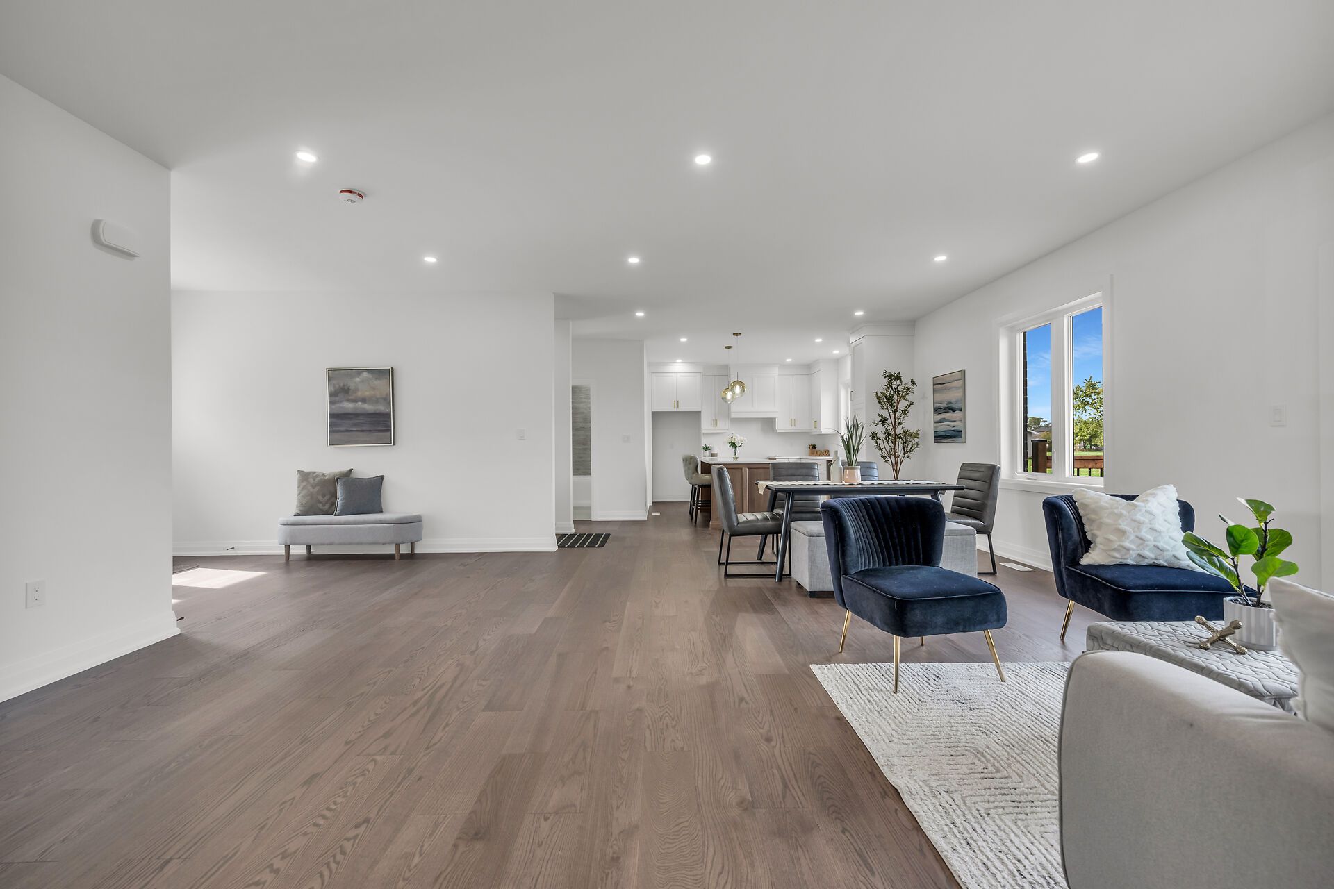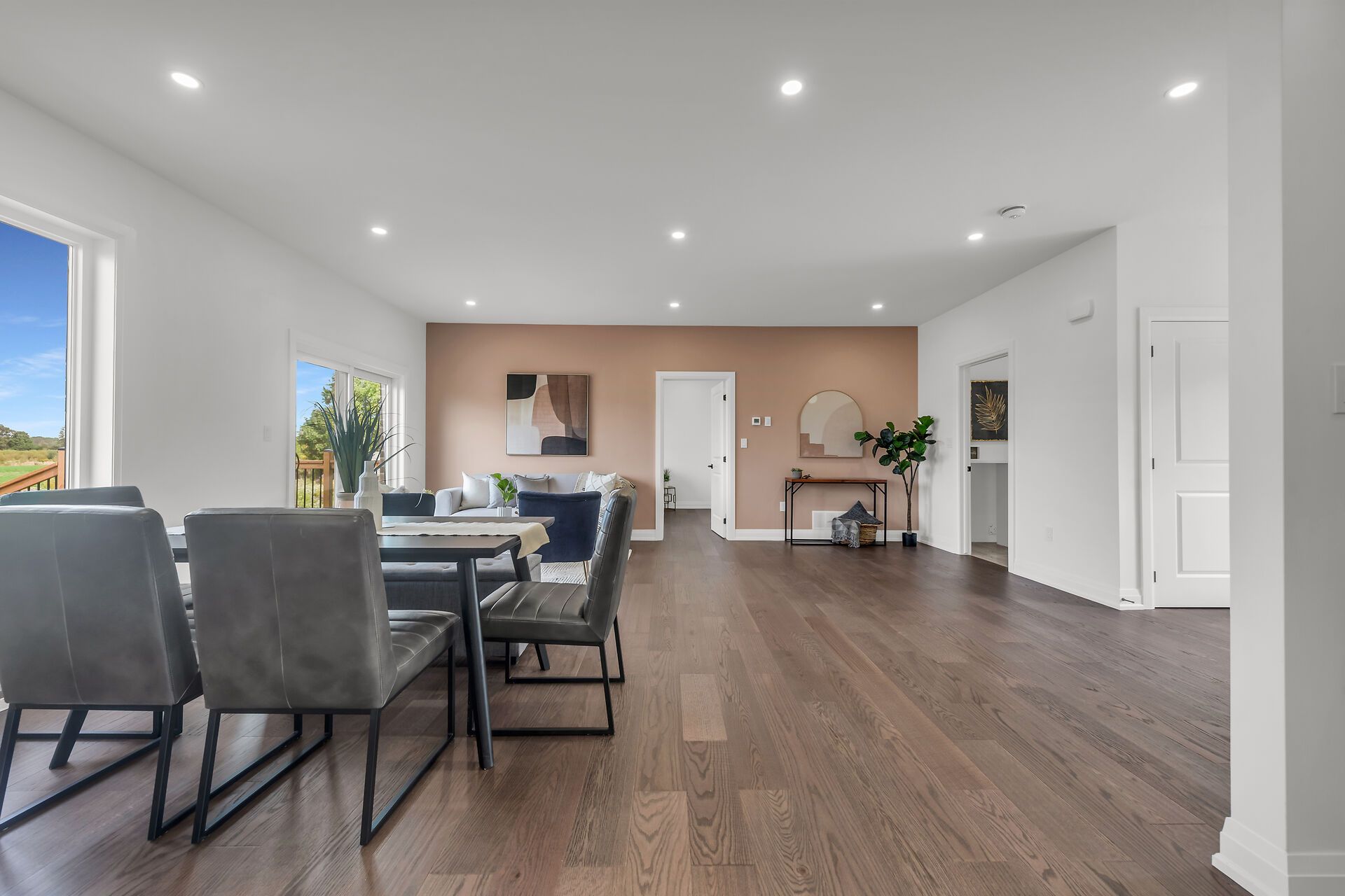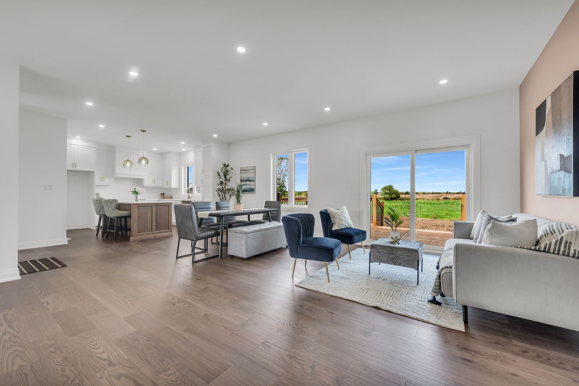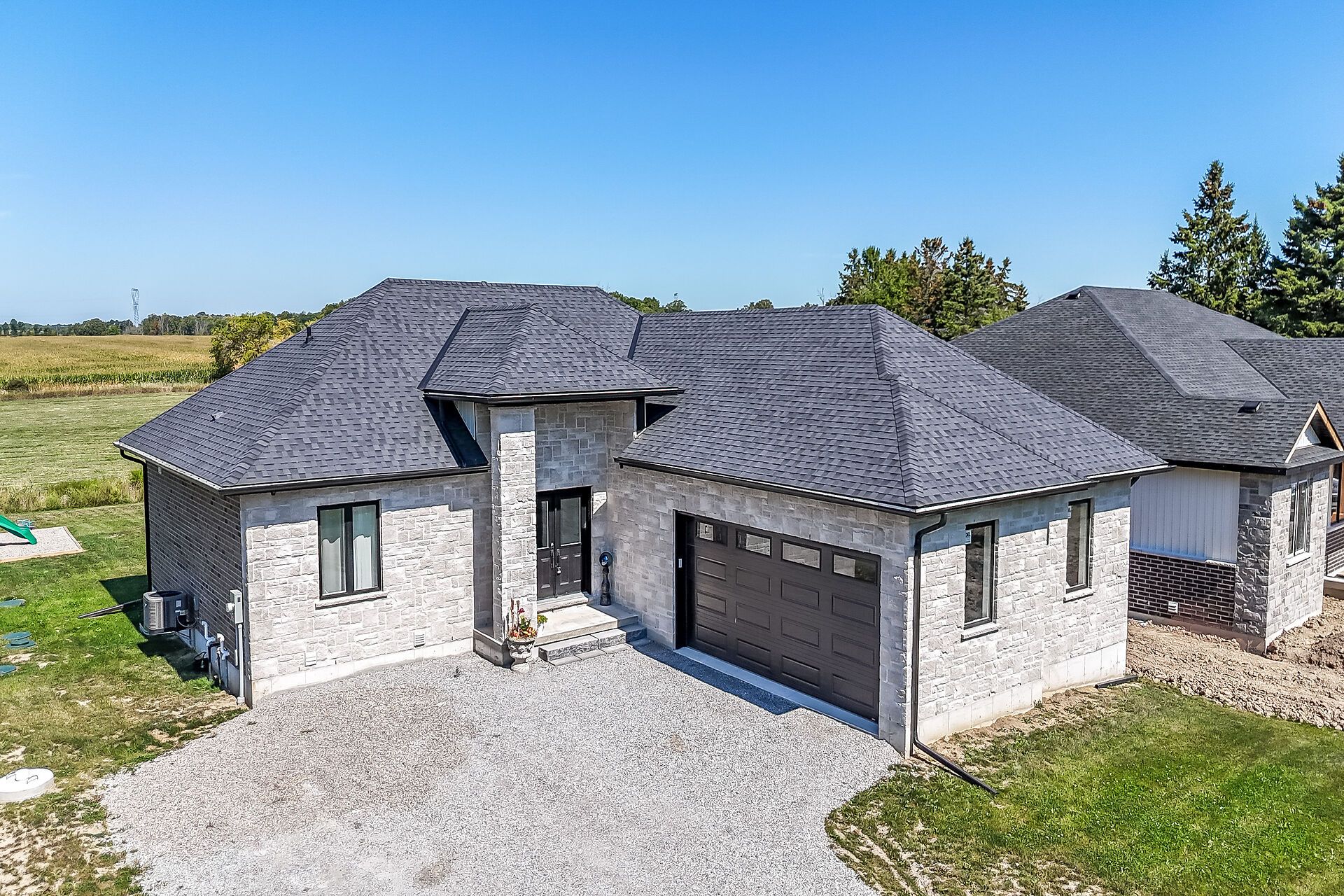 Stunning, exquisitely finished 4 bedroom, 3 bathroom custom built bungalow by jcm custom homes located in quiet hamlet of springvale situated on picturesque 98 x 200 lot with calming country views. Incredible curb appeal with all stone & brick exterior, welcoming covered porch, attached double garage, & back deck with stairs leading to oversized backyard. The masterfully designed interior layout features 2,956 sq ft of distinguished living area highlighted by 9 ft ceilings & stunning hardwood flooring throughout, designer vanderscaff kitchen cabinetry with quartz countertops, dining area, family room, spacious primary bedroom with oversized wi closet, & chic ensuite including walk in glass shower, additional mf bedroom & 4 pc bath, laundry area with quartz, & premium upgrades throughout including fixtures, lighting, decor, & more. The fully finished basement includes 2 generous sized bedrooms, large rec room, & 3 pc bathroom.