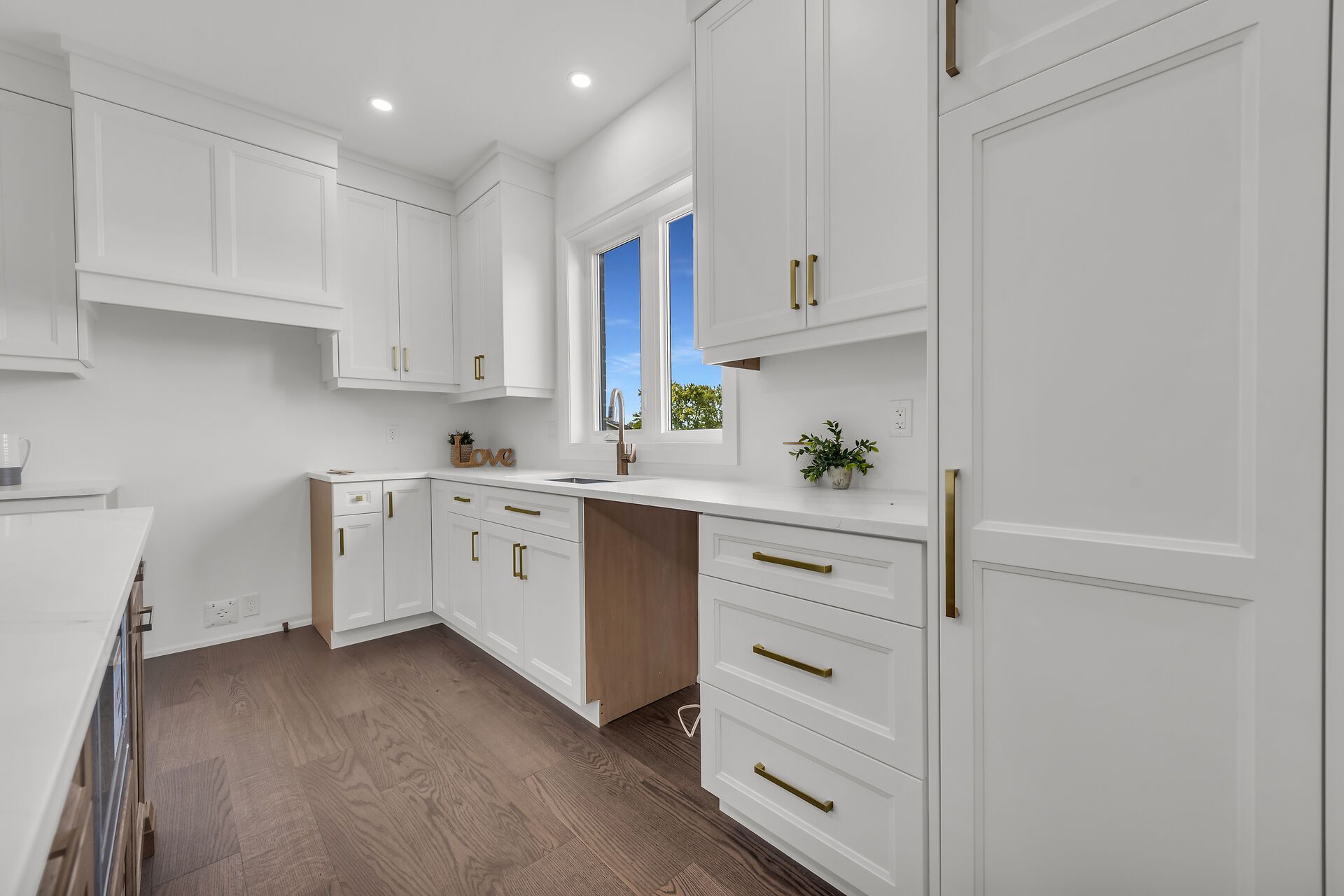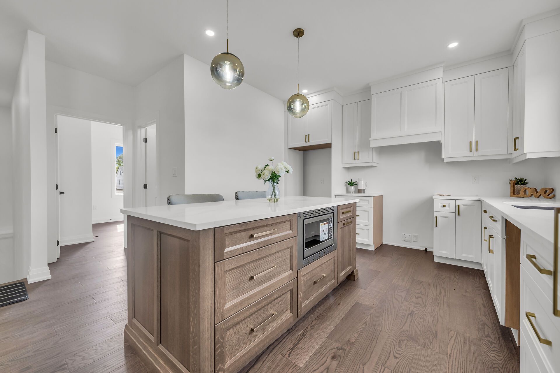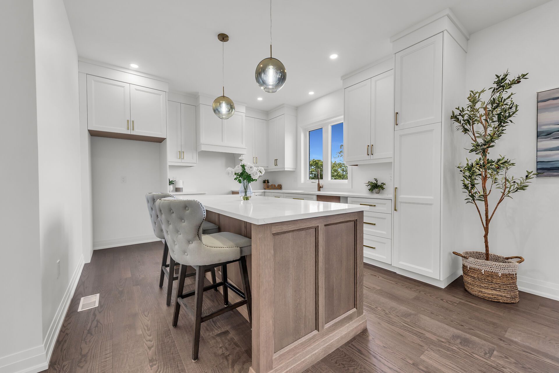 • Designer kitchen featuring quartz countertops and modern cabinetry.