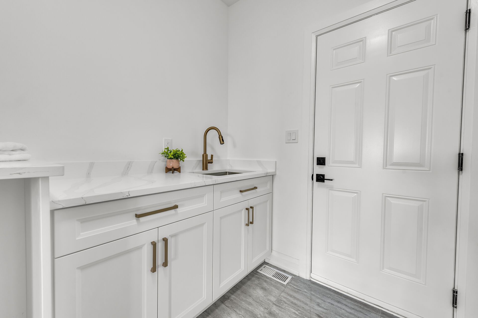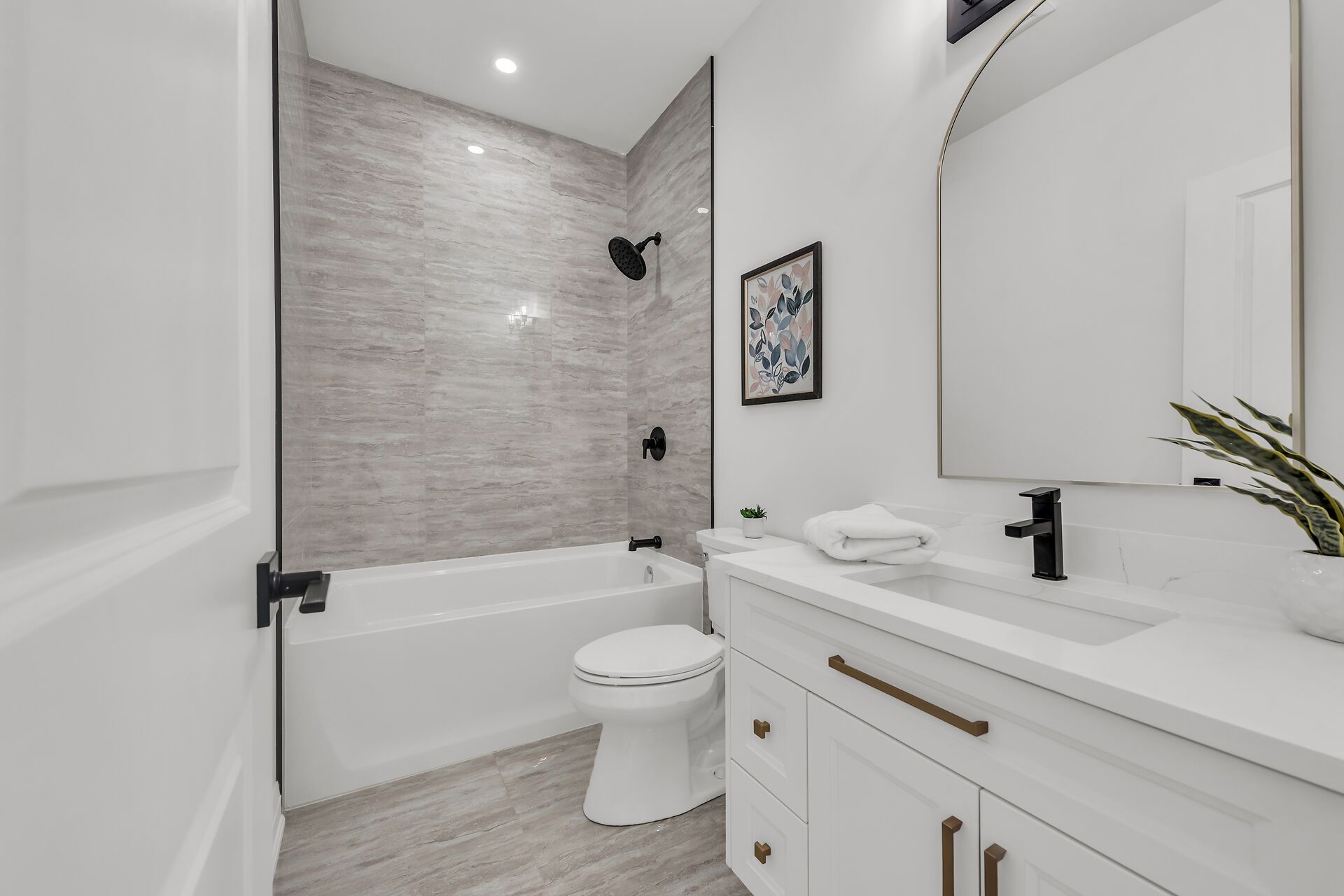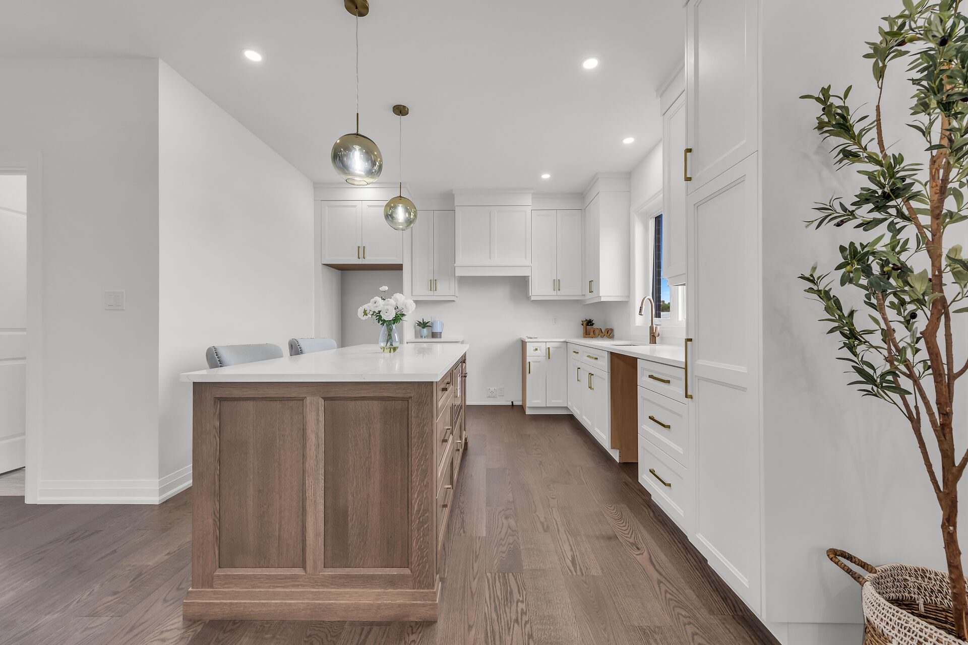 • Designer kitchen featuring quartz countertops and modern cabinetry.
