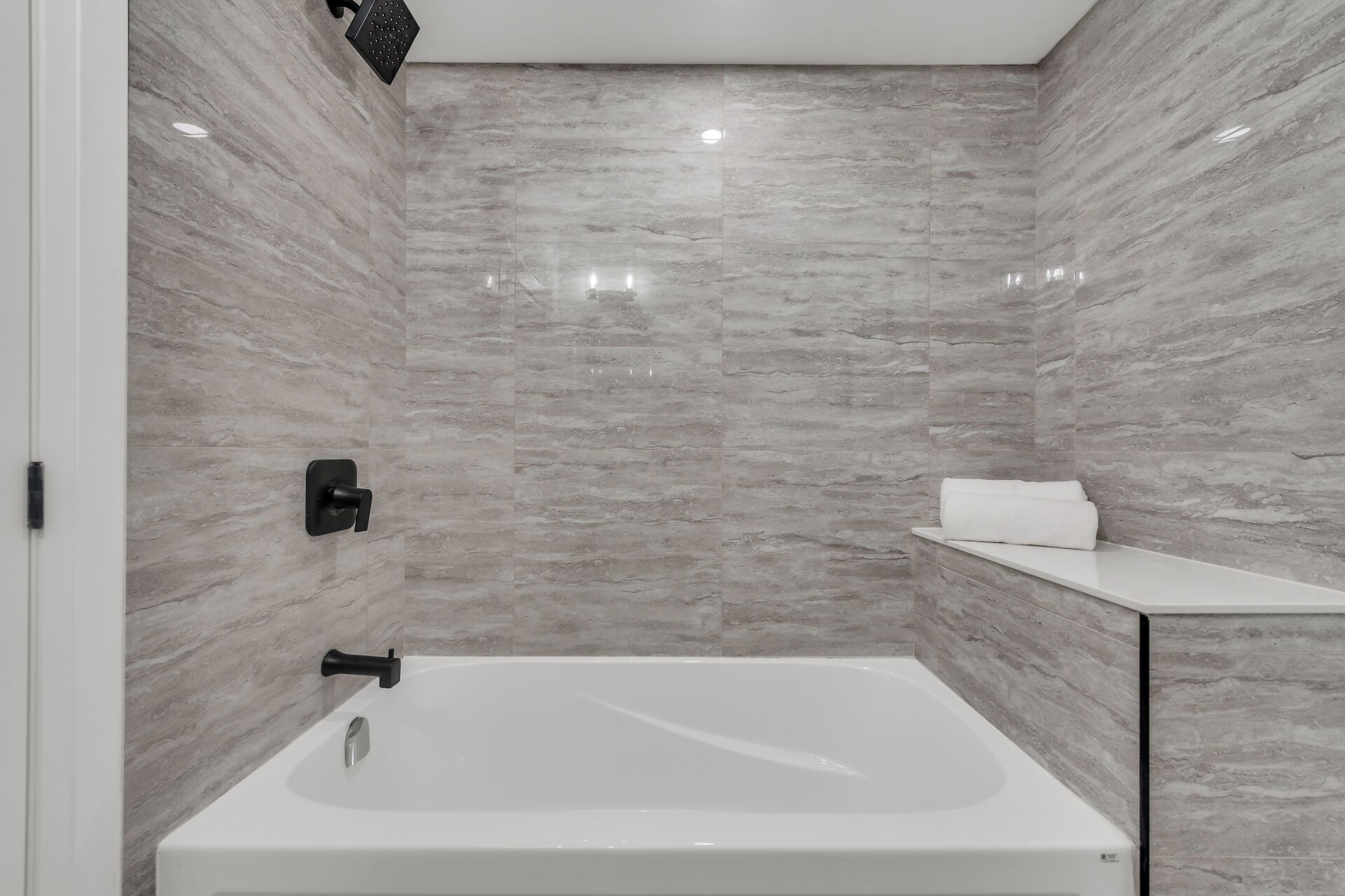 • Stylish stone and brick exterior with a welcoming covered porch.
