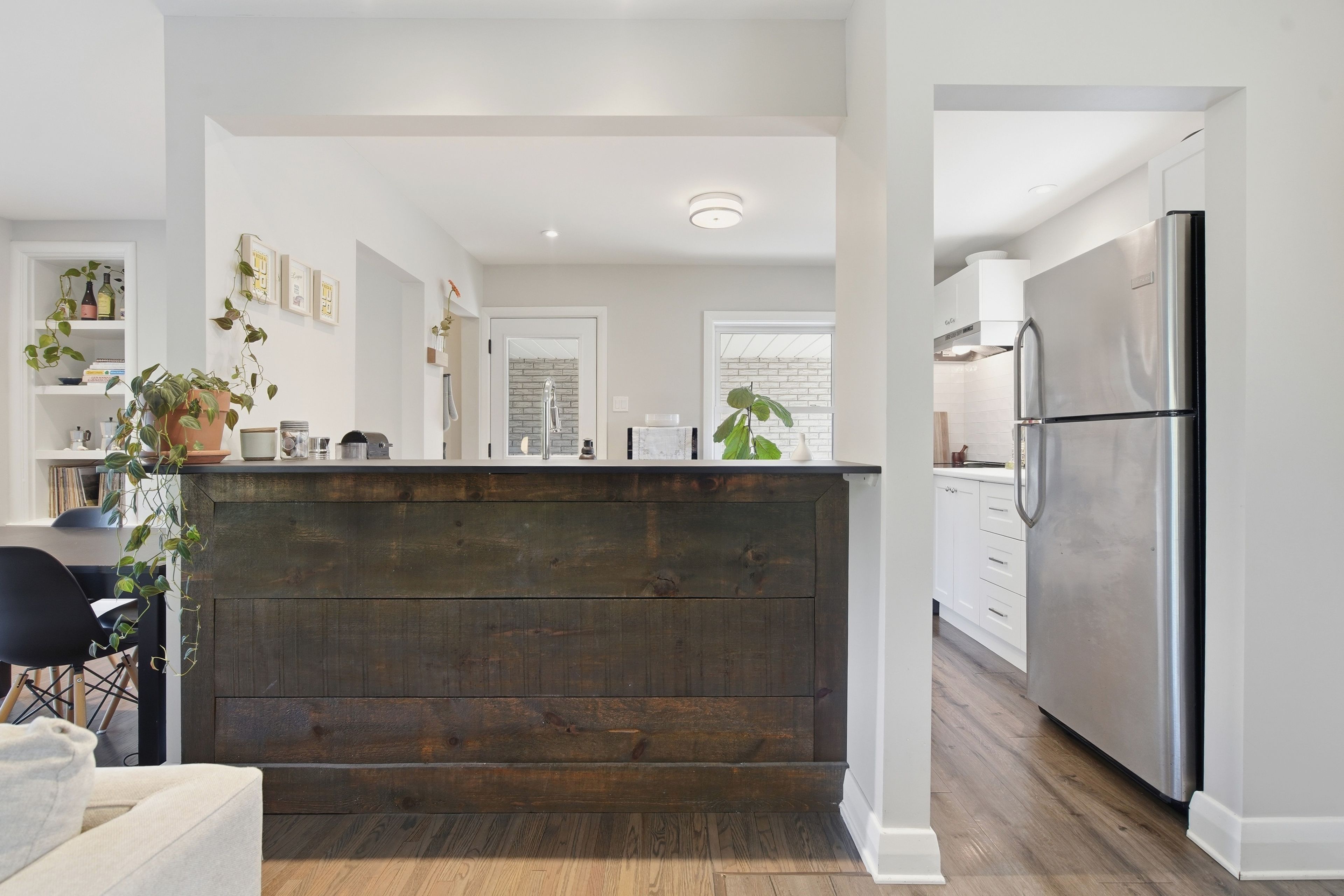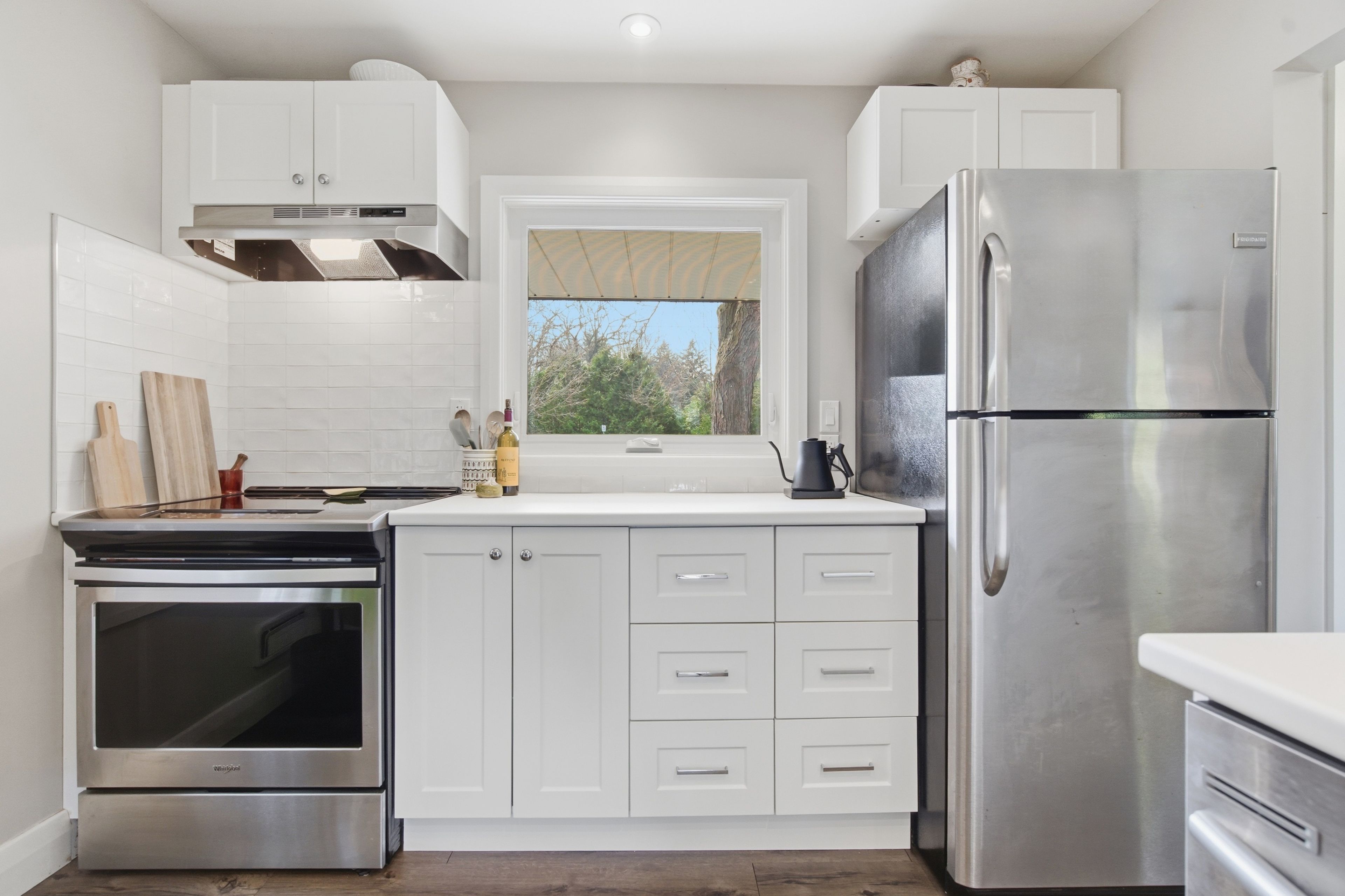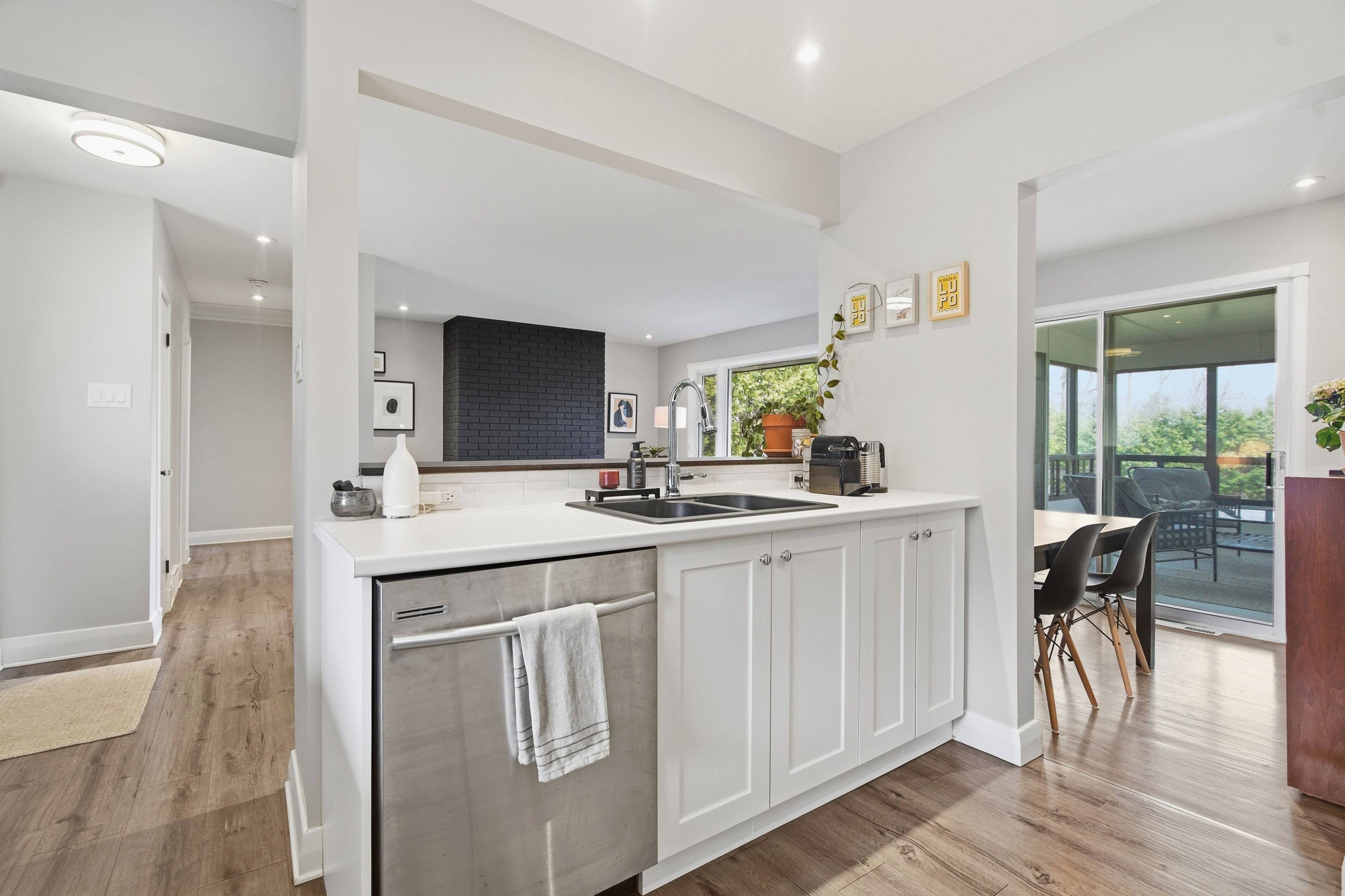 • Open kitchen with new cabinetry, breakfast bar, and modern appliances.