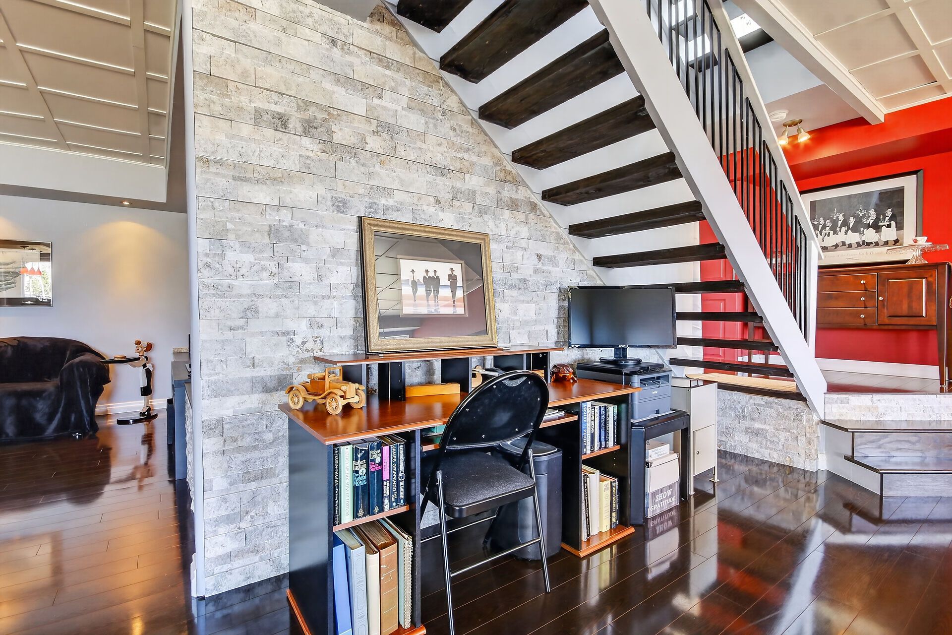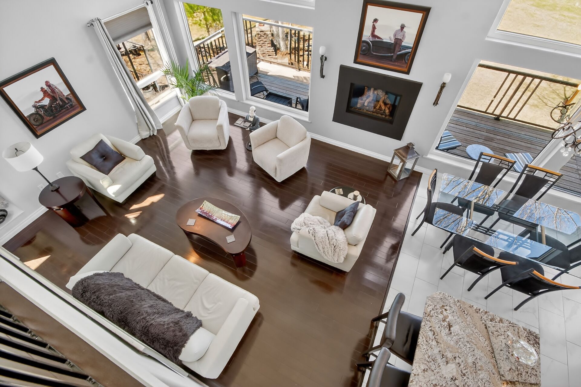 • Bright open-concept main level with 20-foot ceilings and propane fireplace.