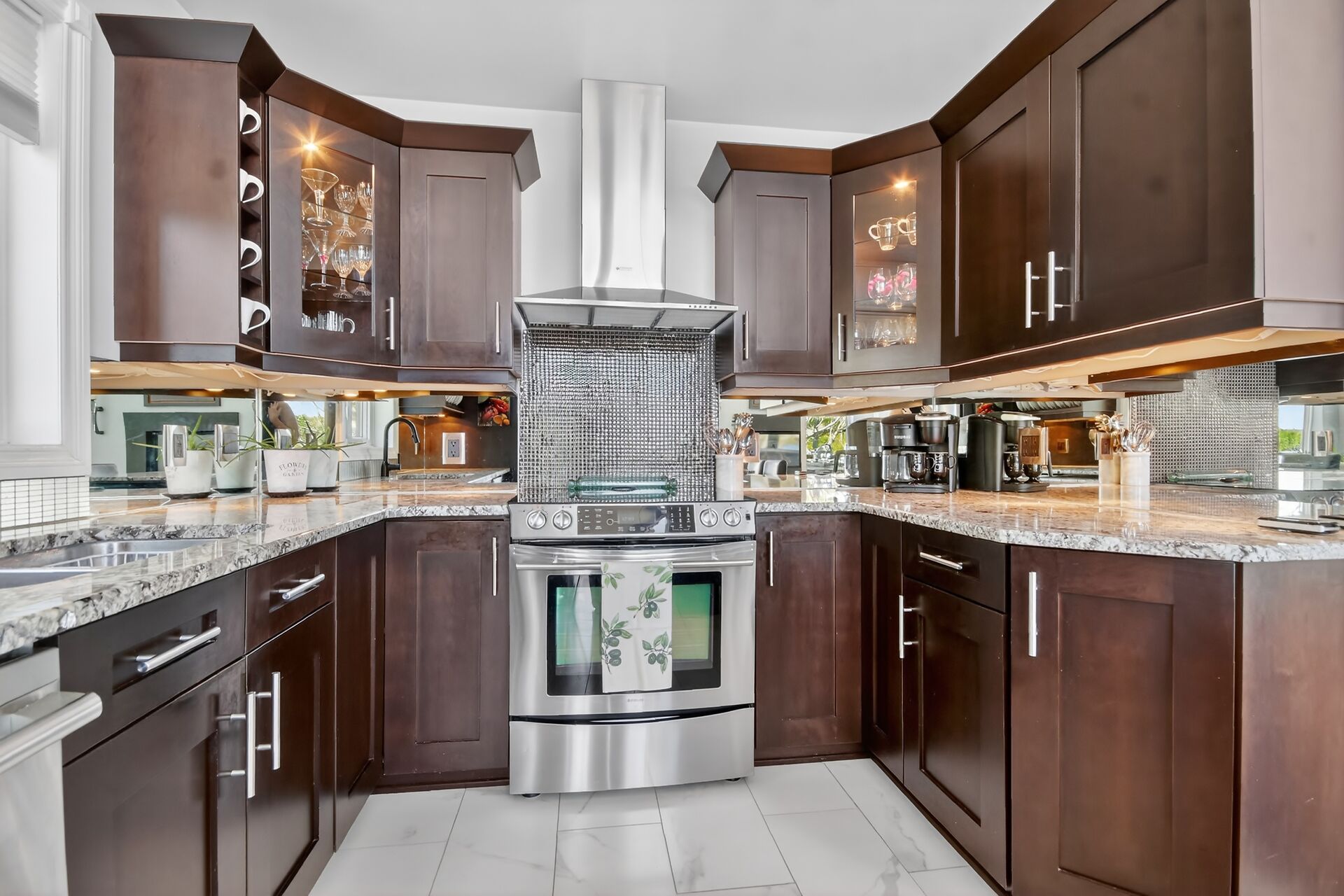• Modern kitchen featuring granite countertops and a central island for entertaining.