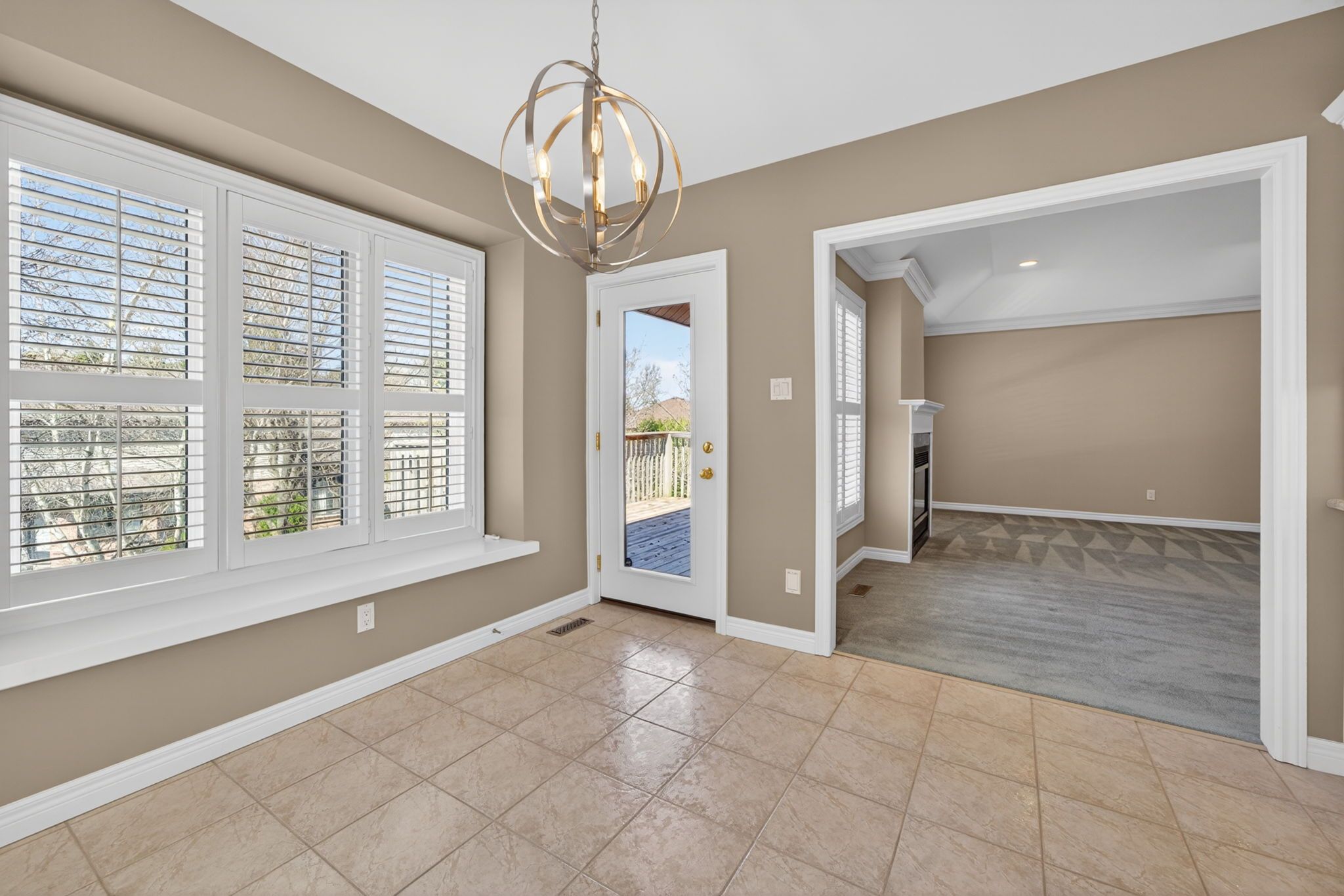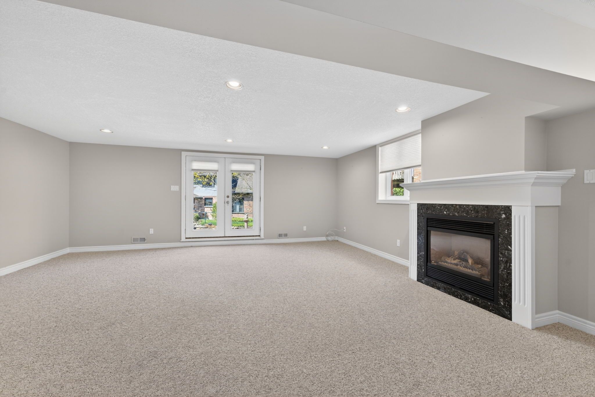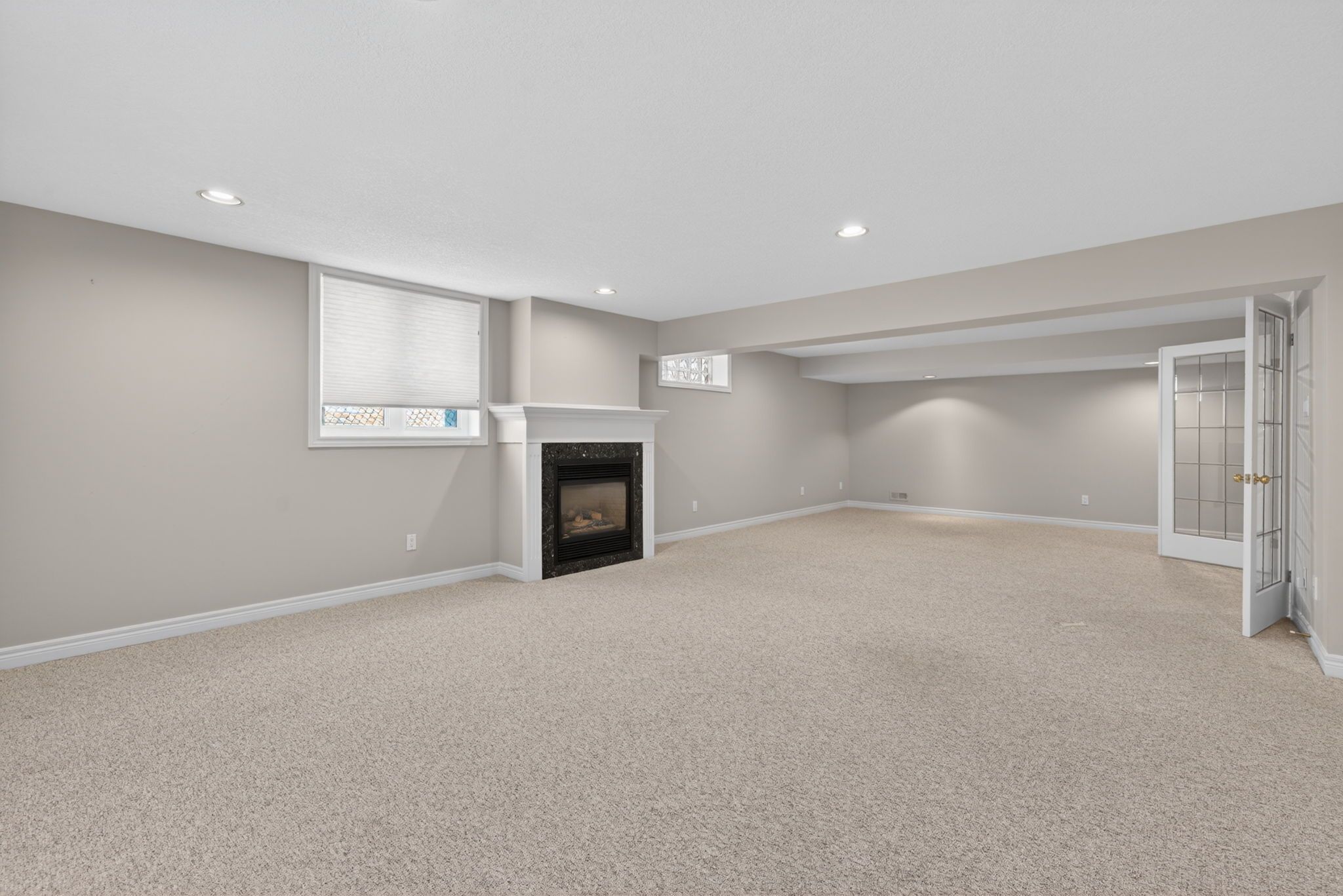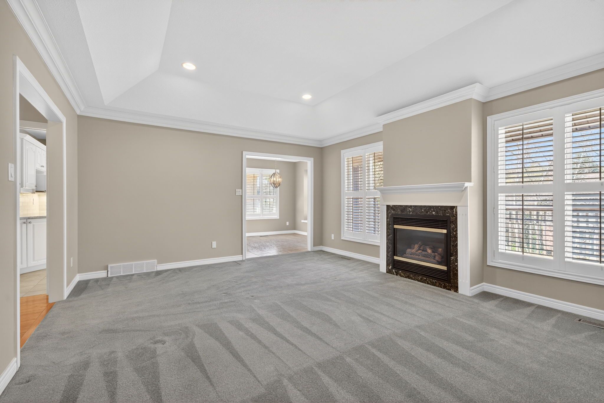 • Spacious family room features a gas fireplace and large windows.