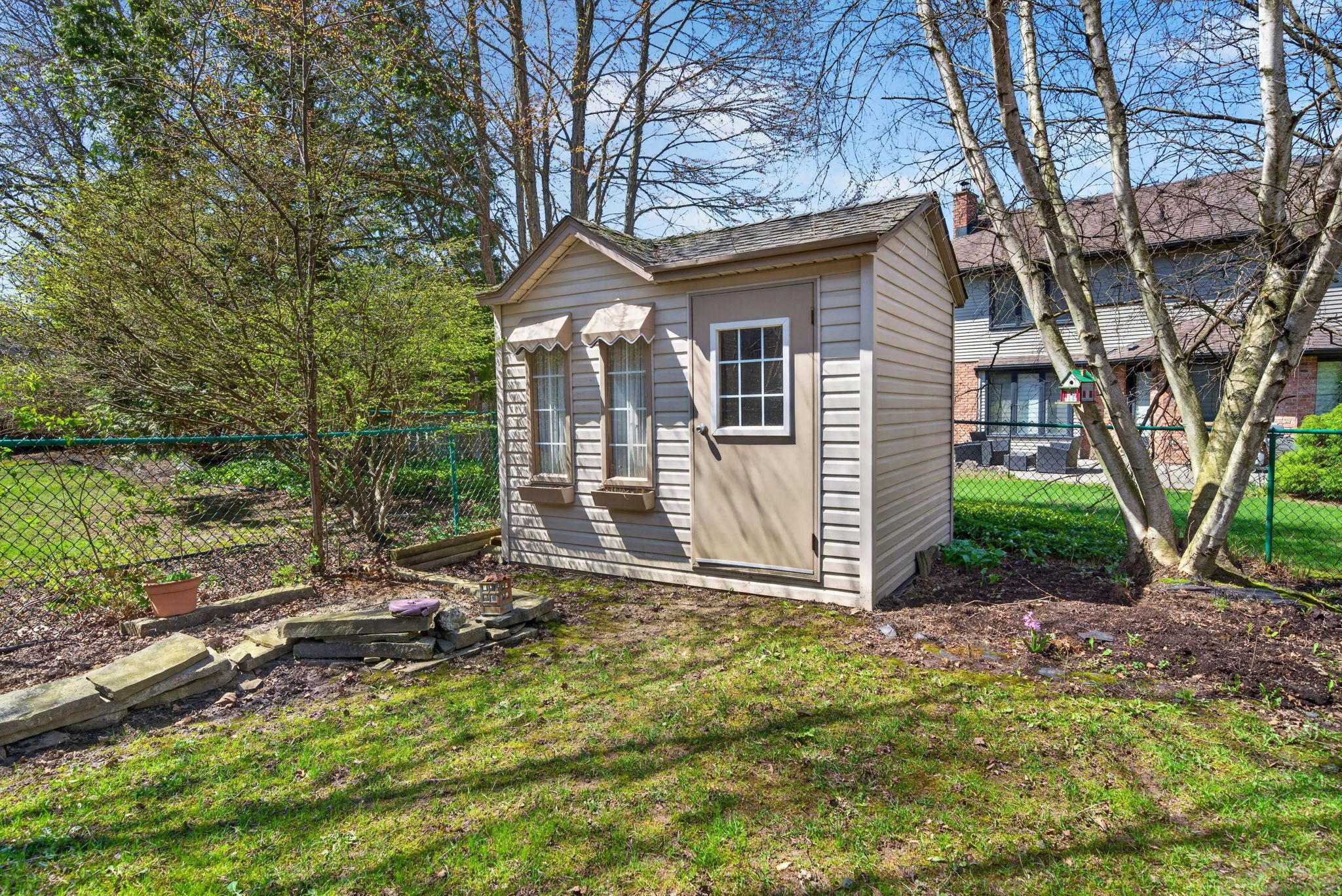 • Enjoy outdoor features like a pond, brick patio, and storage shed.