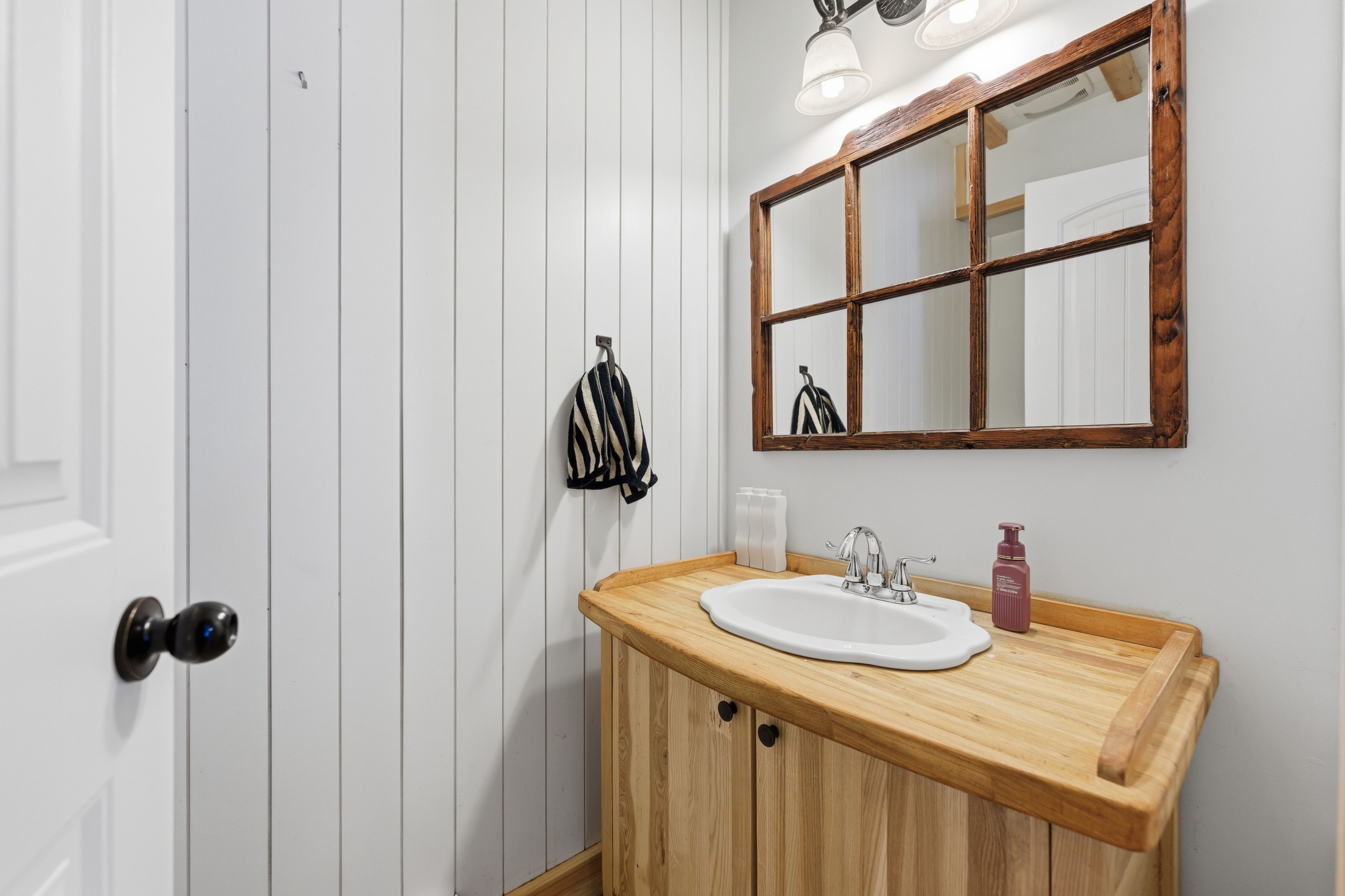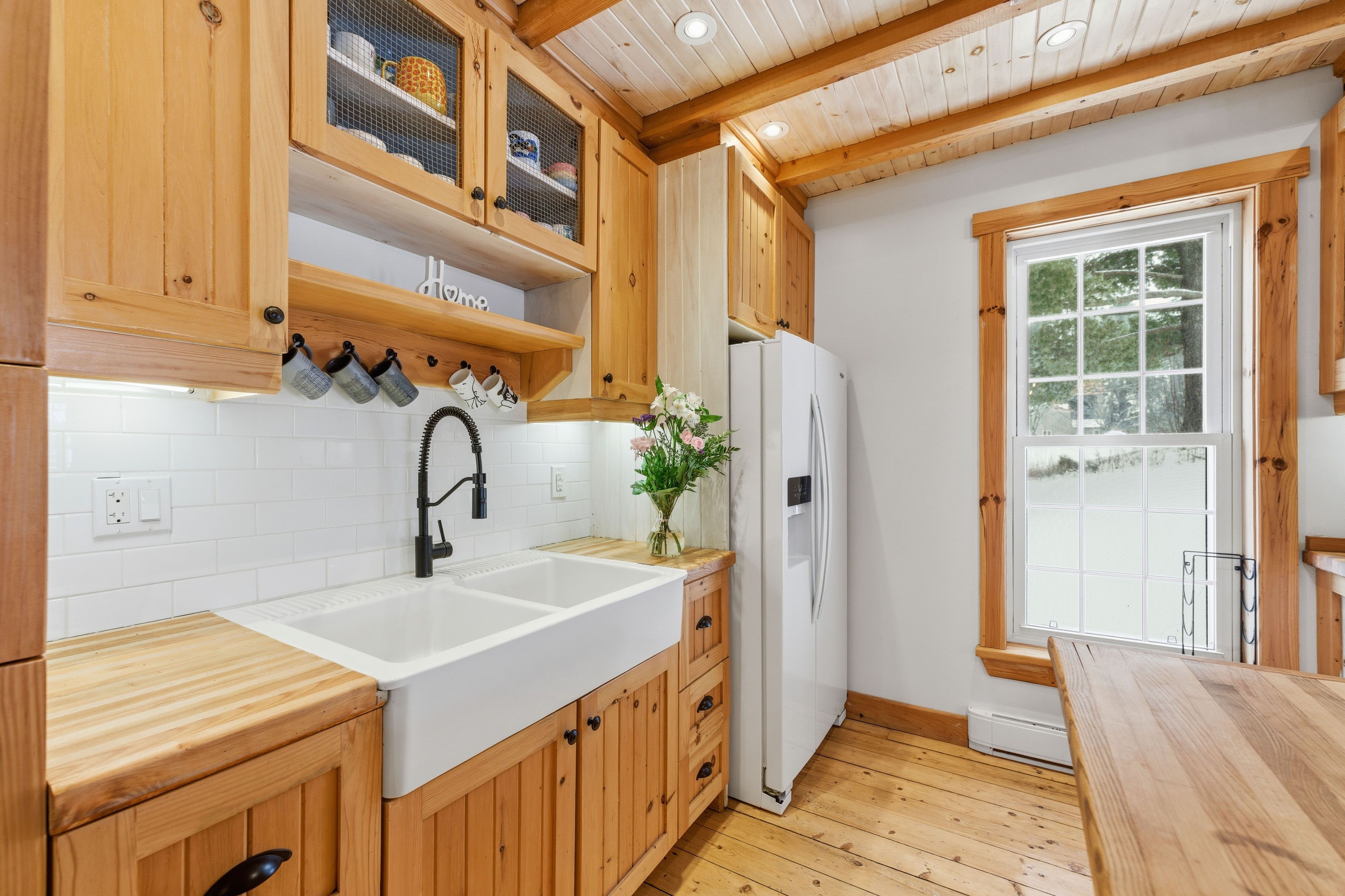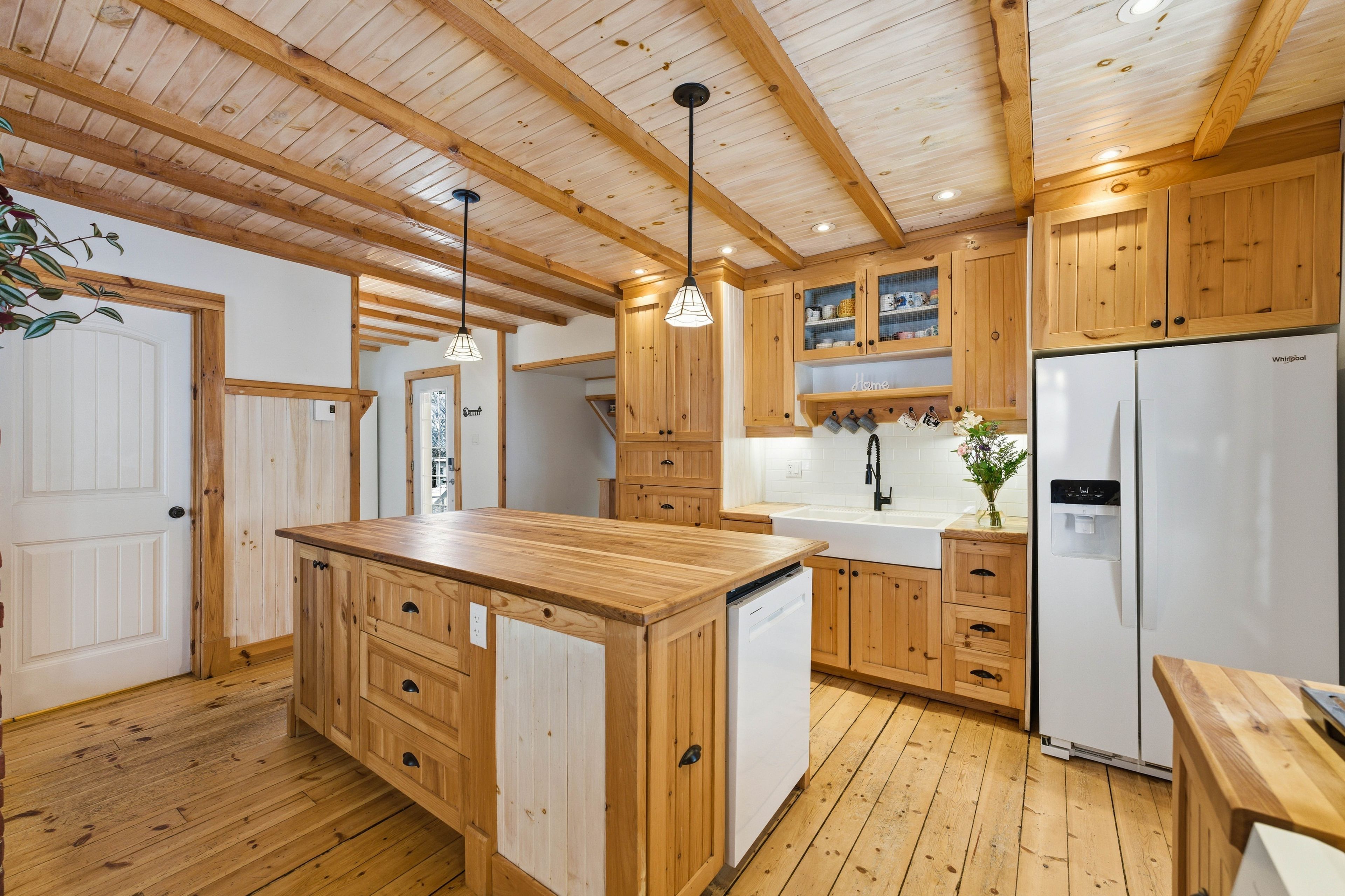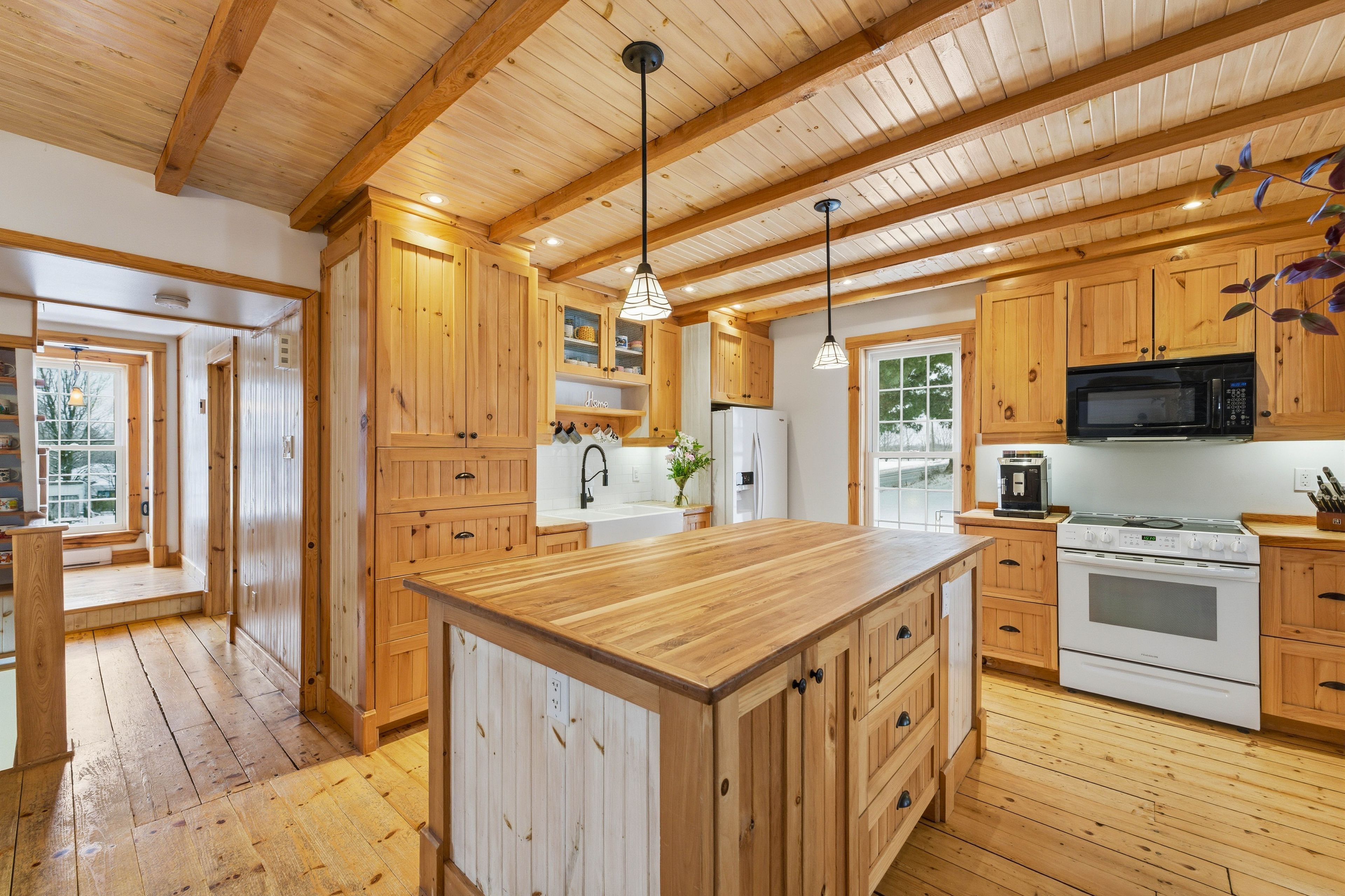 • Country-style kitchen with butcher-block island and farmhouse sink for cooking.