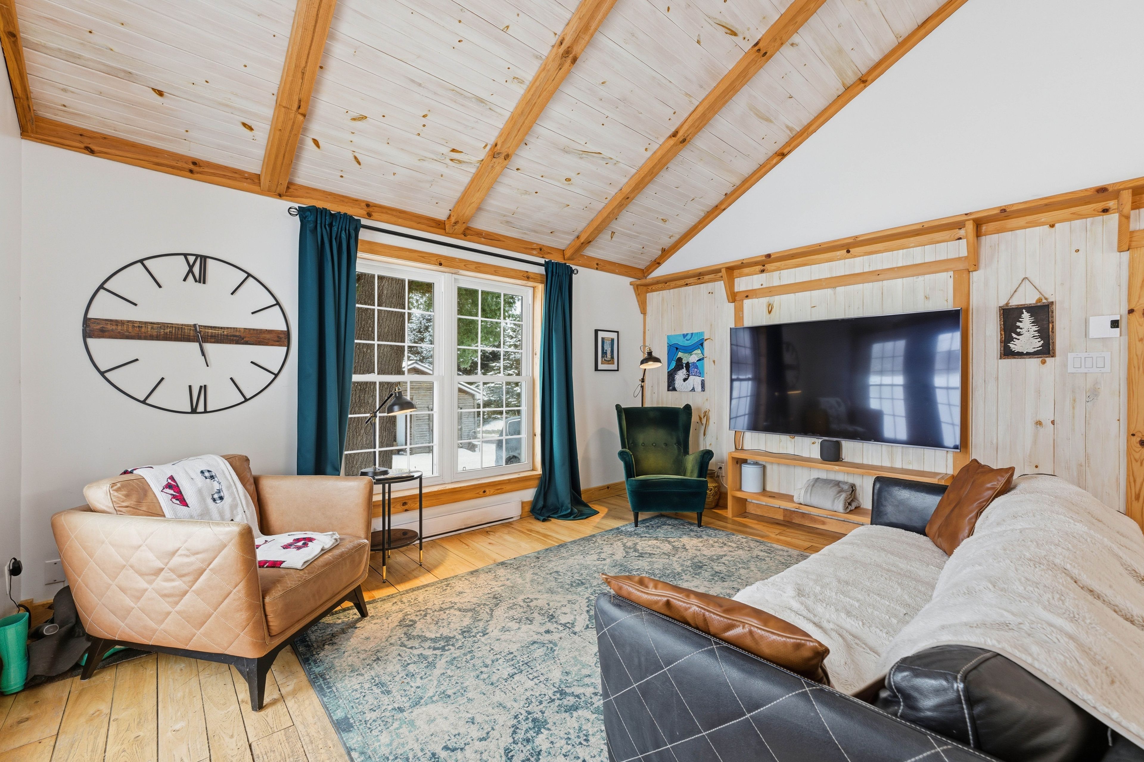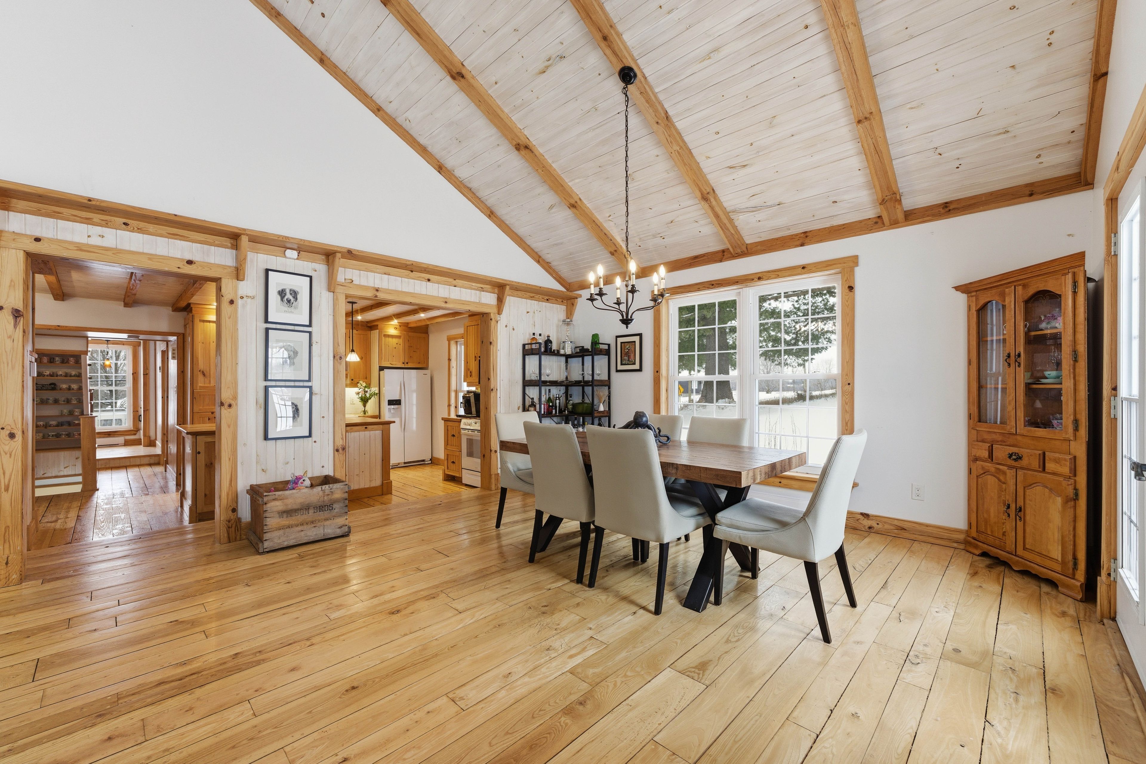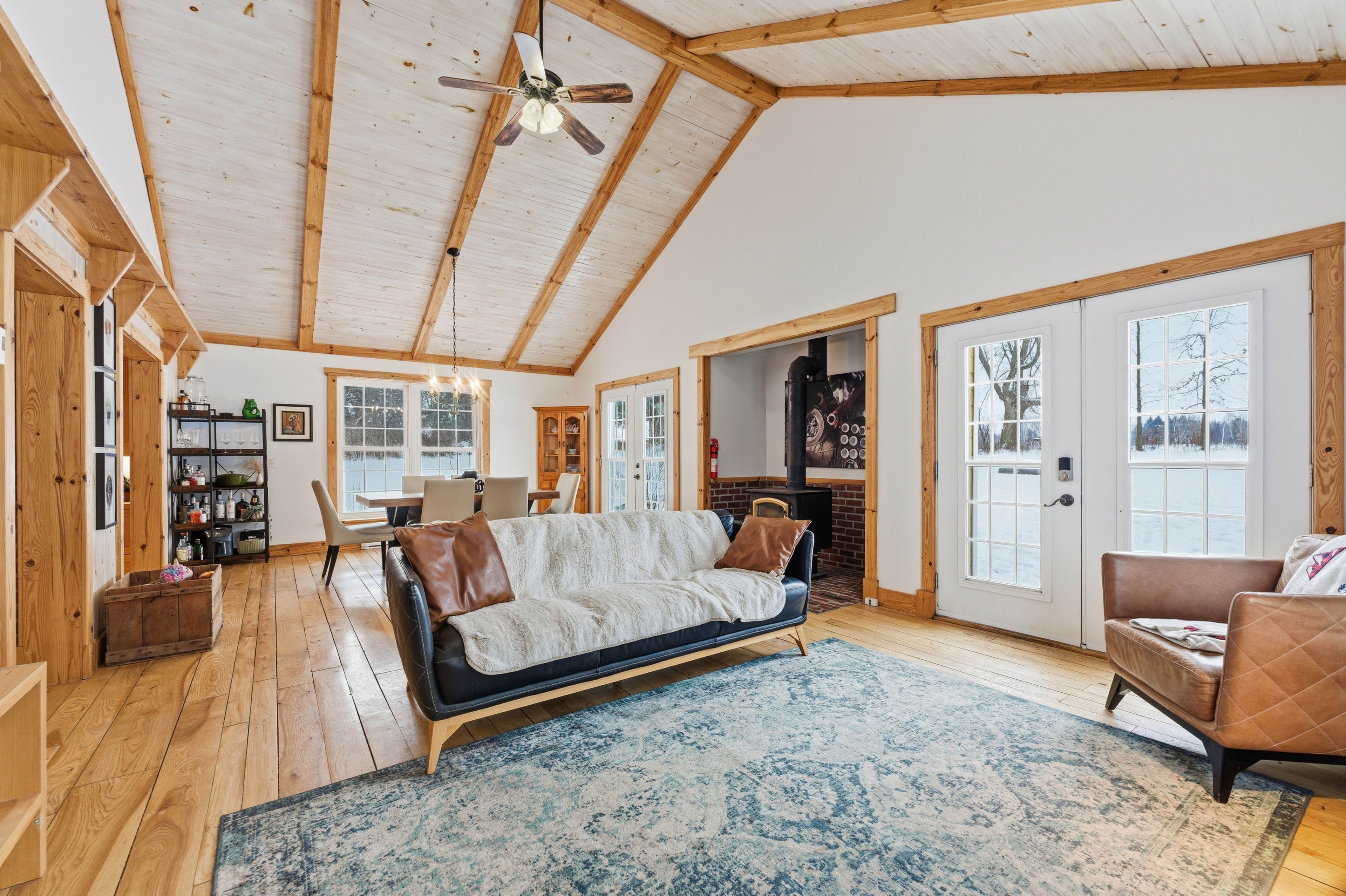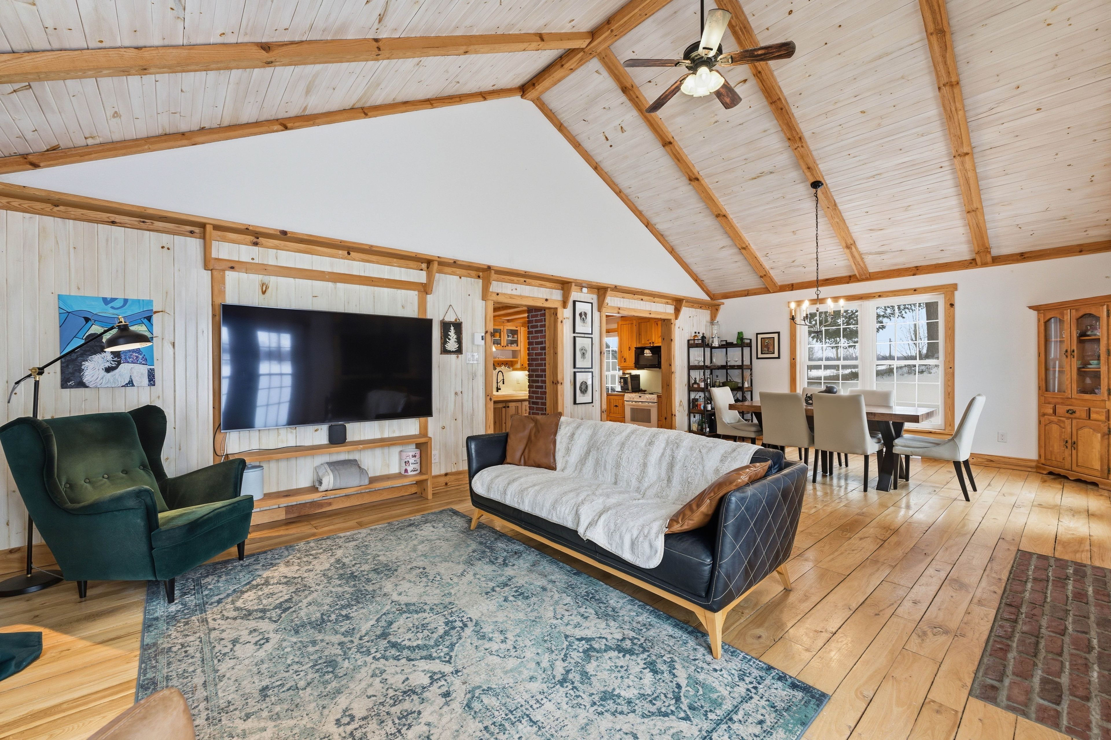 • Spacious open-concept living and dining area with cathedral ceilings and beams.