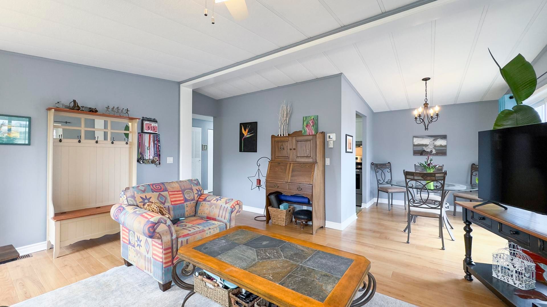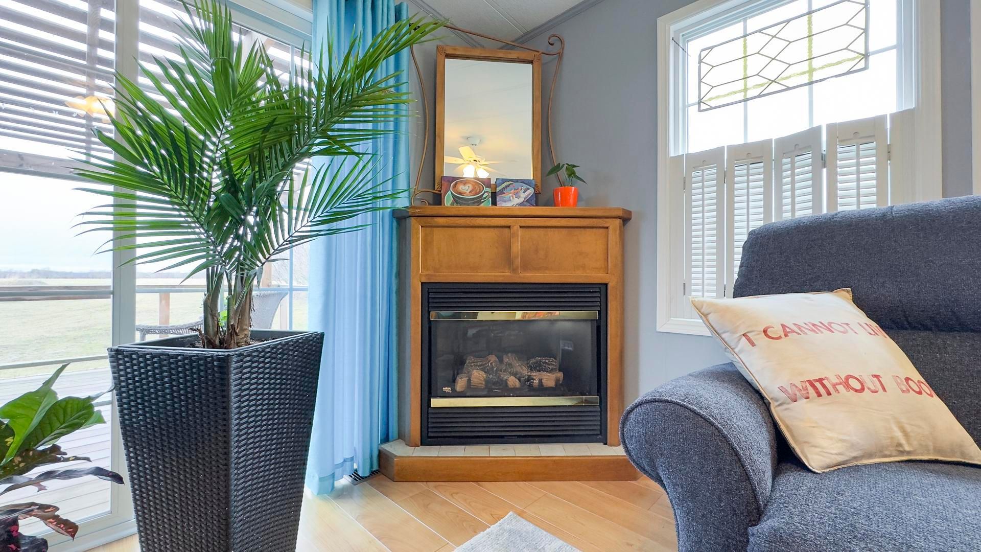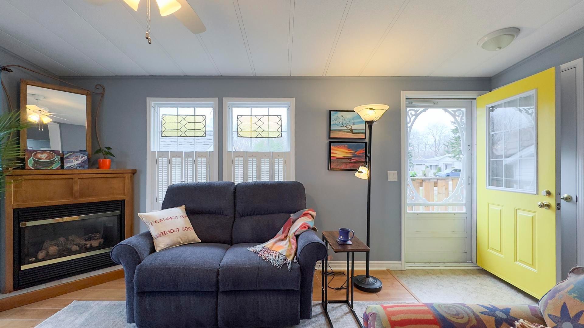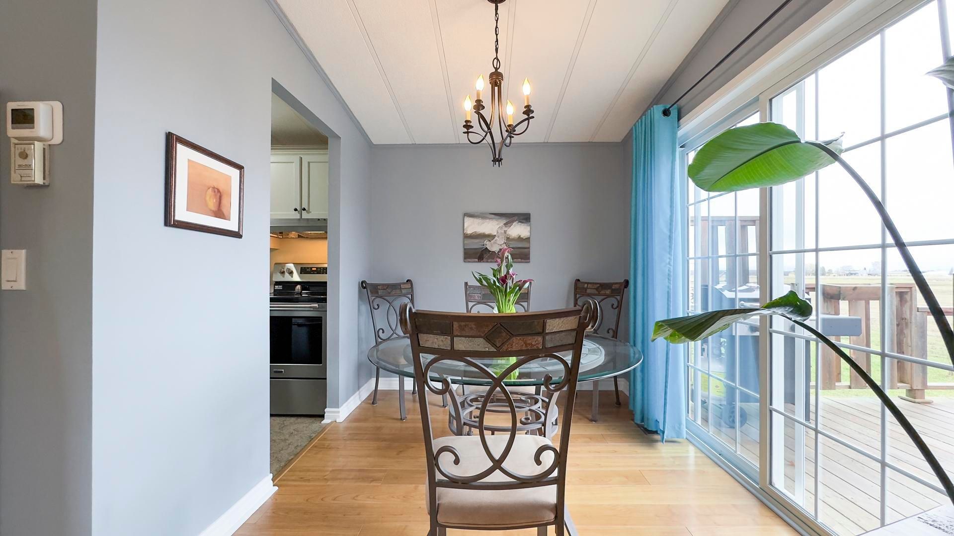 The sounds of spring are evident in the backyard of this quiet, serene and scenic location of this beautiful, well kept 2 bedroom, 2 bathroom open concept home. With no one living behind you, nature presents itself at all times of the day. Morning coffee couldn't get any better on the spanning easterly facing deck whether it be under the pergola or basking in the sun. Inside the immaculate home you will appreciate the open concept floor plan boasting an oversized living room with cozy gas fireplace, perfect for those colder nights. The dining room is located off to the side of the living room and it is the perfect space for hosting guests. Both the living and dining areas have an abundance of natural light coming from the 2 sets of patio doors leading onto the deck. The kitchen has ample cabinet space and located footsteps away from the laundry area making it an ideal space for those who love to cook. This home easily accommodates family and friends for dinner and social gatherings. The oversized primary bedroom with walk-in closet features a 3 piece ensuite. Guests will appreciate the size of the second bedroom with the main 4 piece main bathroom across the hall. Updates and features include new exterior shutters (2014), custom blinds in bedroom and laundry area, new gas line hook up (2020), new central air (2023), new wiring service to home & shed (2020), fridge & stove (2023), pergola (2022) & water heater, softener and reverse osmosis are owned . Meneset on the lake is a land lease, 55+ lifestyle community with an active clubhouse, drive down immaculate beach, paved streets, garden plots and outdoor storage. When living space, lifestyle, low maintenance and the beach check the boxes; wait no longer as this exceptional home is a gem!