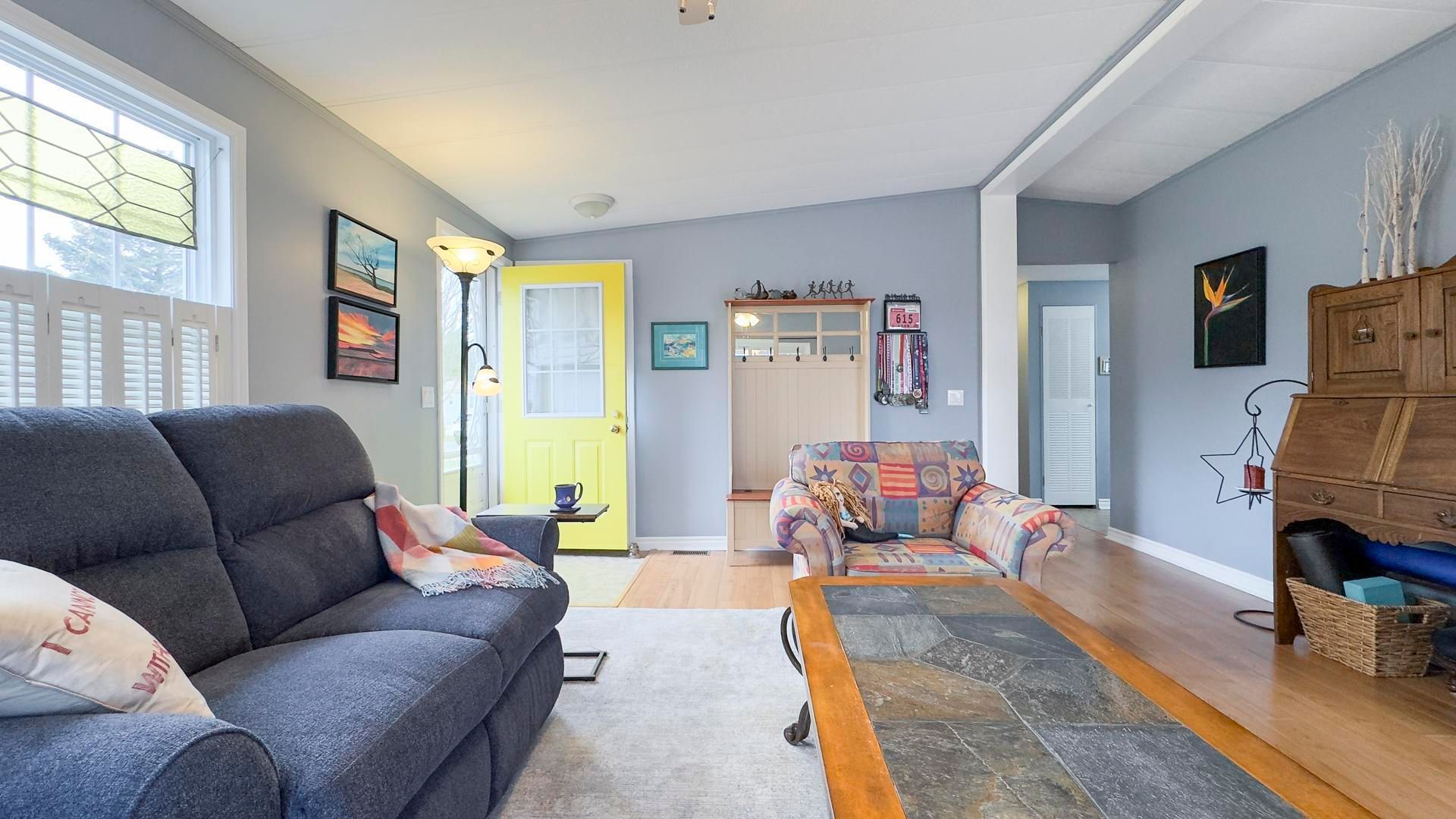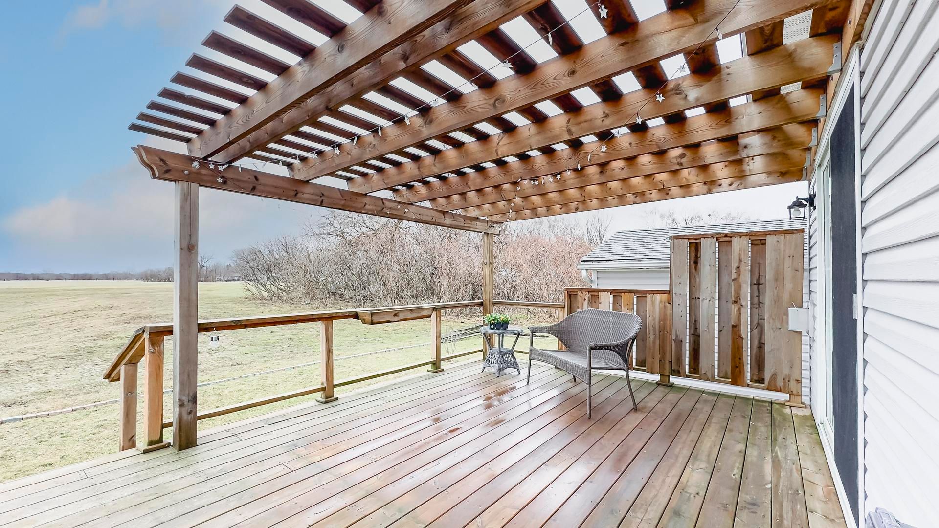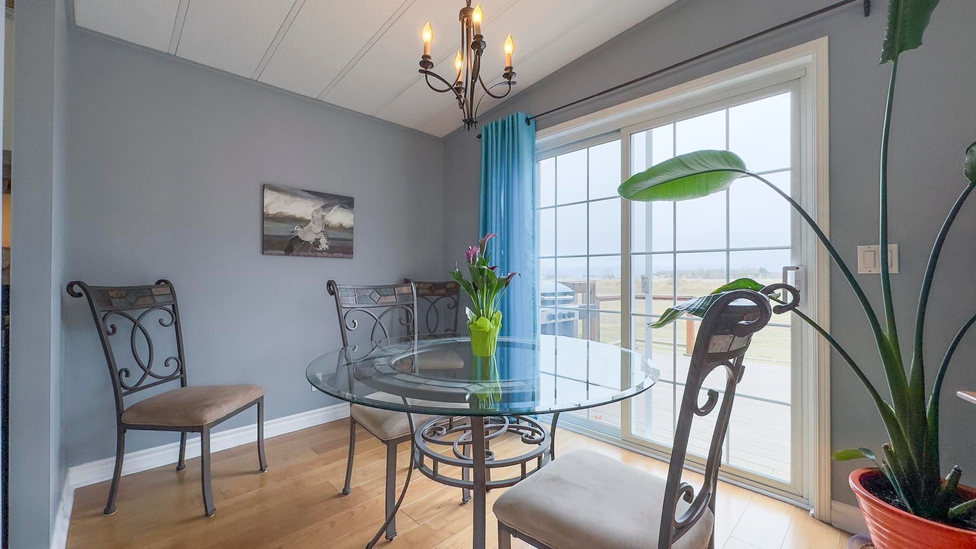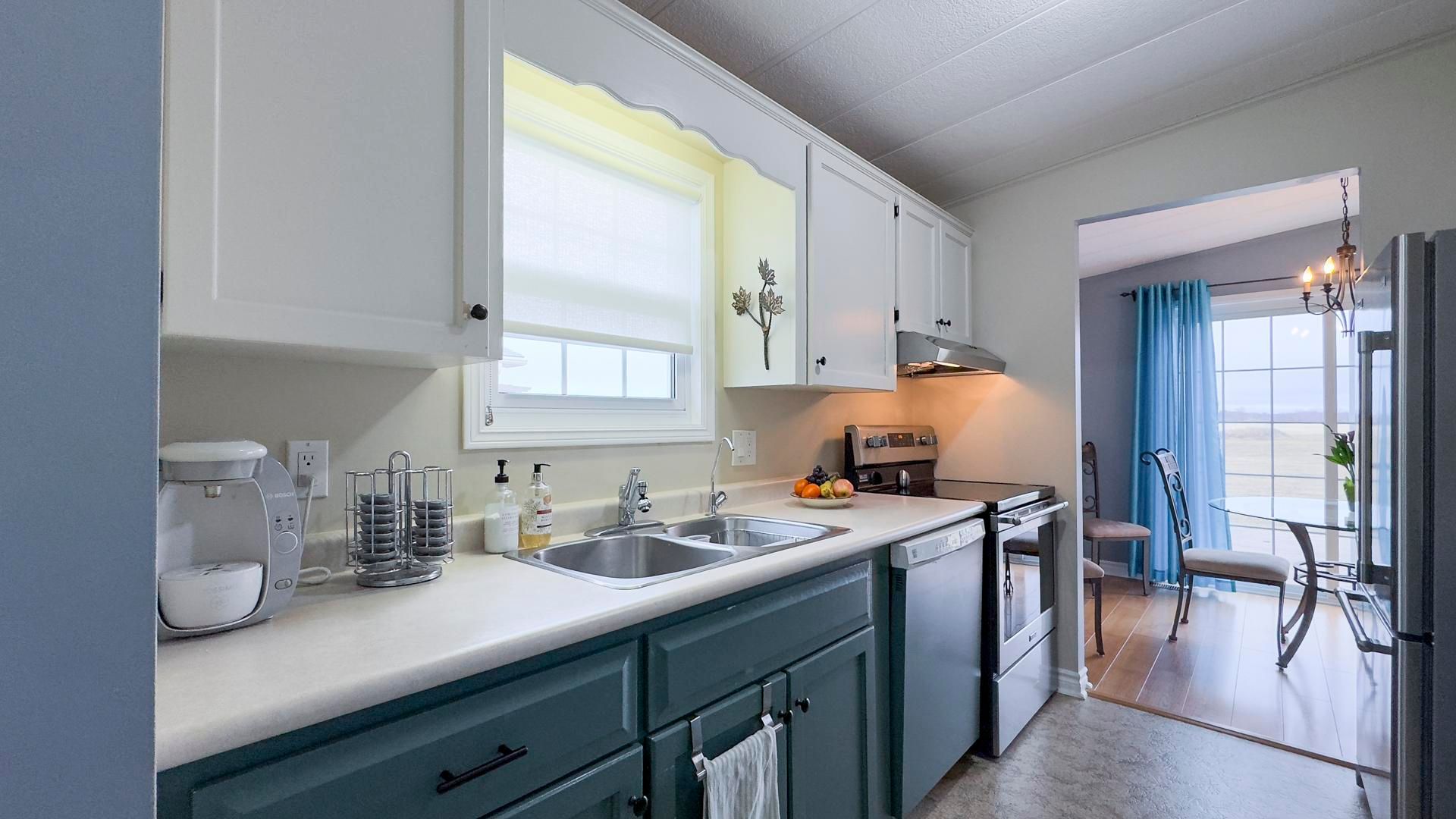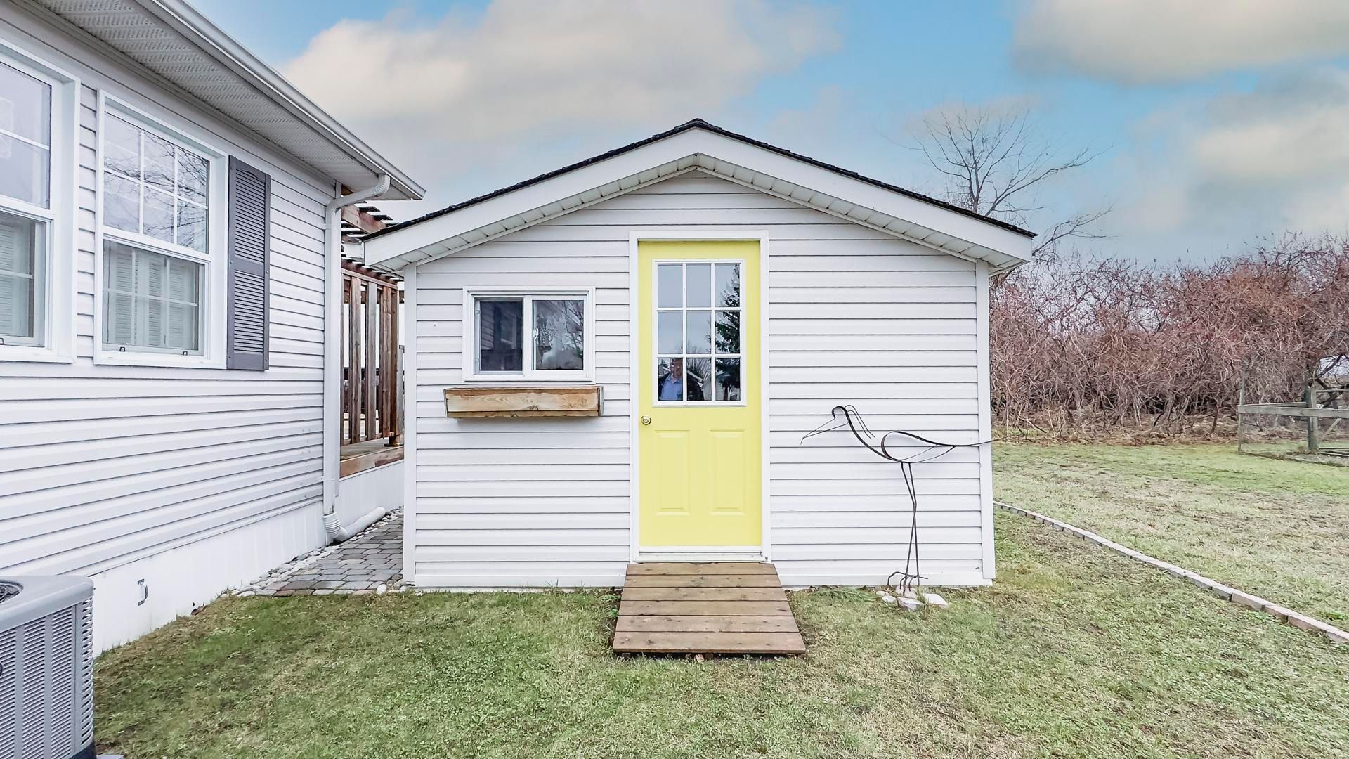 The sounds of spring are evident in the backyard of this quiet, serene and scenic location of this beautiful, well kept 2 bedroom, 2 bathroom open concept home. With no one living behind you, nature presents itself at all times of the day. Morning coffee couldn't get any better on the spanning easterly facing deck whether it be under the pergola or basking in the sun. Inside the immaculate home you will appreciate the open concept floor plan boasting an oversized living room with cozy gas fireplace, perfect for those colder nights. The dining room is located off to the side of the living room and it is the perfect space for hosting guests. Both the living and dining areas have an abundance of natural light coming from the 2 sets of patio doors leading onto the deck. The kitchen has ample cabinet space and located footsteps away from the laundry area making it an ideal space for those who love to cook. This home easily accommodates family and friends for dinner and social gatherings. The oversized primary bedroom with walk-in closet features a 3 piece ensuite. Guests will appreciate the size of the second bedroom with the main 4 piece main bathroom across the hall. Updates and features include new exterior shutters (2014), custom blinds in bedroom and laundry area, new gas line hook up (2020), new central air (2023), new wiring service to home & shed (2020), fridge & stove (2023), pergola (2022) & water heater, softener and reverse osmosis are owned . Meneset on the lake is a land lease, 55+ lifestyle community with an active clubhouse, drive down immaculate beach, paved streets, garden plots and outdoor storage. When living space, lifestyle, low maintenance and the beach check the boxes; wait no longer as this exceptional home is a gem!