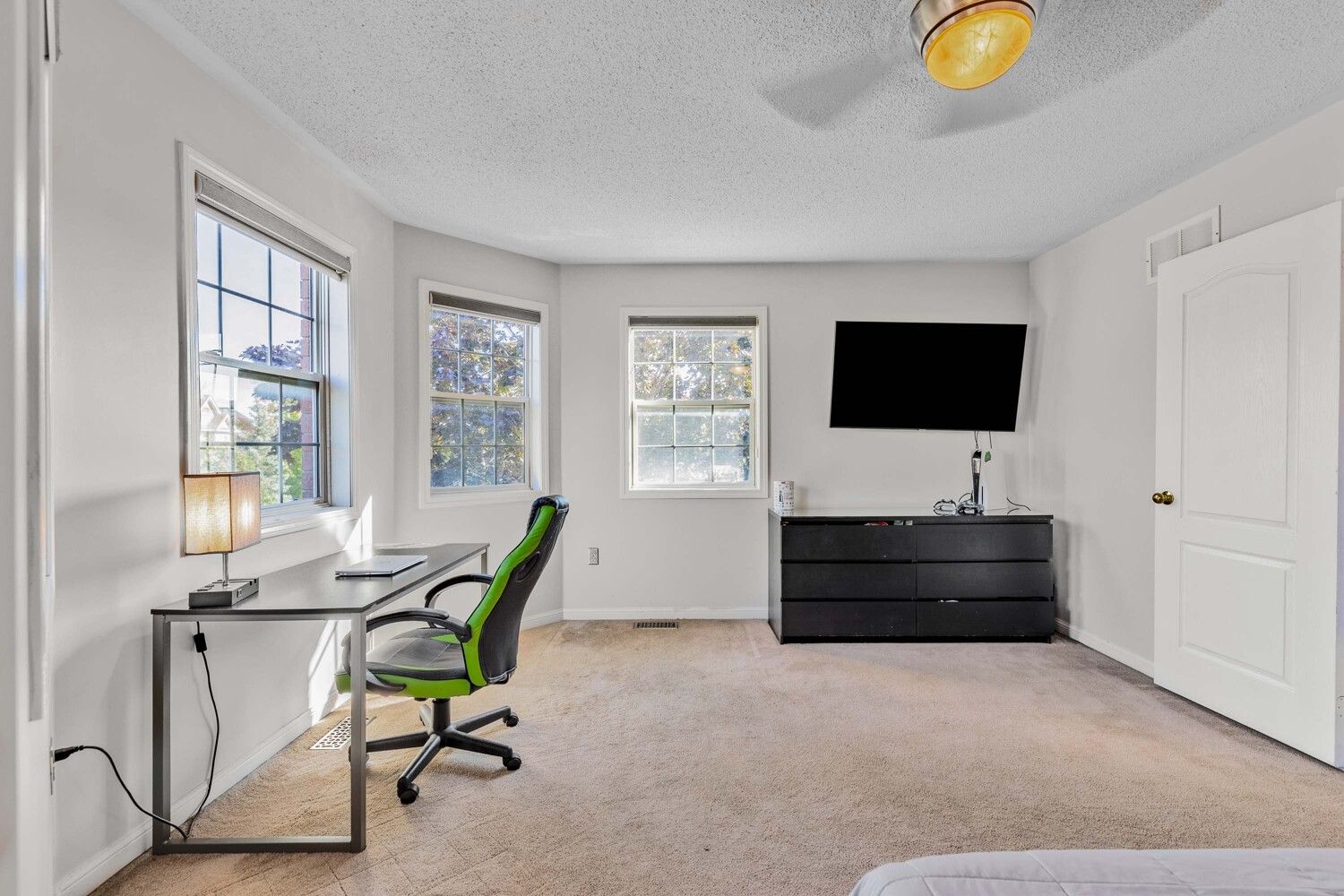 • Bright open-concept design with large windows and custom blinds.