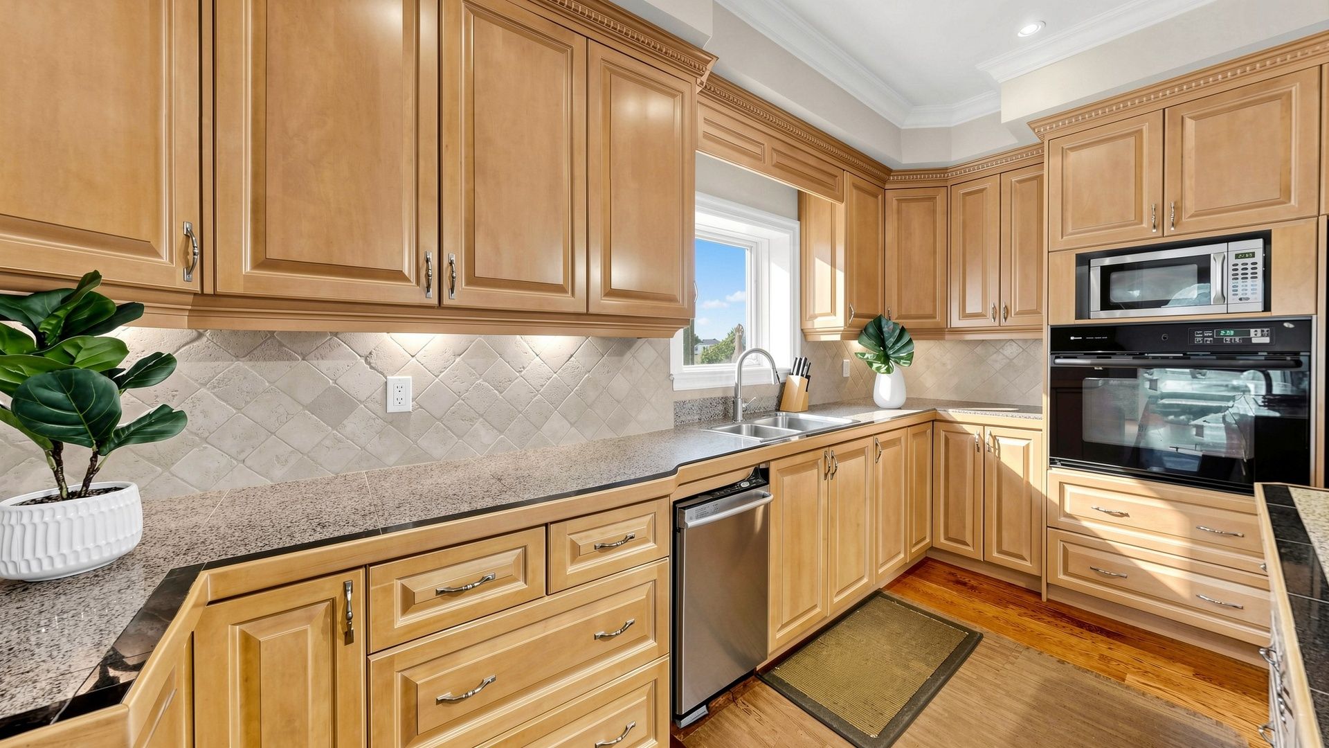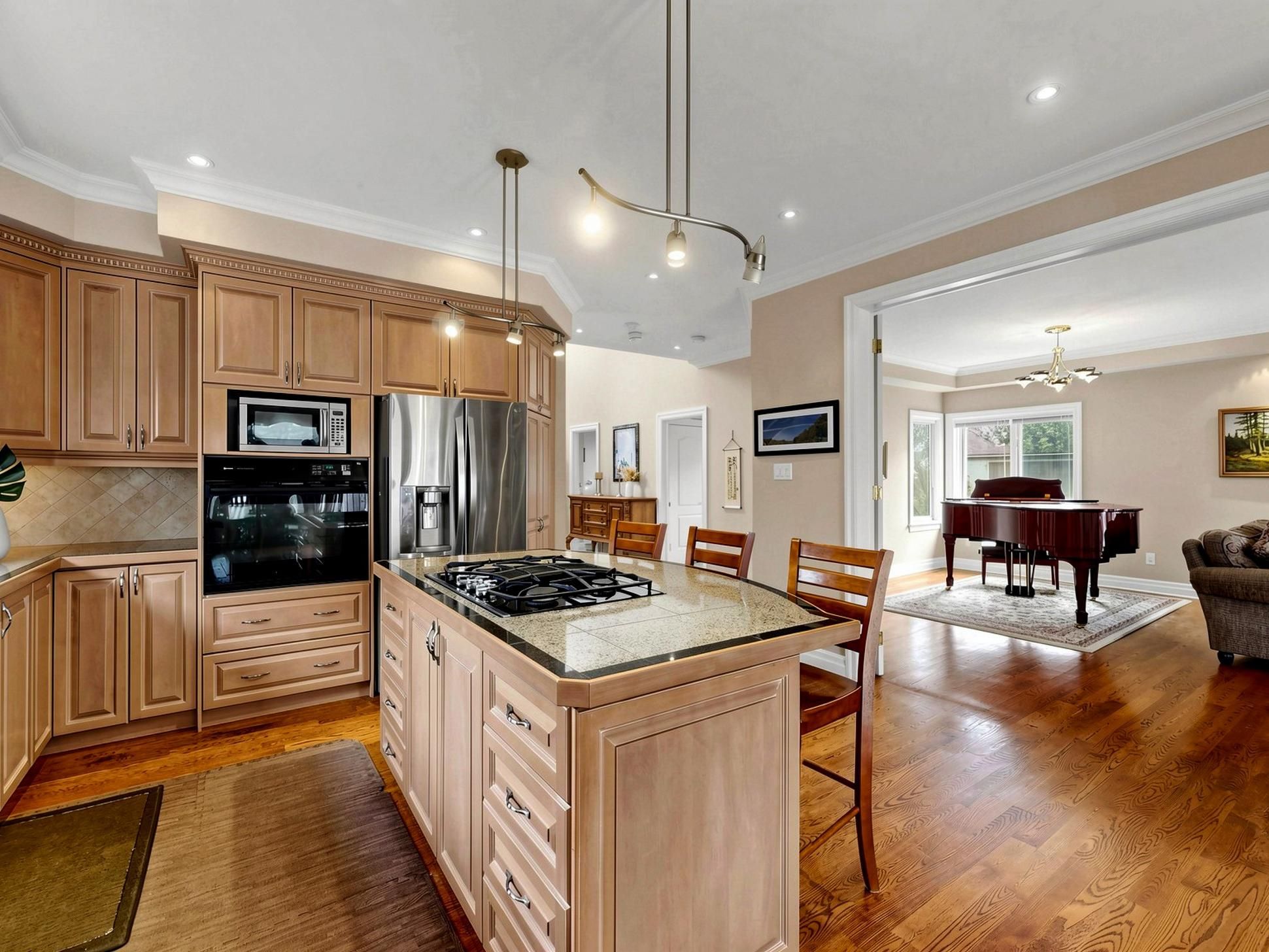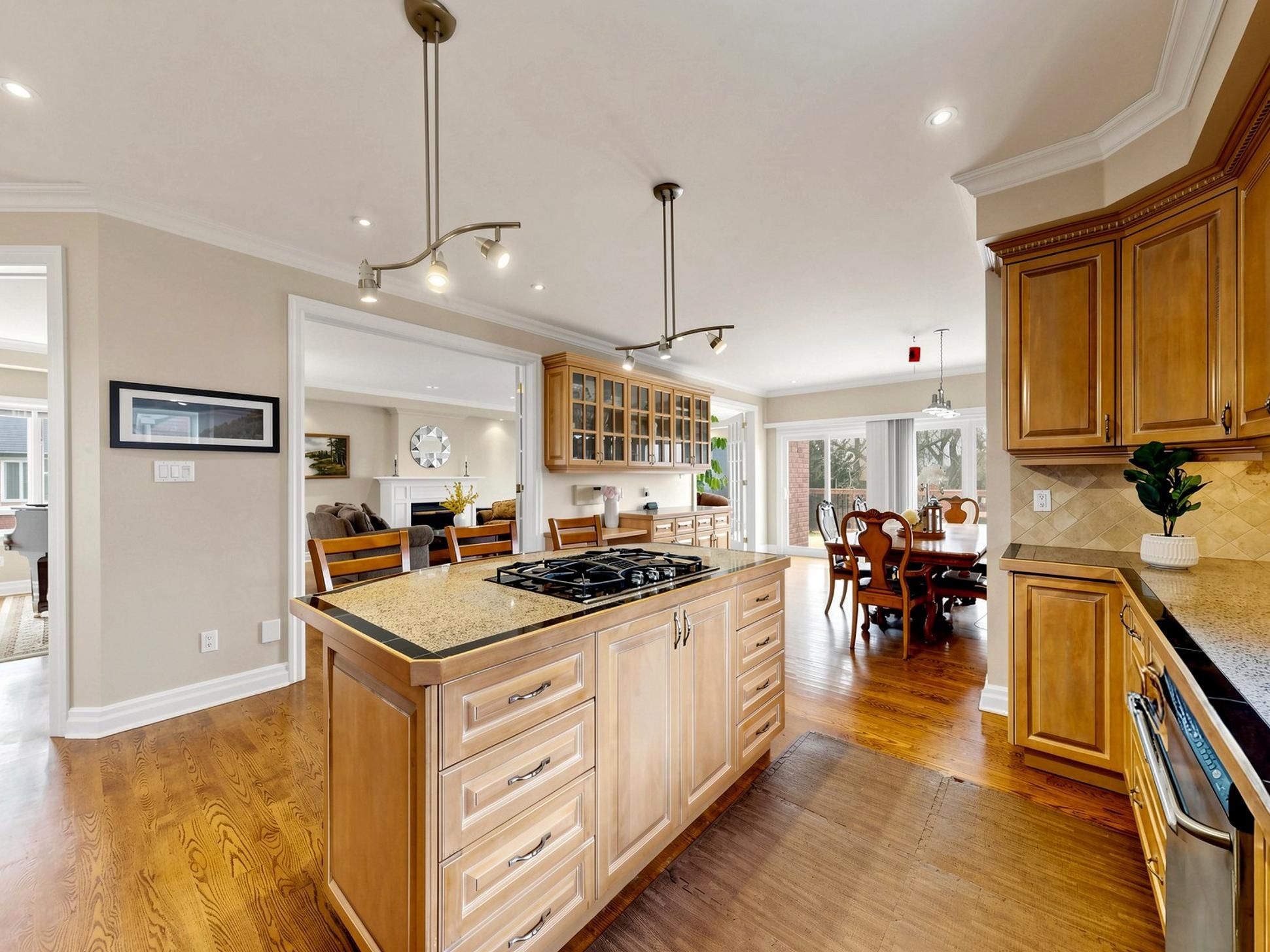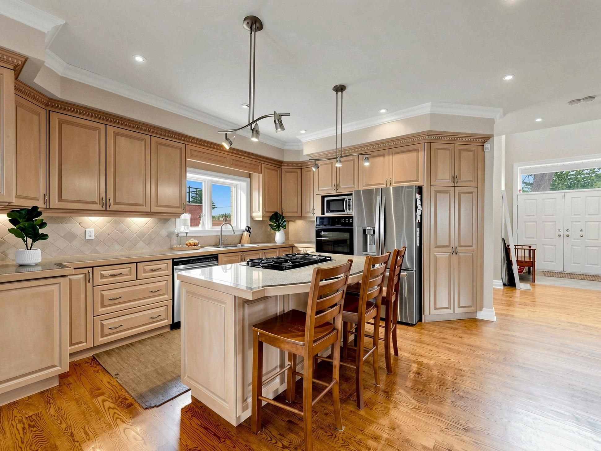 • Stylish kitchen with large center island and views of a lush backyard.