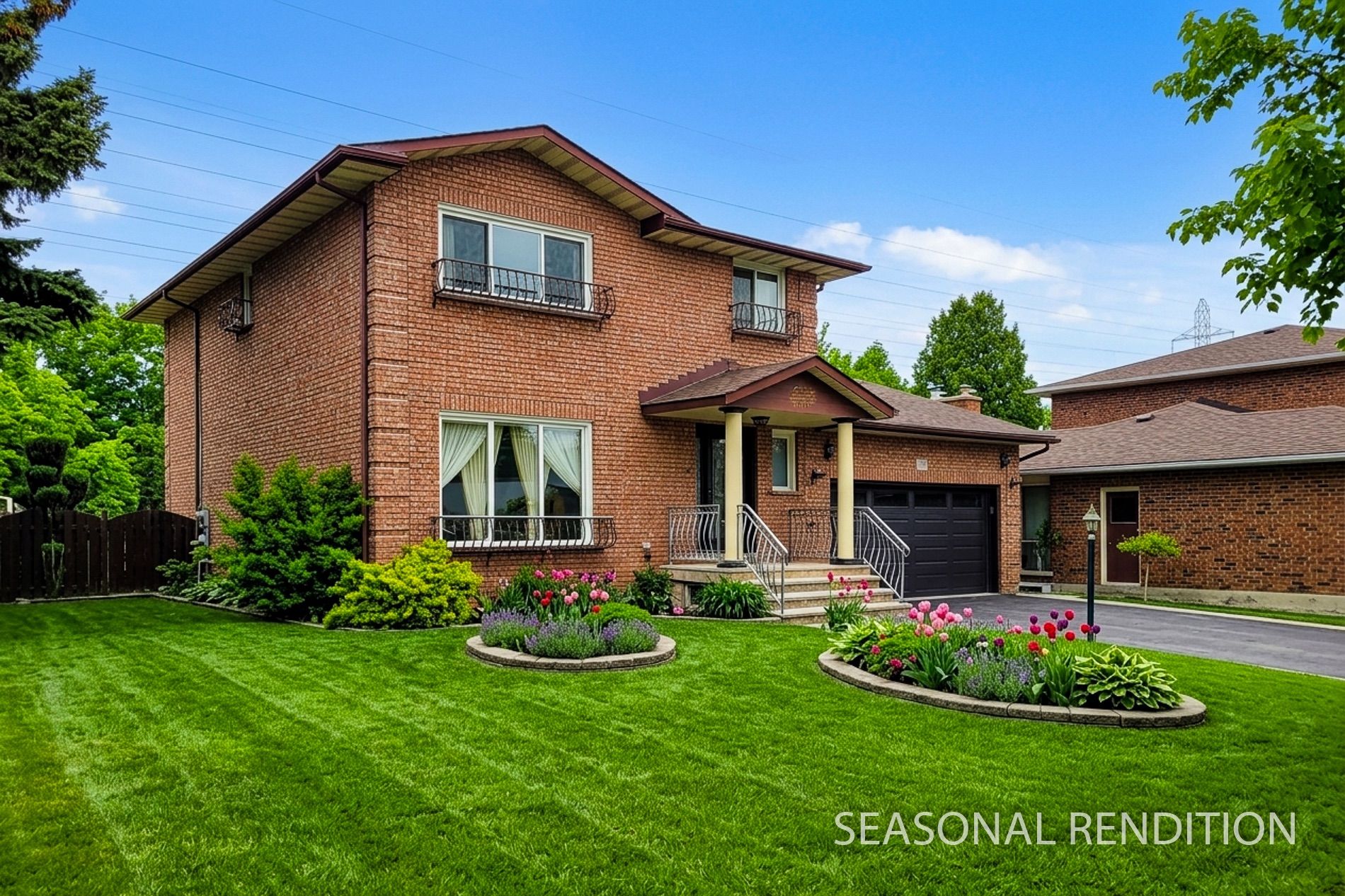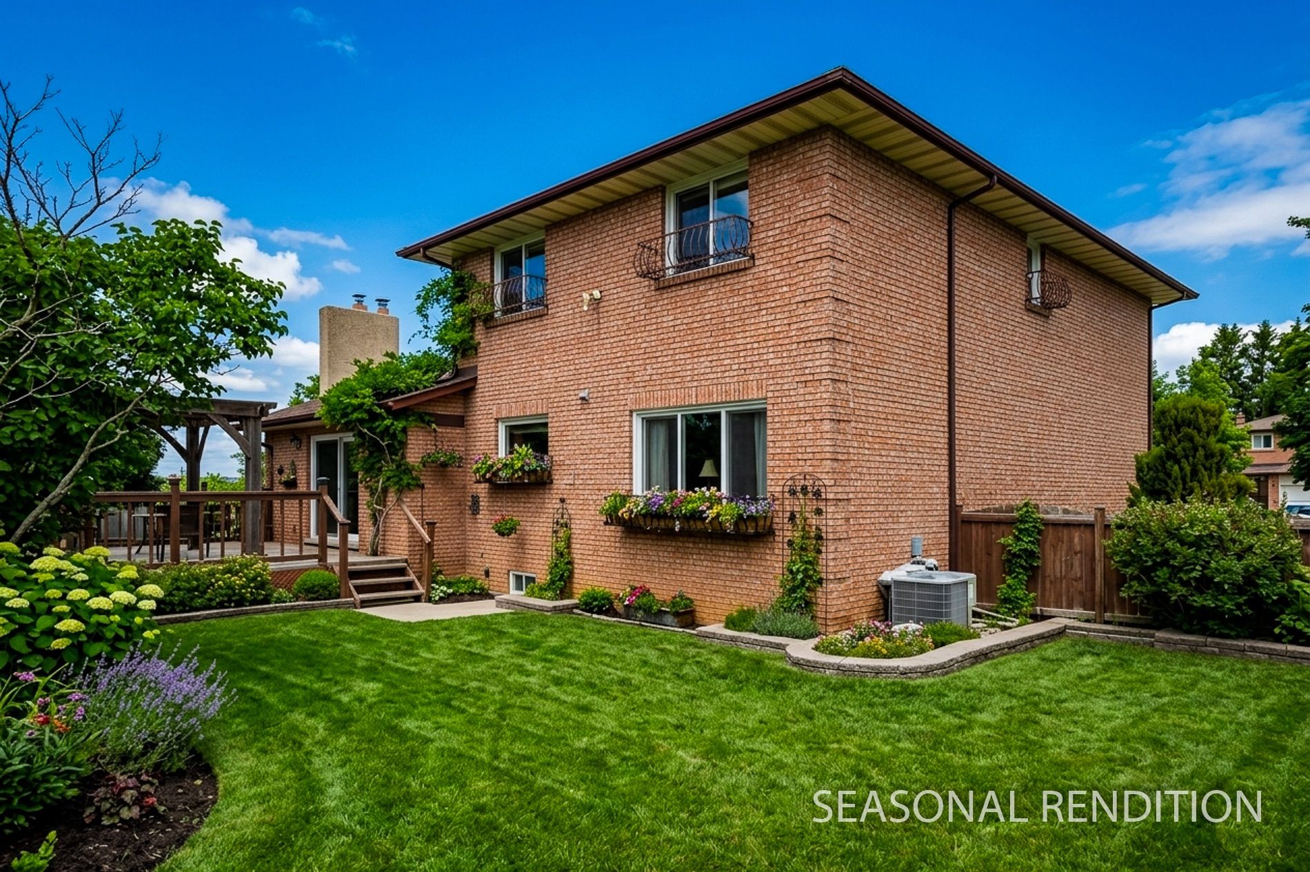 • Oversized deck offers a relaxing outdoor space surrounded by greenery.