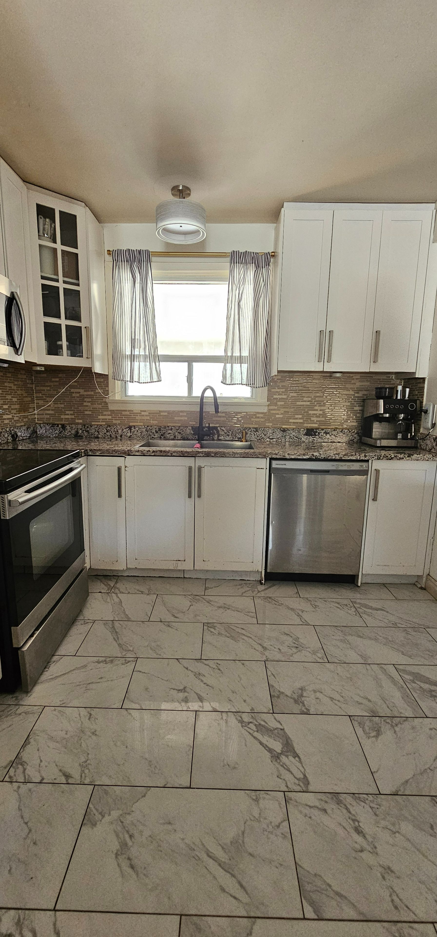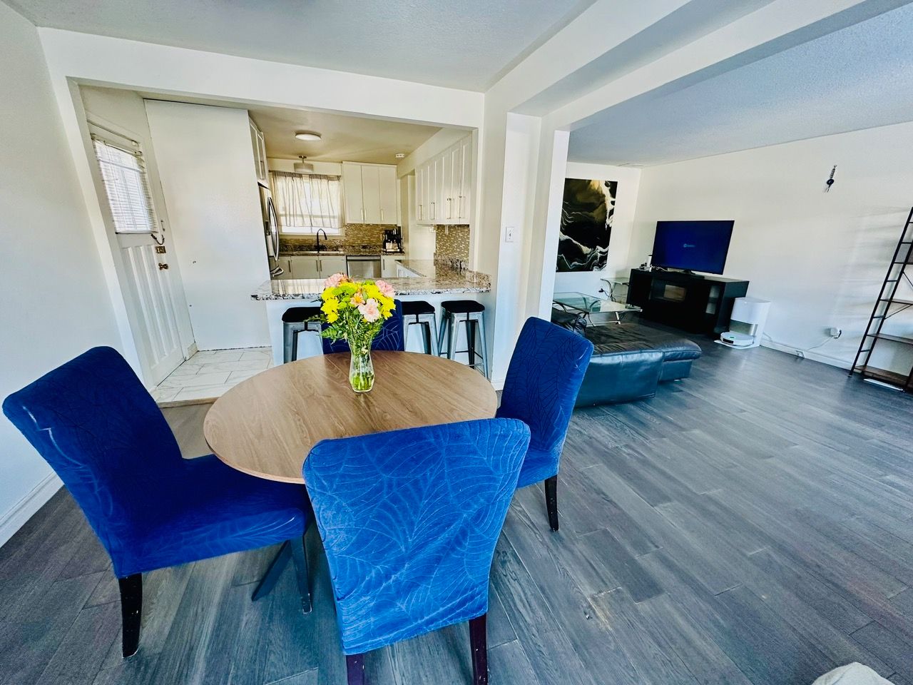 • Modern eat-in kitchen with stainless steel appliances and granite countertops.
