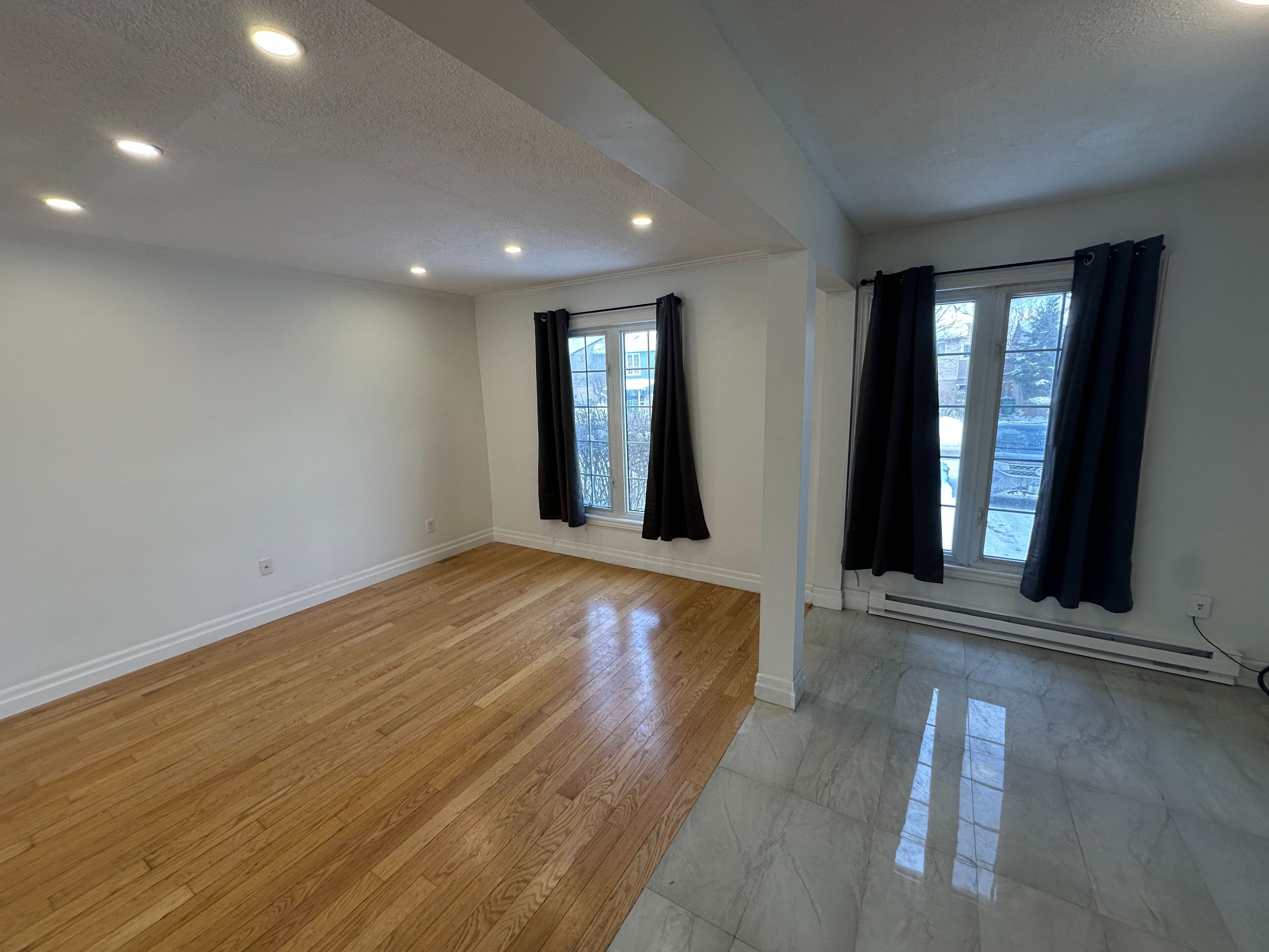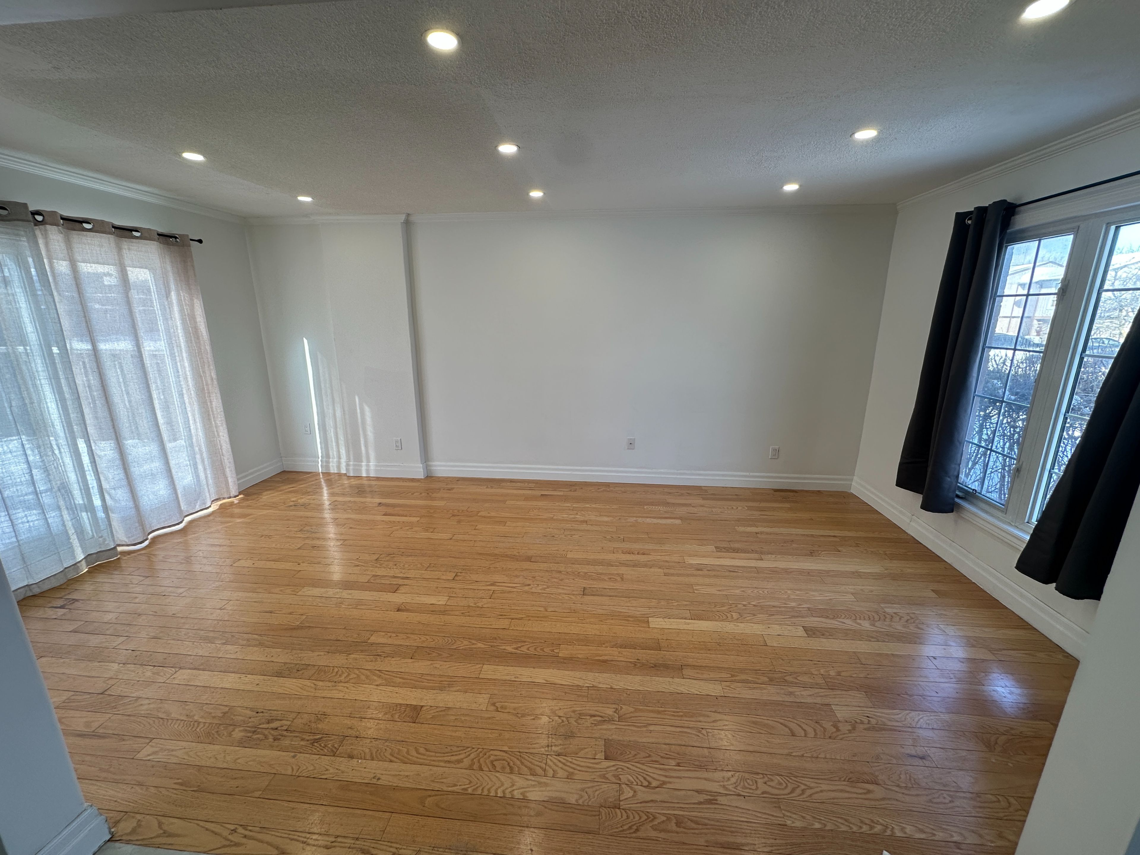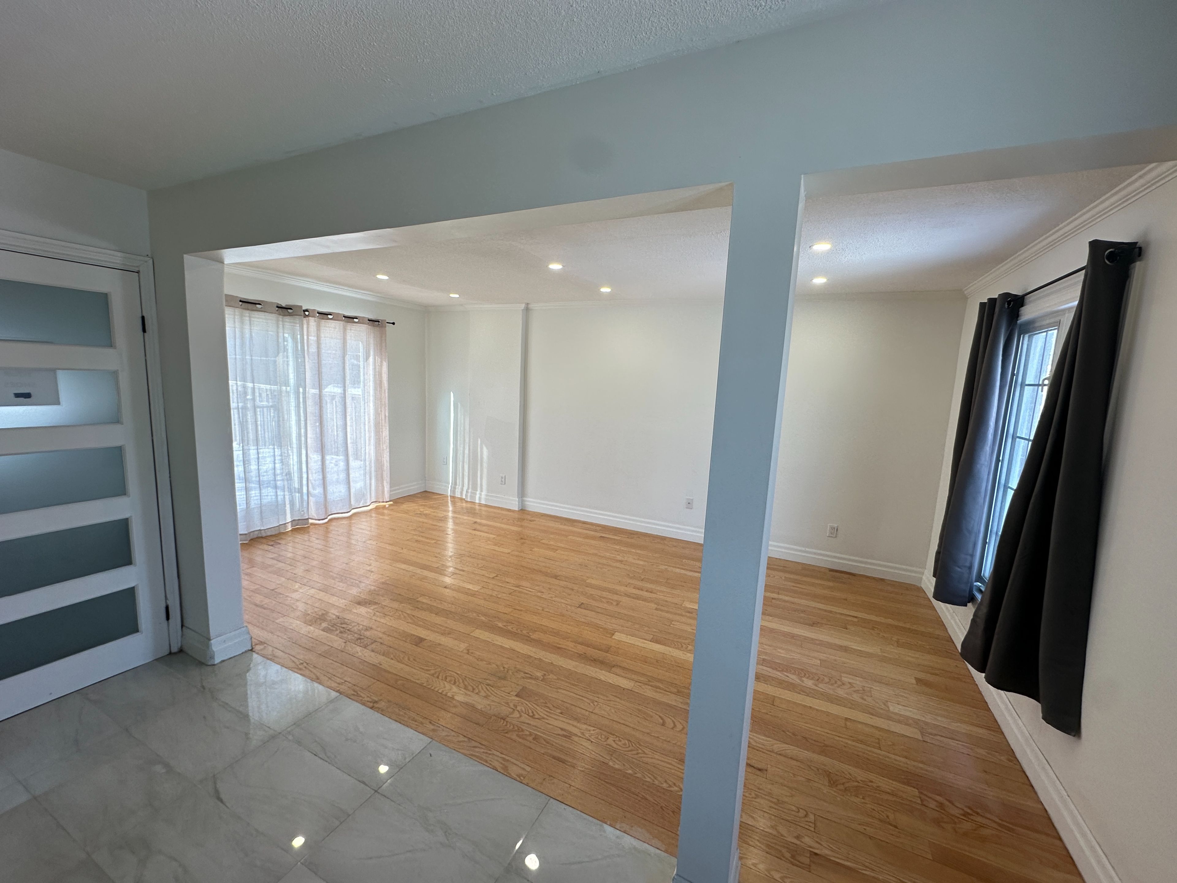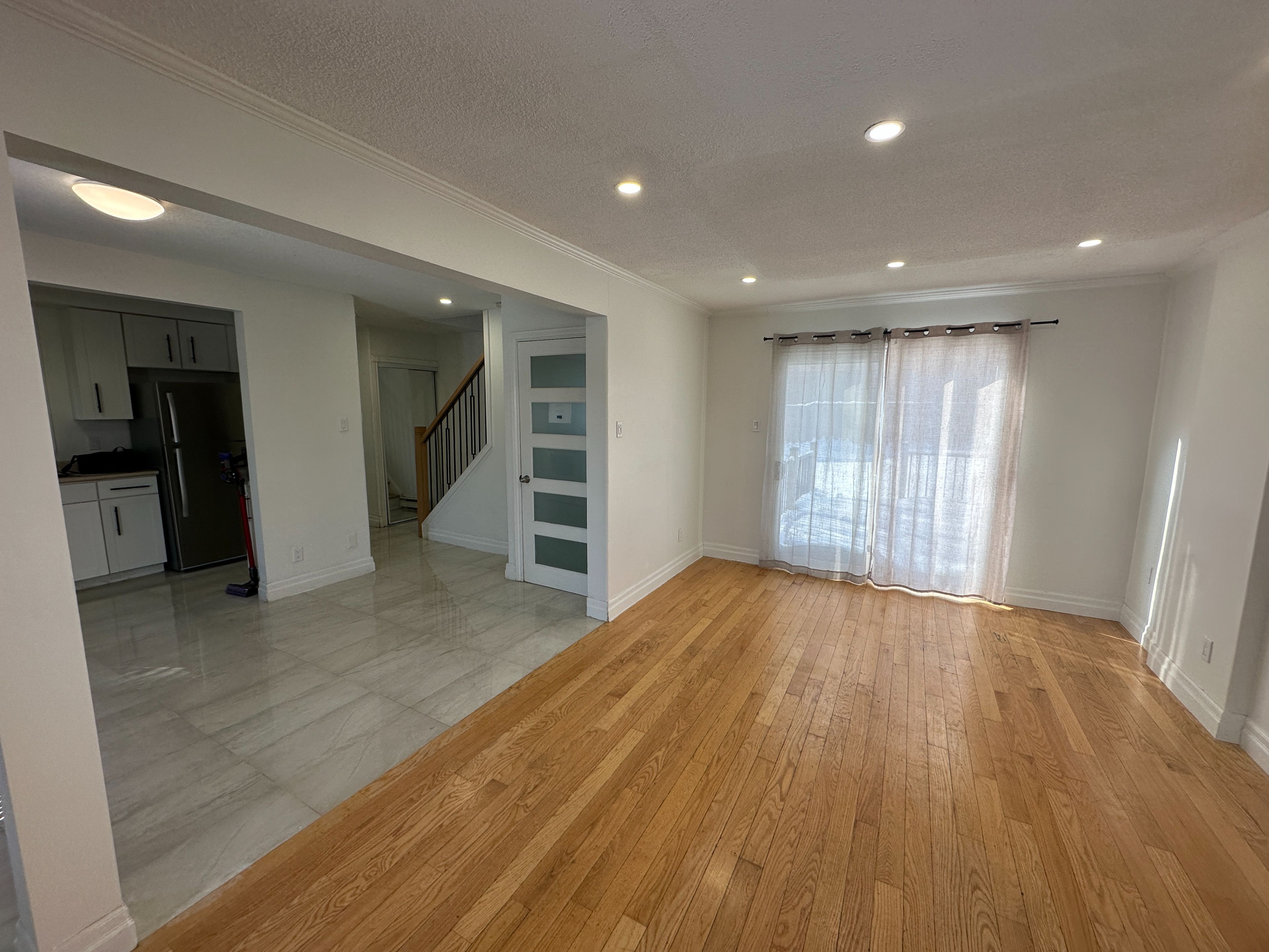 • Open-concept living/dining area with hardwood flooring and pot lights.