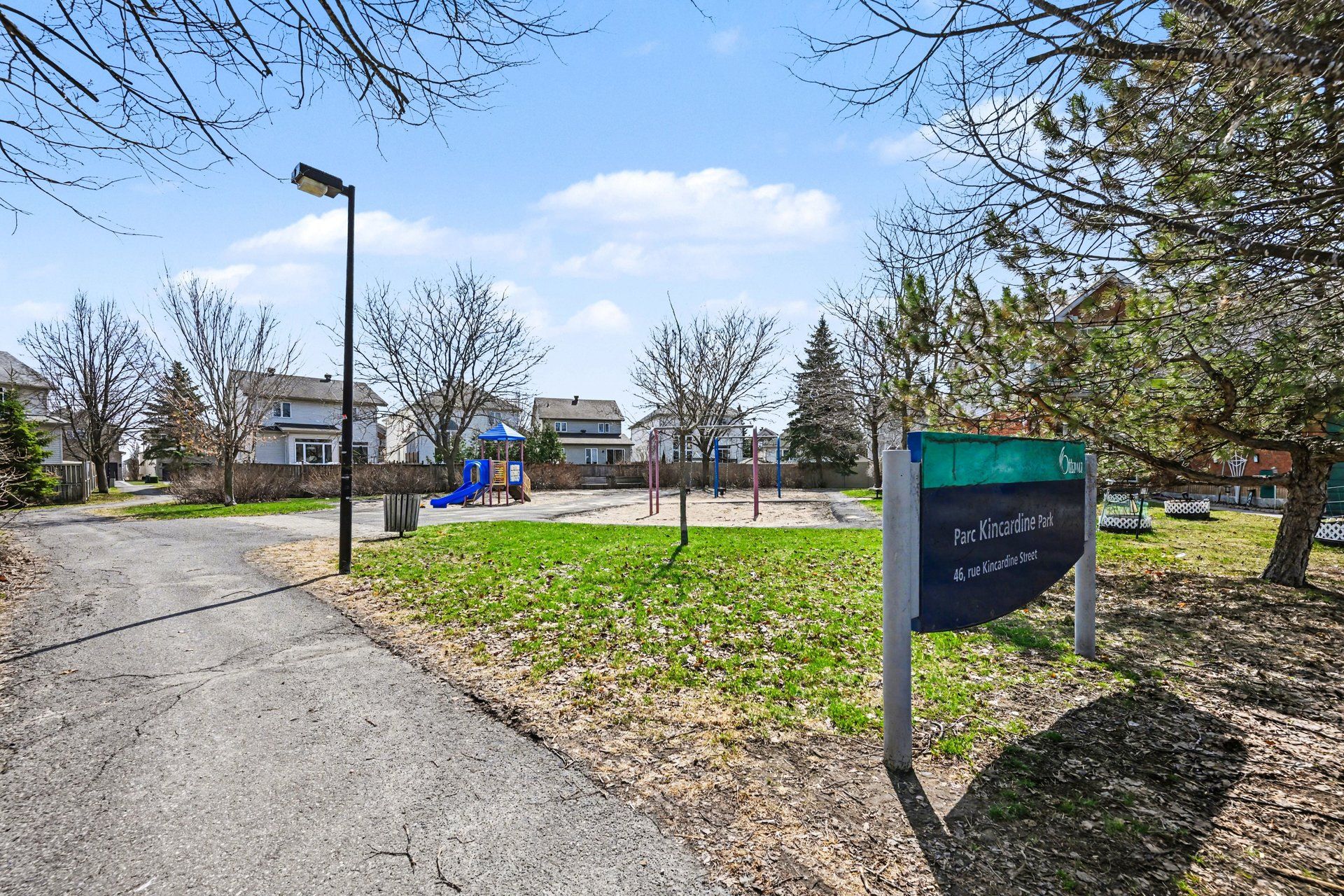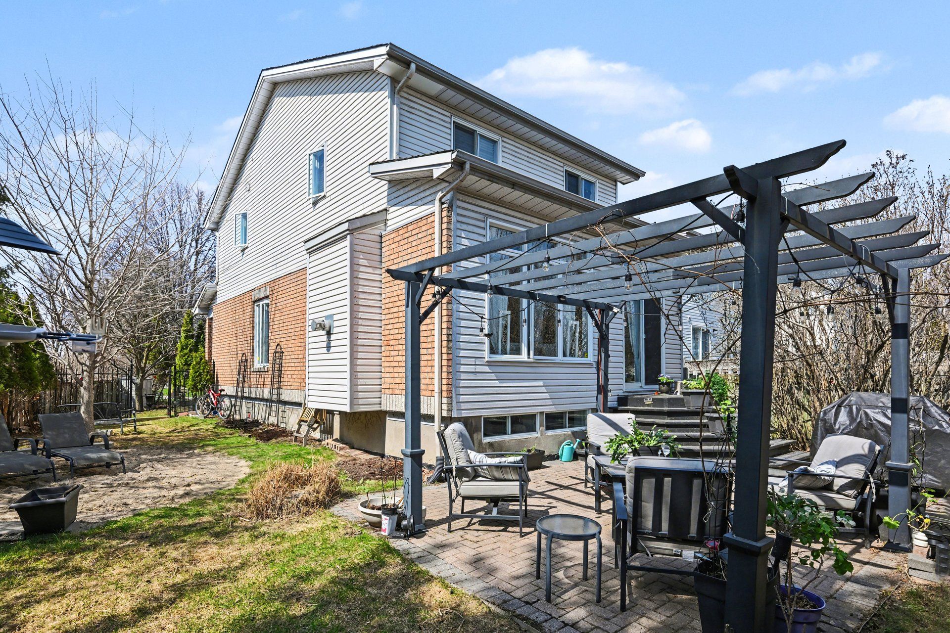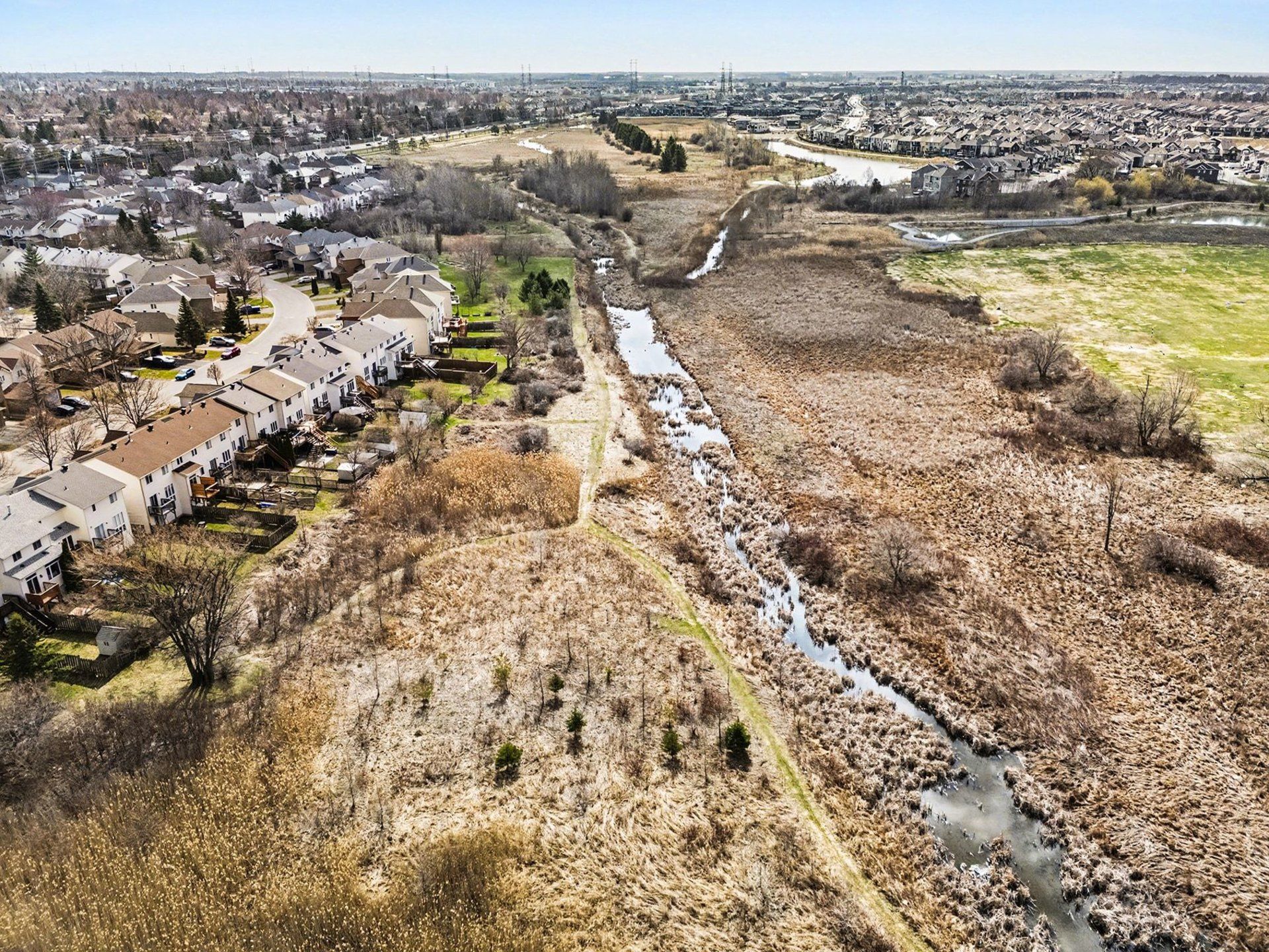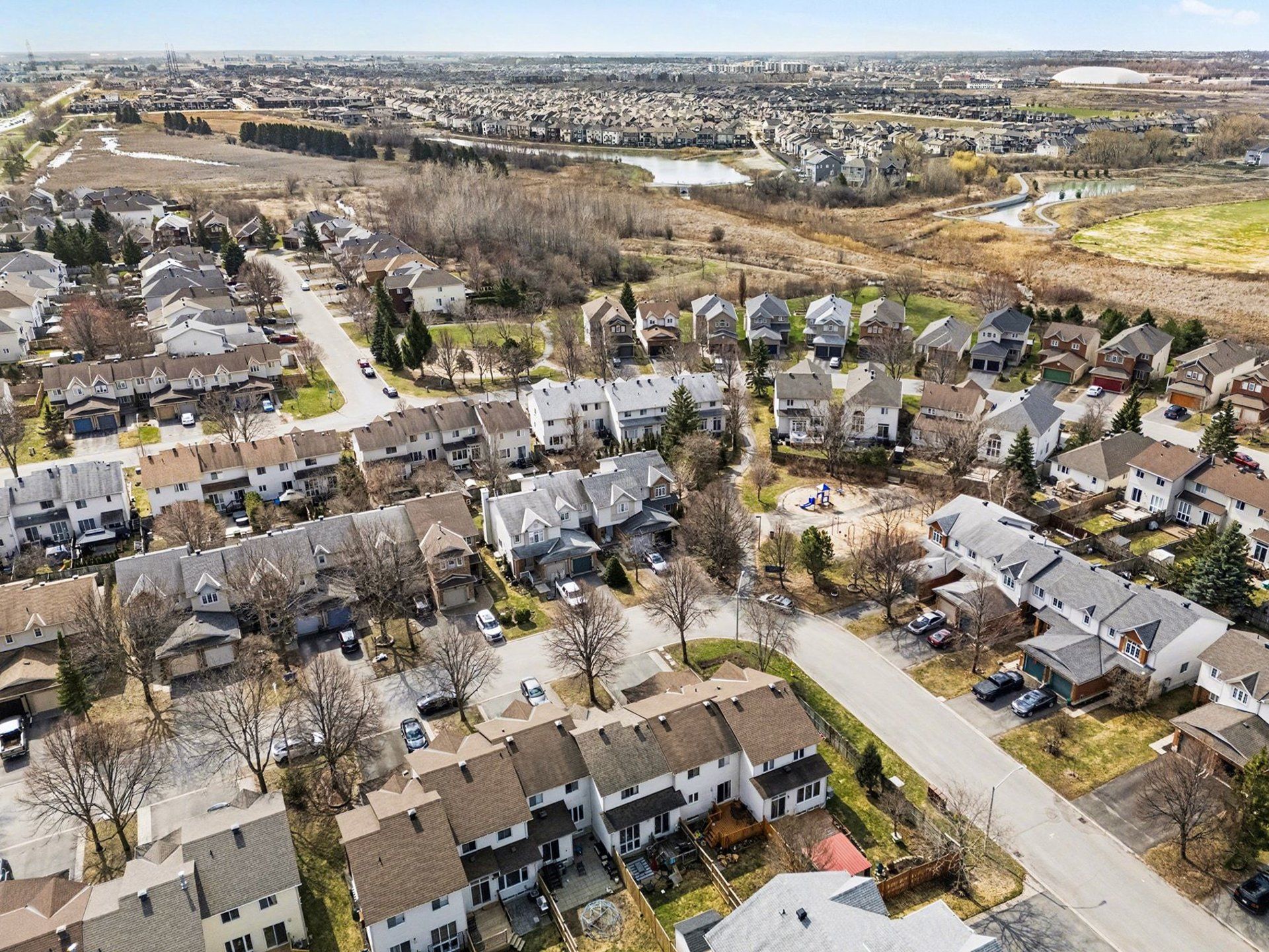 Highly sought-after renovated 3-bedroom 2. 5-bathroom end unit townhome ideally situated on the largest lot on the street, siding directly onto a park, a dream setting for families! This spacious home is bright and sunny as it features large windows throughout and gets flooded with natural light throughout the day thanks to the desirable southwest backyard exposure. This home boasts a larger than usual layout with a main floor living room, dining room and family room, as well as an eat-in kitchen and a powder room. The second level features a large primary bedroom with a modern 4-piece ensuite bathroom and a walk-in closet, as well as two additional bedrooms and a chic full bathroom. The basement rec room has been recently refinished with new luxury vinyl flooring and bright lighting, with additional storage and a laundry area. The expansive lot offers more outdoor space than comparable units, and sits on a quiet family-friendly street. Enjoy summer evening bbq's in your backyard oasis! The huge fully fenced backyard features a large patio with a pergola, lots of trees for added privacy, a space for a 16 foot wide above ground pool (included, currently stored in the backyard) and a storage shed. Only steps away from the new farmboy grocery store and a wide array of local amenities, shops, and dining. Enjoy easy access to nearby parks and scenic walking trails along a beautiful creek and ponds, ideal for dog walkers and nature lovers. Short 4-minute commute to the 417. Don't miss the opportunity to own a move-in ready home that truly offers the best of location, space, natural light, and parkside living! Ideal for growing families or those seeking convenience without sacrificing space. Roof 2018. Furnace 2022. Book your showing today! 48 hours irrevocable on offers.