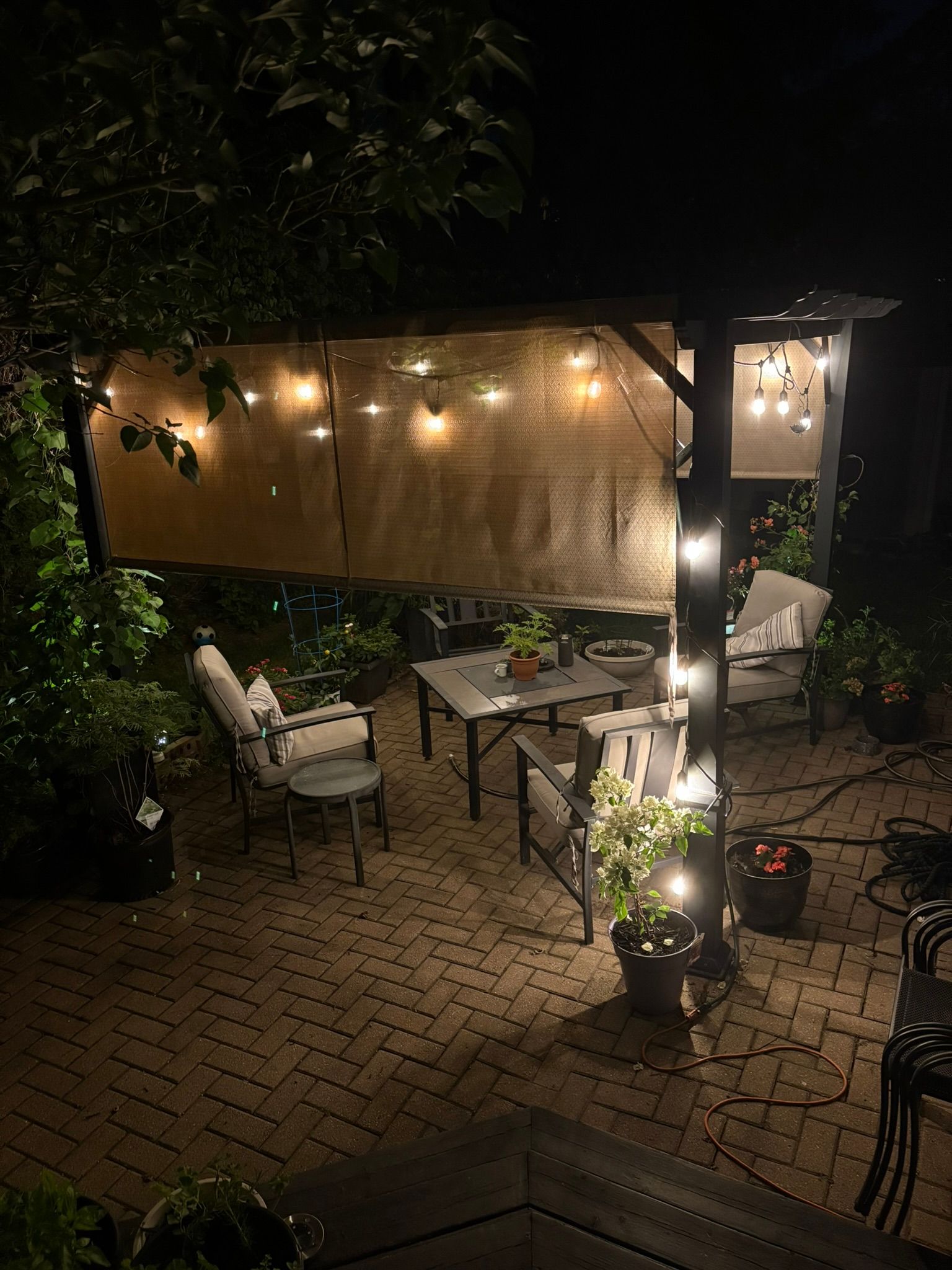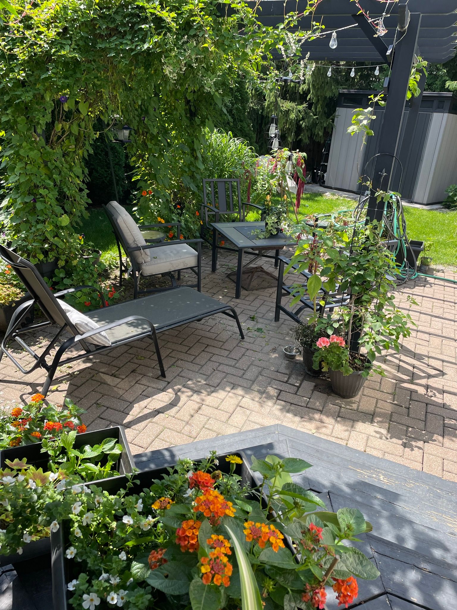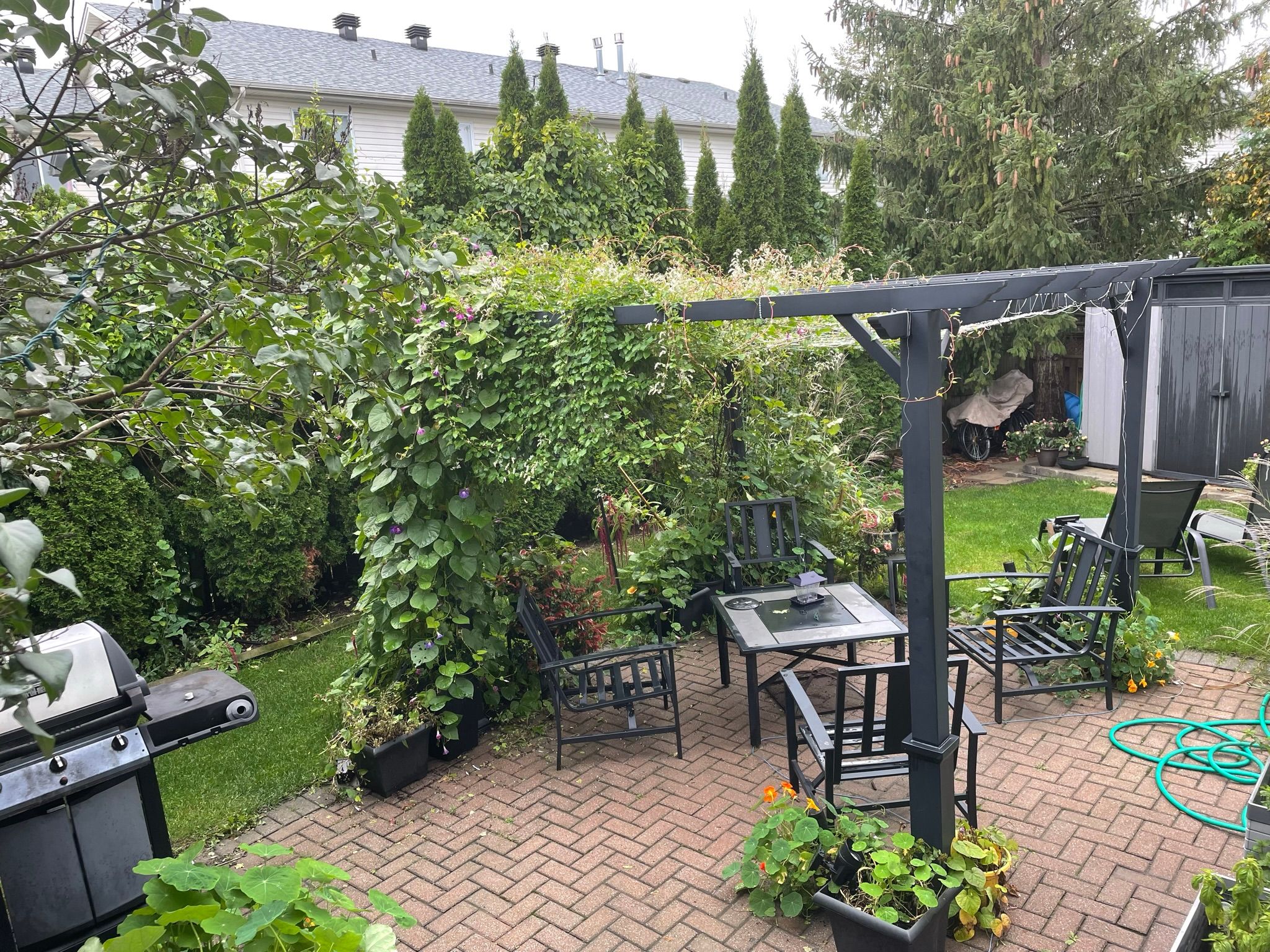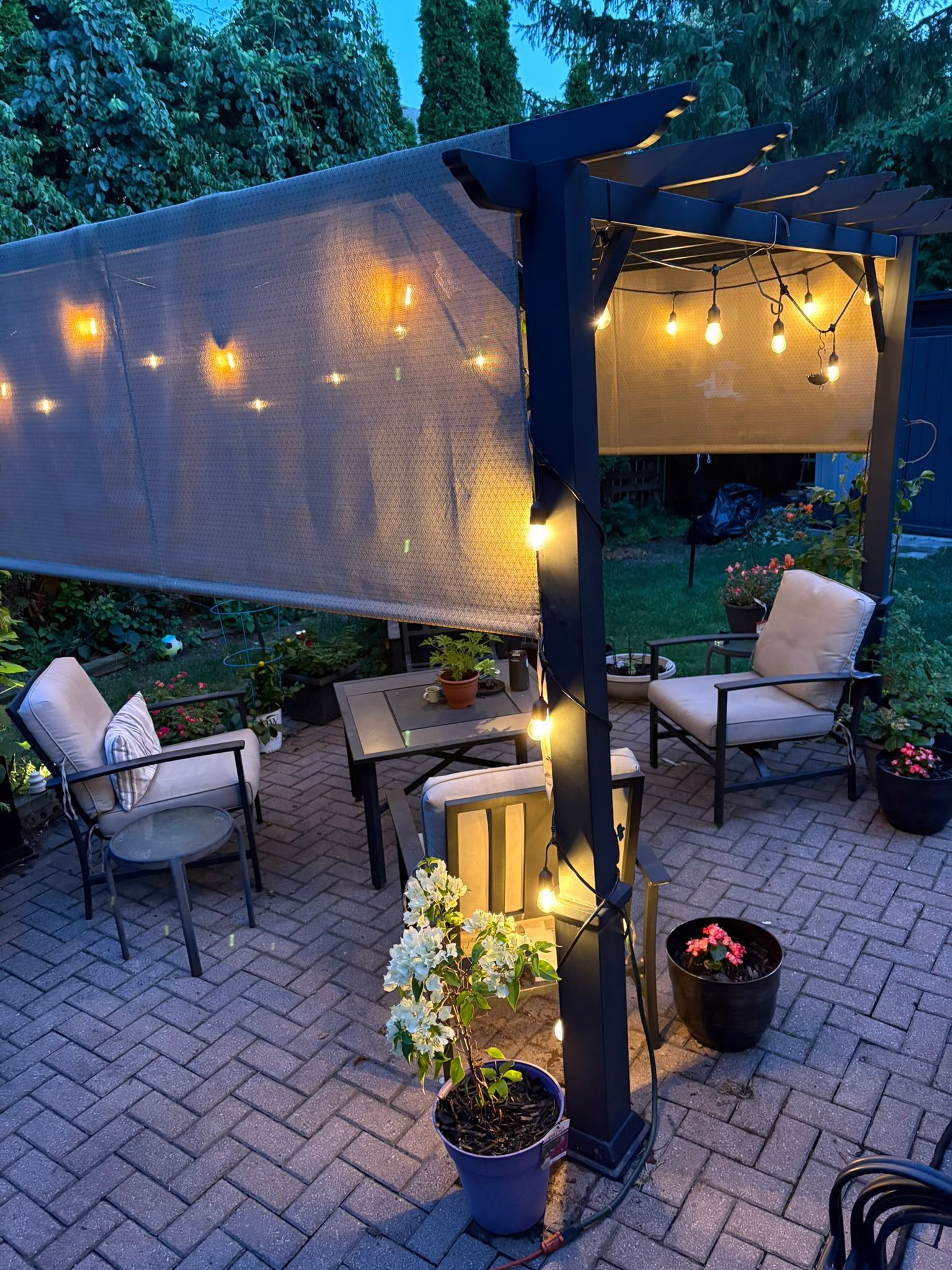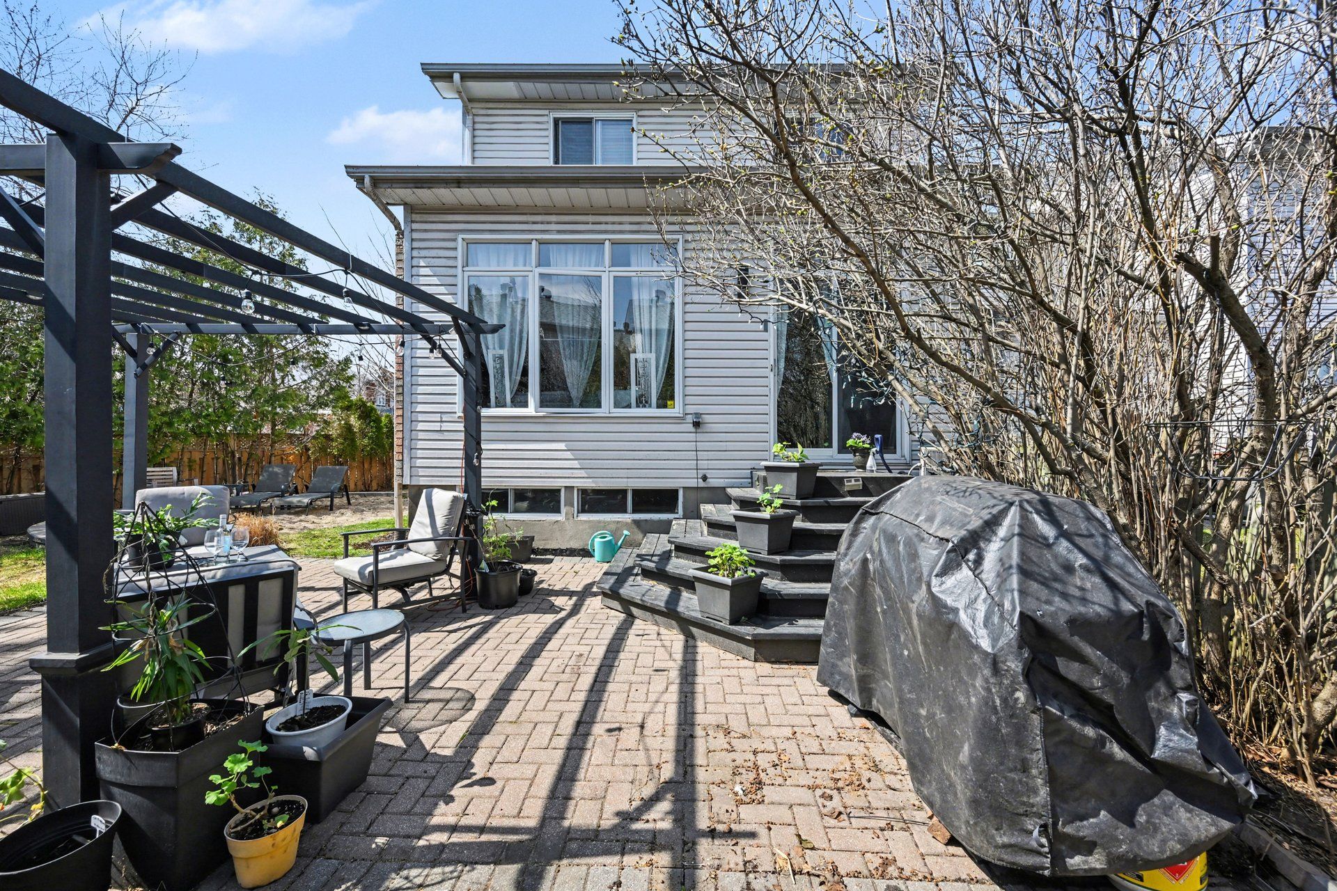 • Expansive backyard with patio, pergola, trees, and potential pool space.