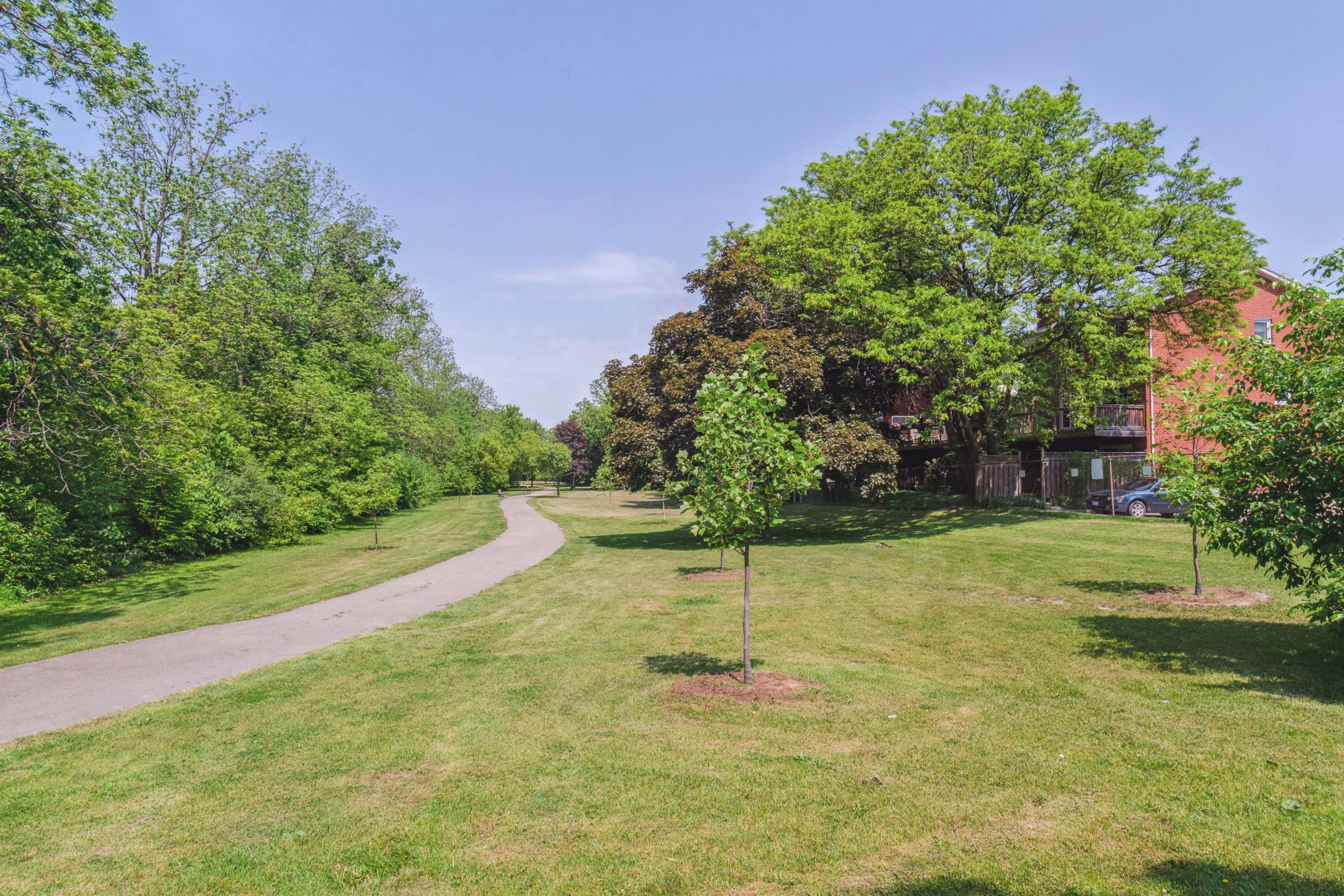 Exceptional opportunity to own a beautiful 3-bedroom executive townhome in the highly sought-after markland wood/centennial park neighbourhood. Nestled in a rarely offered, well-managed complex, this home backs onto a serene park and ravine, offering privacy and scenic views. Featuring hardwood and ceramic flooring throughout, a spacious living room with walkout to a private deck, and a fully finished basement family room with walkout to a fenced yard perfect for entertaining or relaxing. The primary bedroom boasts a walk-in closet and ensuite. Jacuzzi tub in main bath. Enjoy the convenience of an upgraded kitchen with extended cabinetry, pot lights throughout, and ample storage space. Maintenance-free living with snow removal and landscaping provided by the management. Ideally located close to shopping, public transit, centennial park, and top-rated schools.