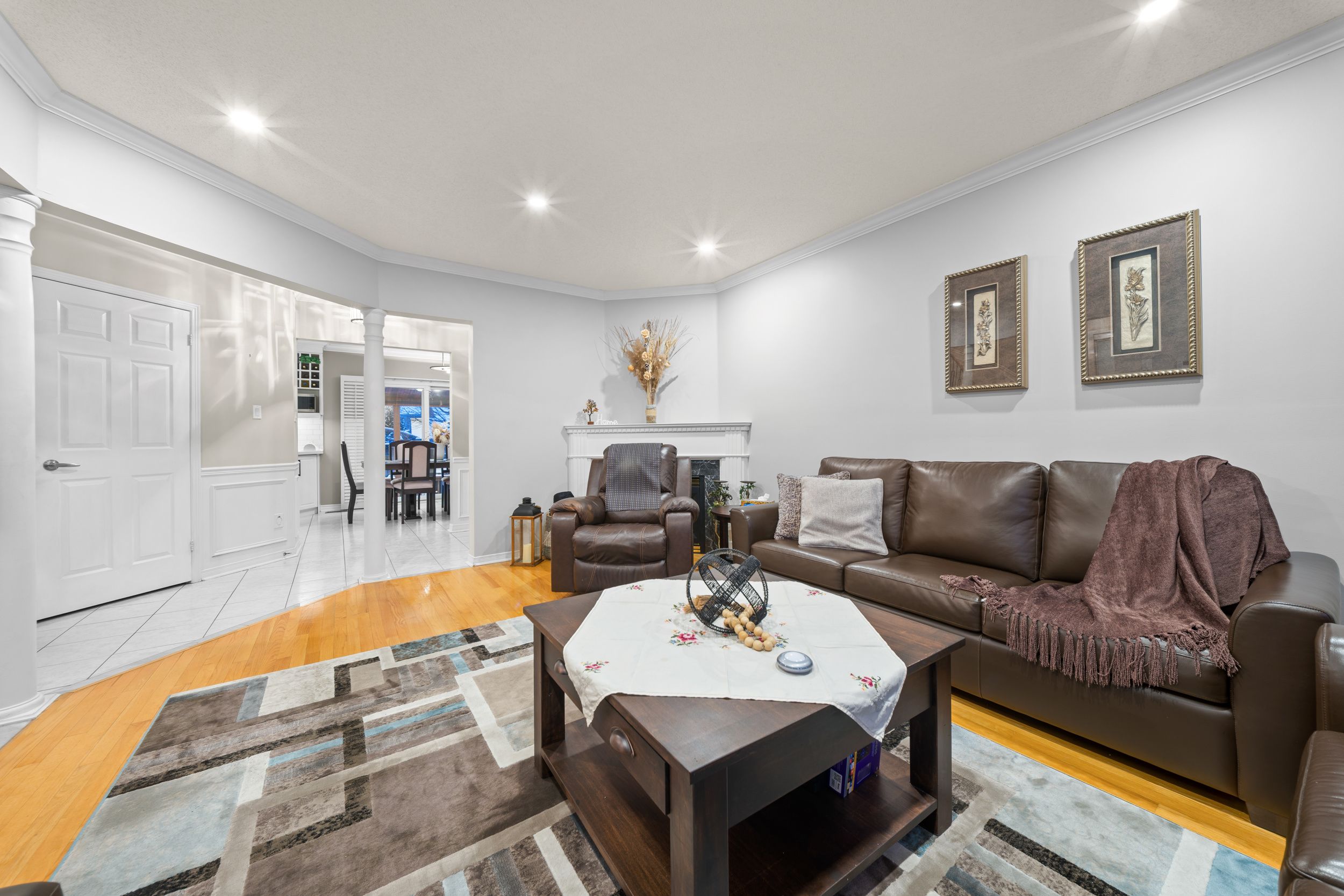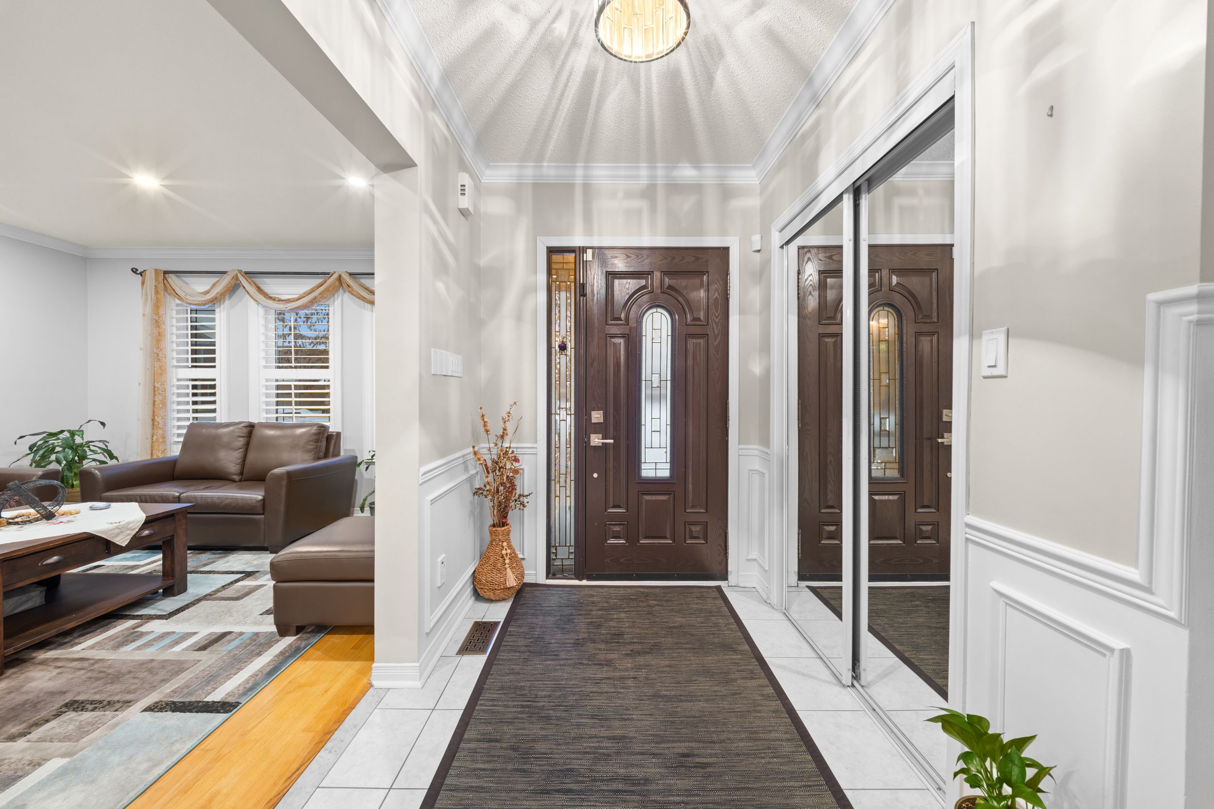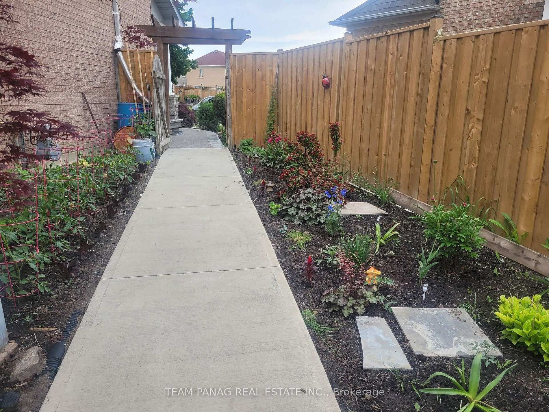 Welcome to this beautifully maintained residence offering thoughtfully designed living space. Blending privacy, comfort, and style - this exceptional home is nestled on a quiet lot. Features a concrete stamped driveway with up to 6 car parking (2 garage, 4 driveway). Step inside to a striking entrance welcomed by an elegant statement chandelier. Pot lights throughout the entire home, including the basement. The main level showcases elegant flooring, a sleek gas fireplace, and a stylish powder washroom, ideal for everyday living and entertaining. Staircases accented with iron pickets add timeless character and durability, complementing both modern and traditional design. The chef-inspired eat-in kitchen impresses with a coffered ceiling, beautiful tile backsplash, countertops, and custom cabinetry. Premium features include a built-in stainless steel refrigerator, gas cooktop, built-in wine rack, and california shutter blinds. The kitchen walks out to an open wooden patio/solarium, flooded with natural light offering panoramic seasonal views. The main-floor laundry room includes a washer, dryer, separate laundry sink, and built-in storage. Upstairs, the spacious primary bedroom offers a walk-in closet and spa-inspired ensuite with a standing glass shower. Additional bedrooms are generously sized. The private backyard is surrounded by trees and features a stunning open-concept patio with wooden beams, pot lights, and a warm, cozy ambiance. The fully finished basement includes pot lights throughout and a dedicated kitchen, ideal for extended family or separate entertaining. Major updates include roof, windows, exterior doors, air conditioning, and furnace, all replaced within the past five years. Kitchen appliances are also less than five years old. Freshly painted, this move-in-ready home is minutes from hwy 410,trinity common mall, parks, and top-rated schools-offering space, elegance, and lasting value in one of brampton's most sought-after neighborhoods.