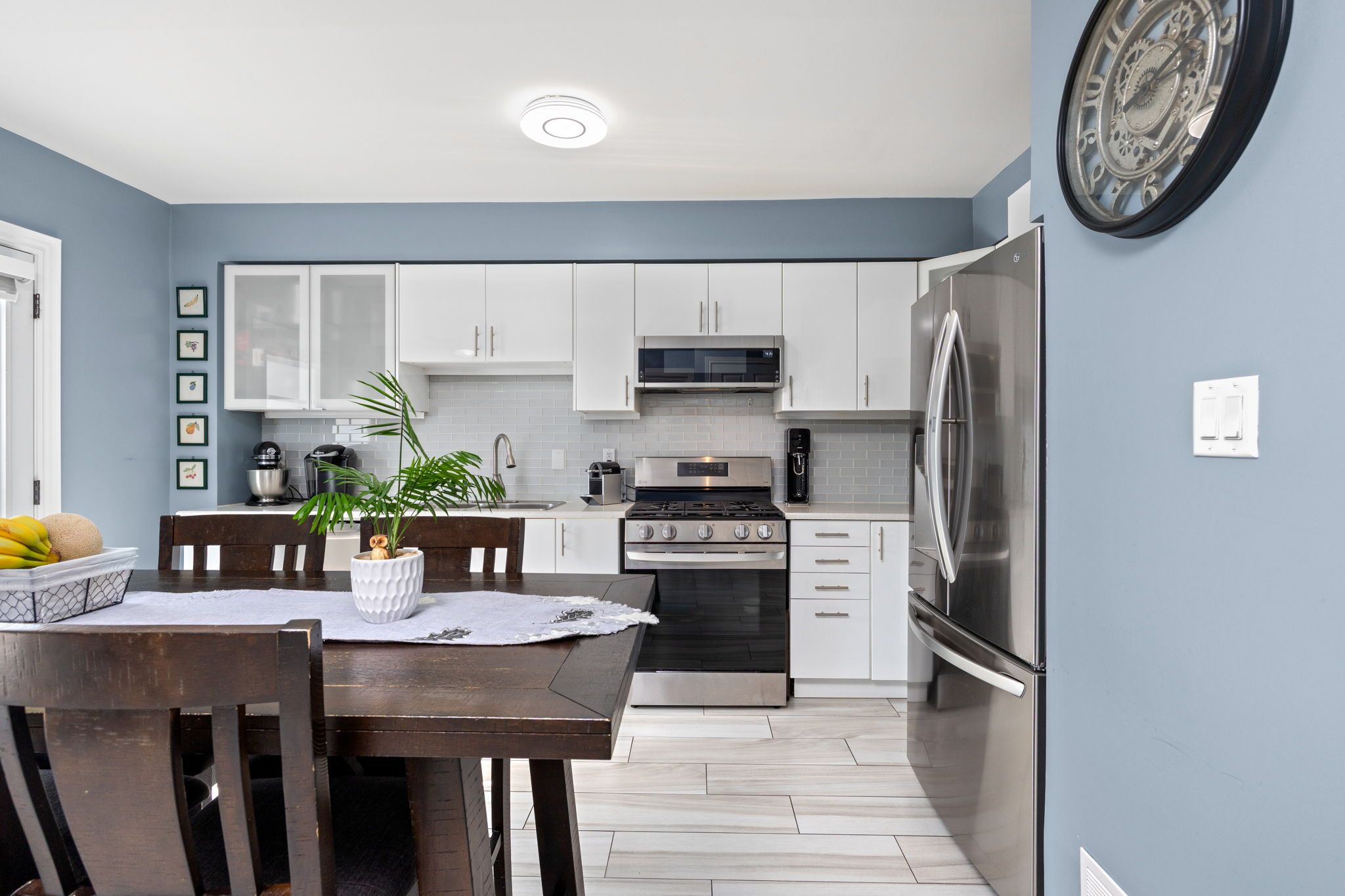 • Modern kitchen features stainless steel appliances and ample cabinetry.