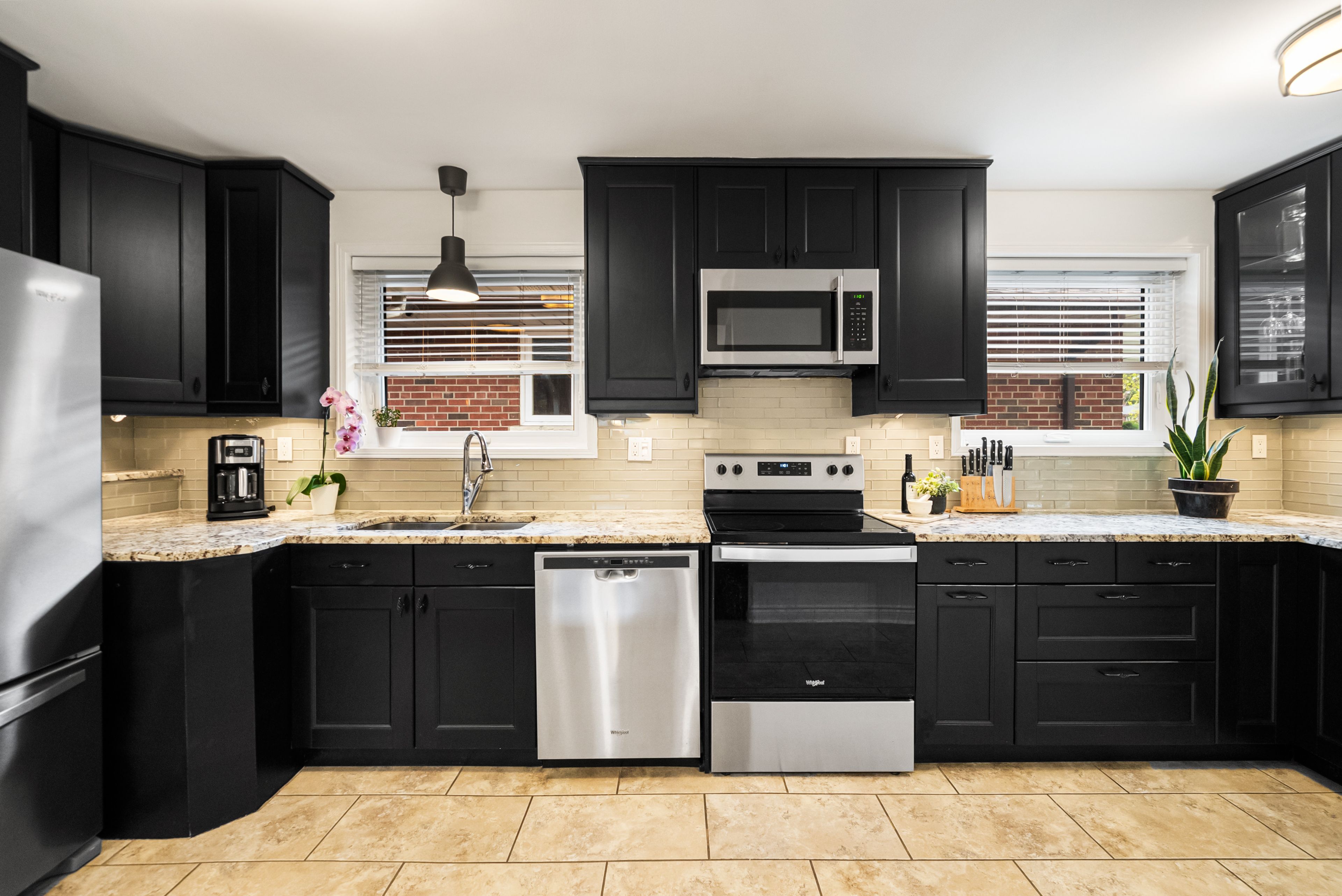 • Large chef's kitchen with stone counters and easy access to a private deck.
