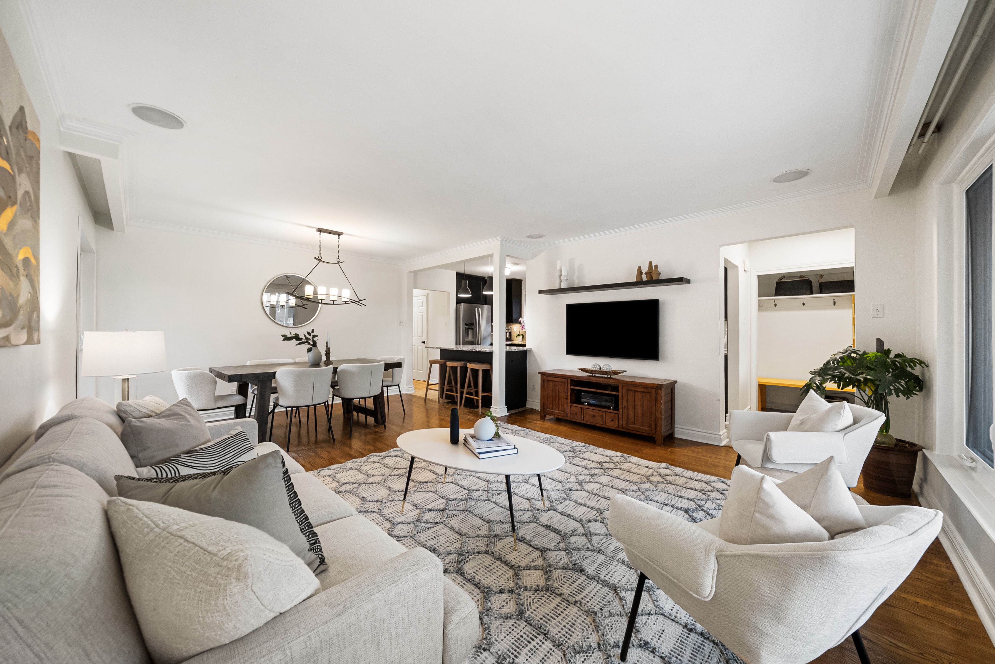 • Open concept living and dining spaces with built-in speakers and hardwood floors.