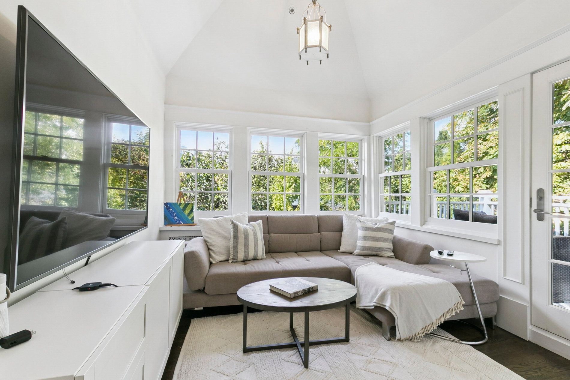 • Cozy living room with wood-burning fireplace and plenty of natural light.