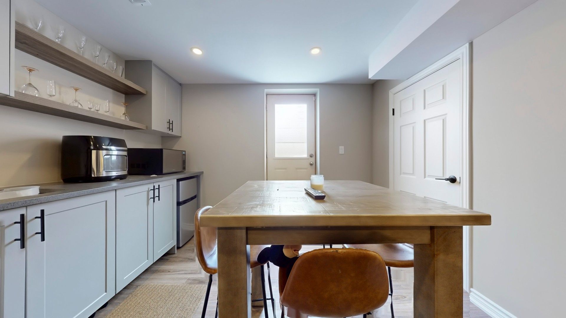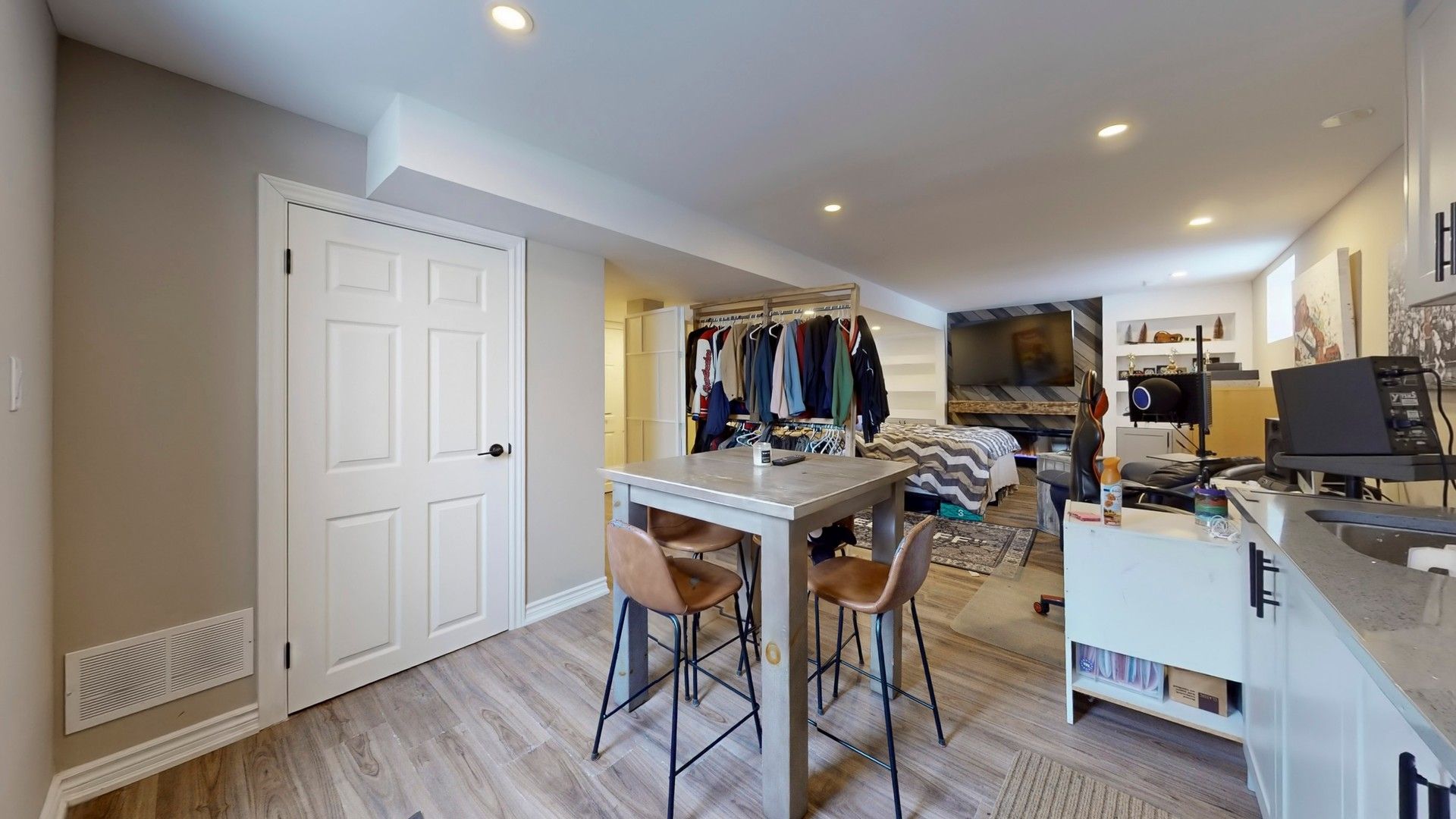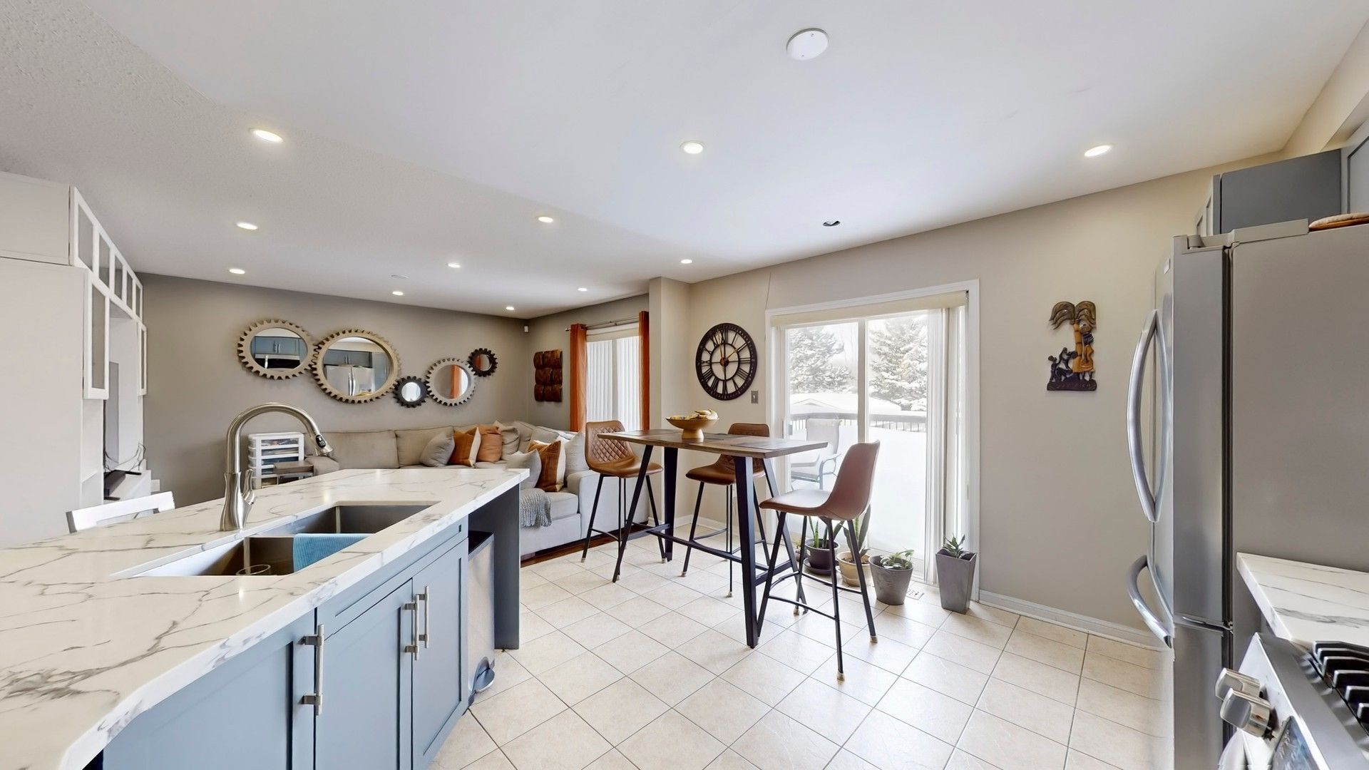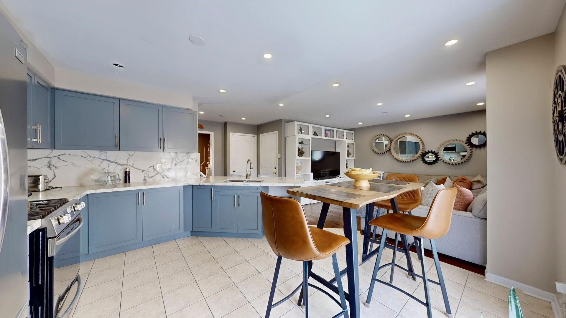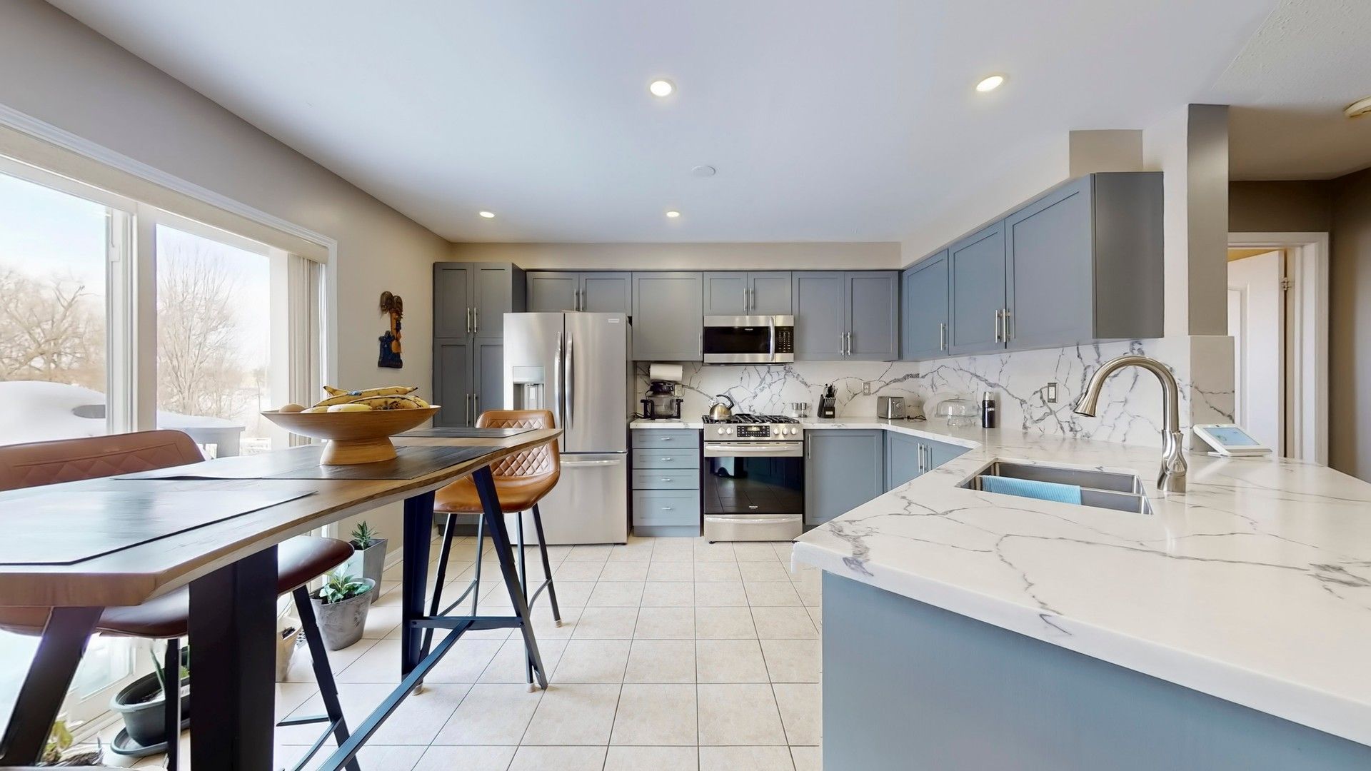 • Open-concept layout with spacious kitchen and quartz countertops.