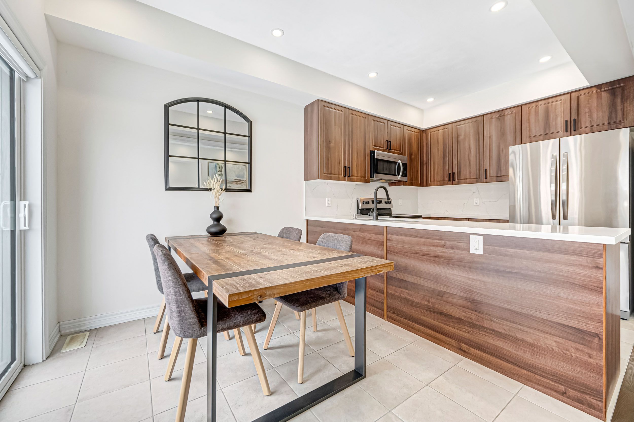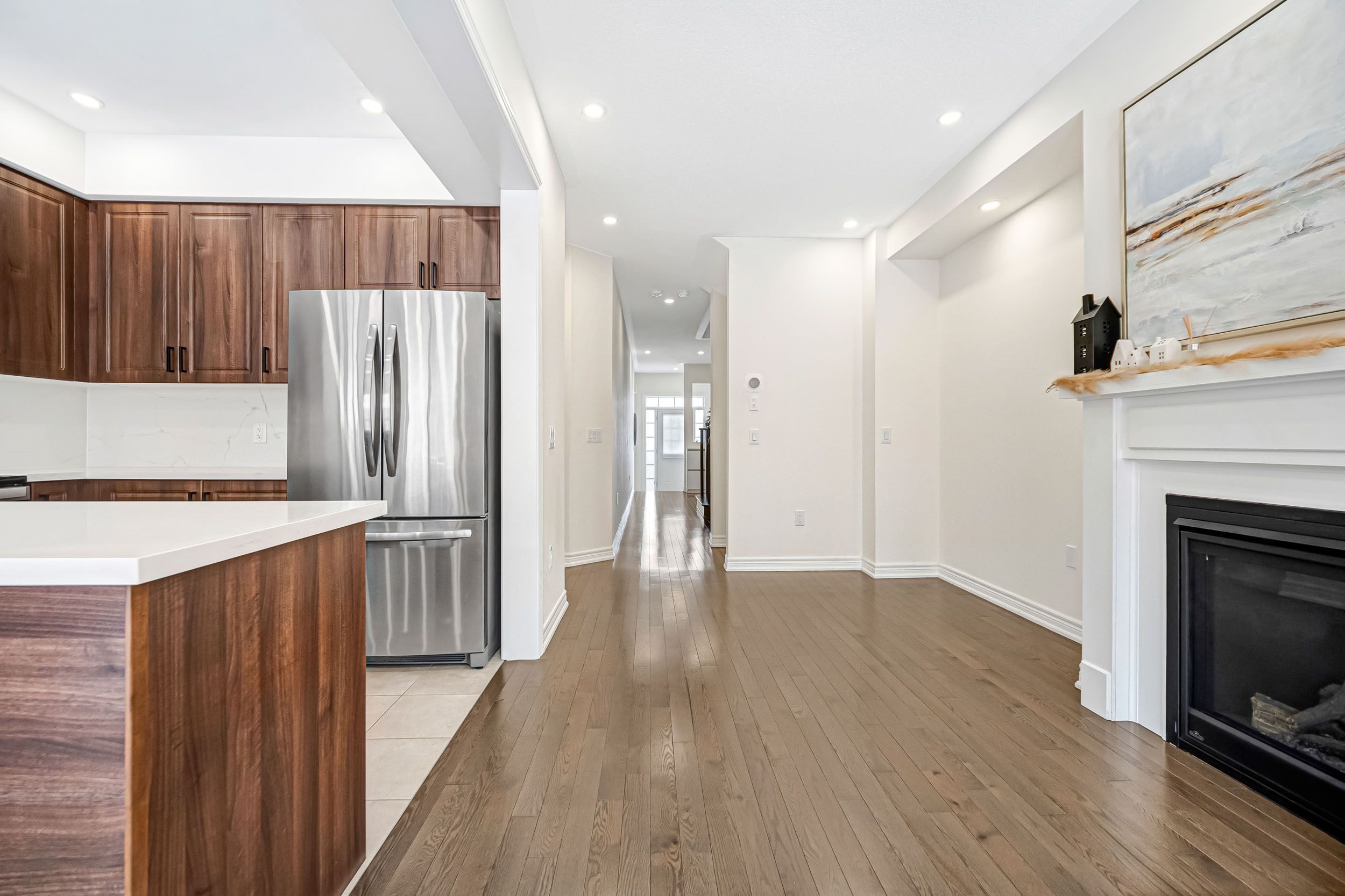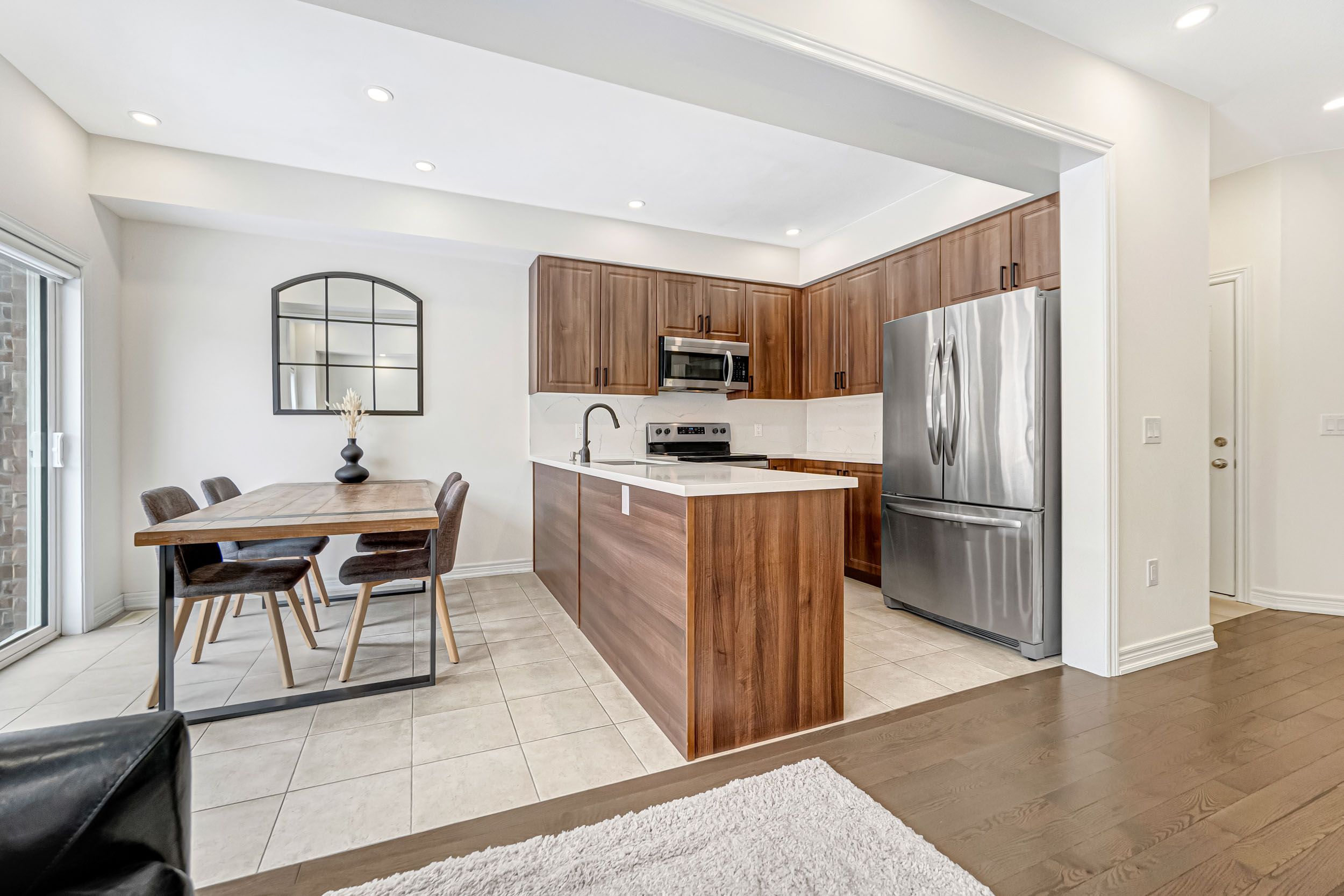 • Bright, open-concept townhouse with 9-foot ceilings and hardwood flooring.