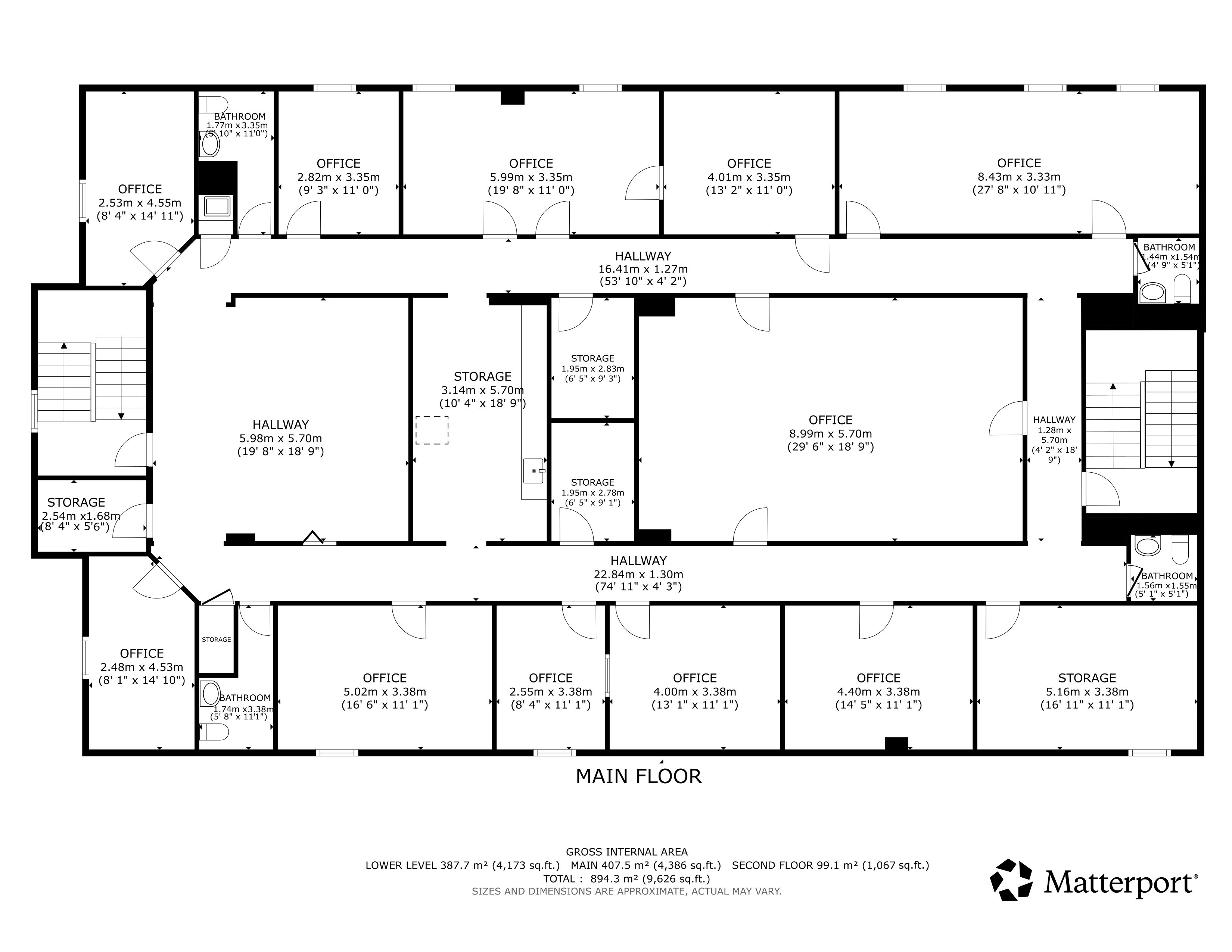 • Includes 9 washrooms and various office options.