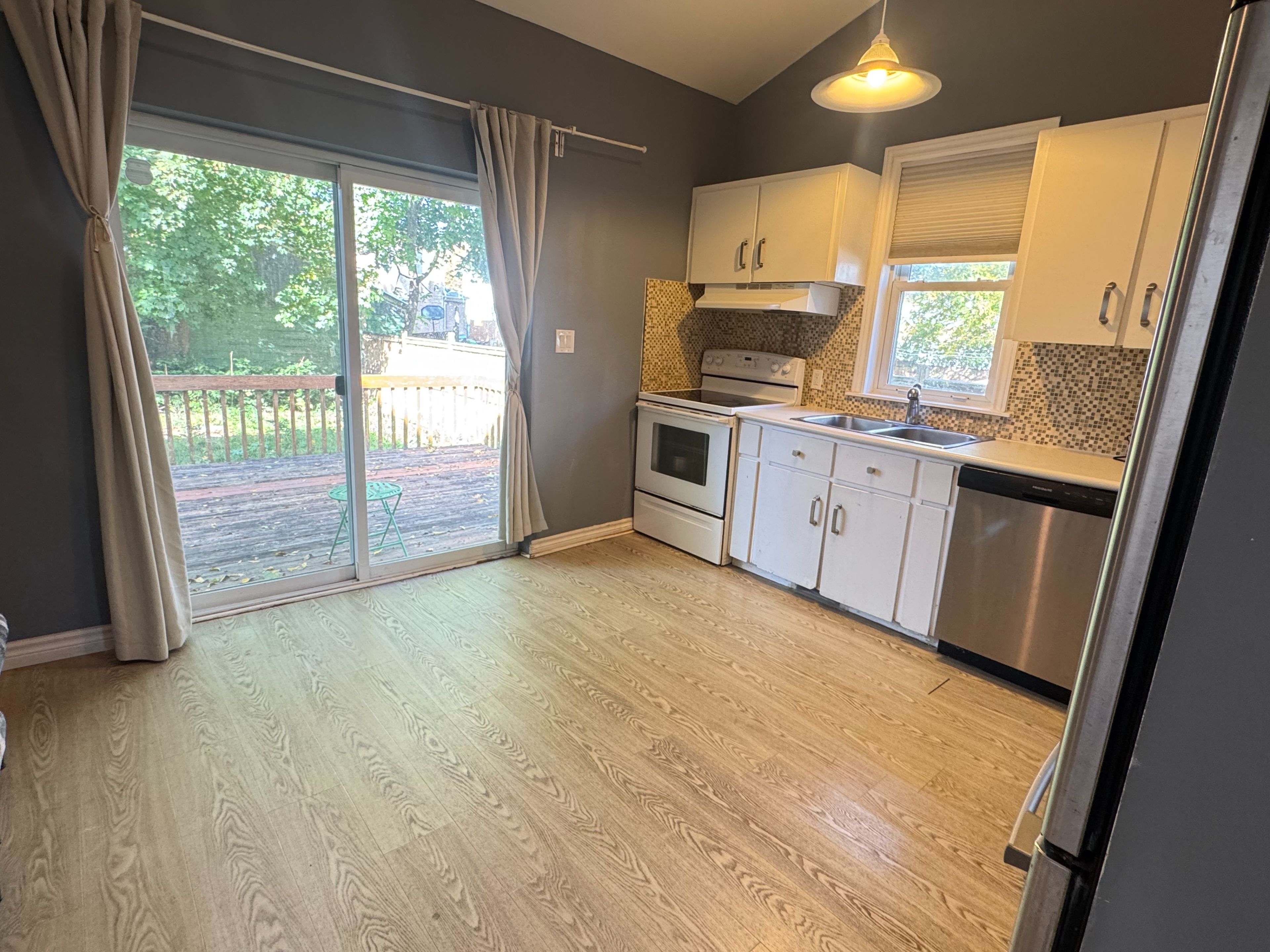 • Private fenced yard with deck, great for summer BBQs.