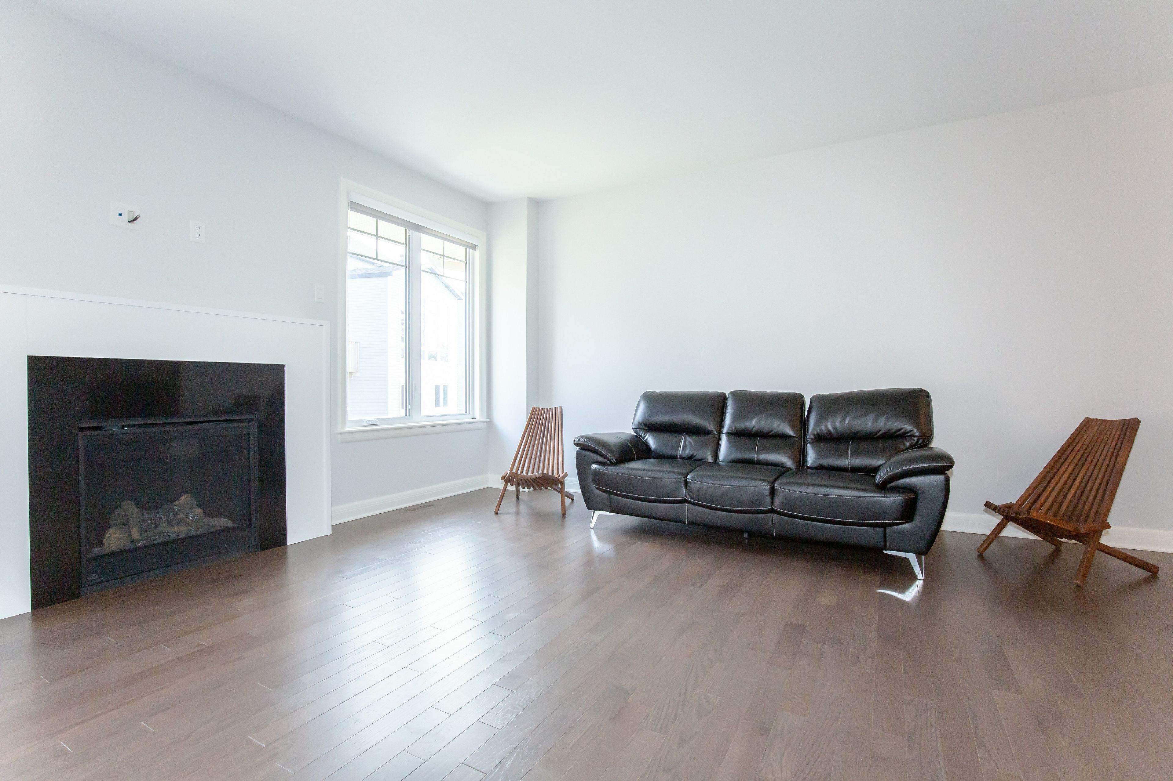 • Spacious living room with large windows and a cozy fireplace.