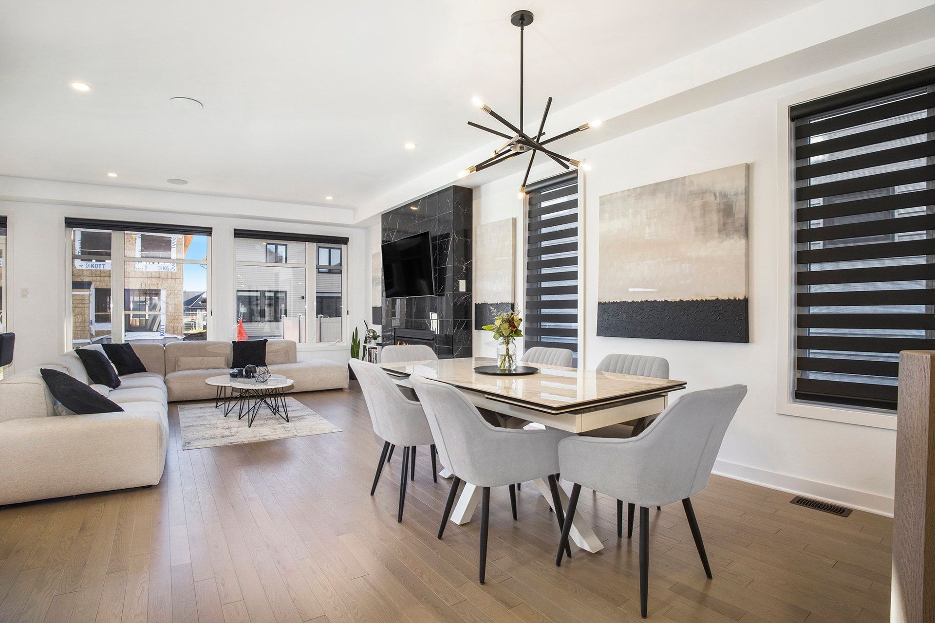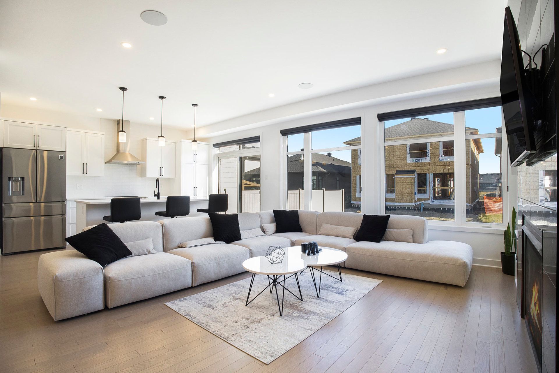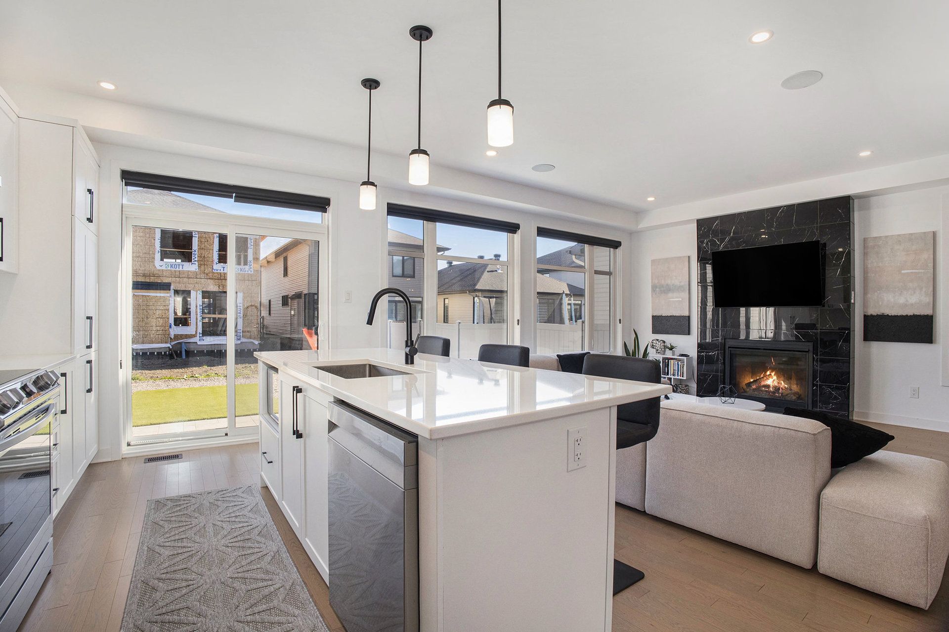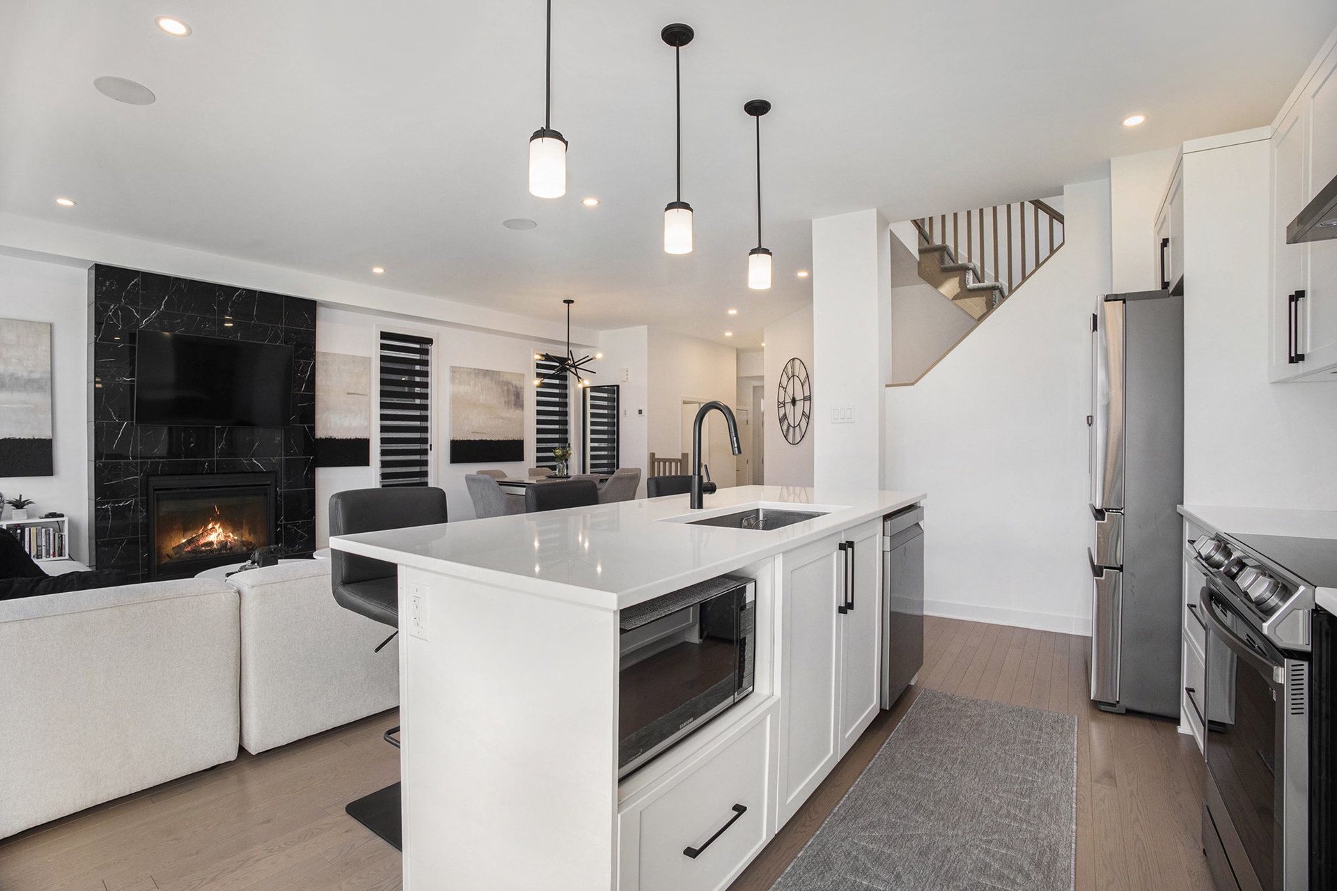 • Spacious open-concept main floor with a chef-inspired kitchen and gas fireplace.
