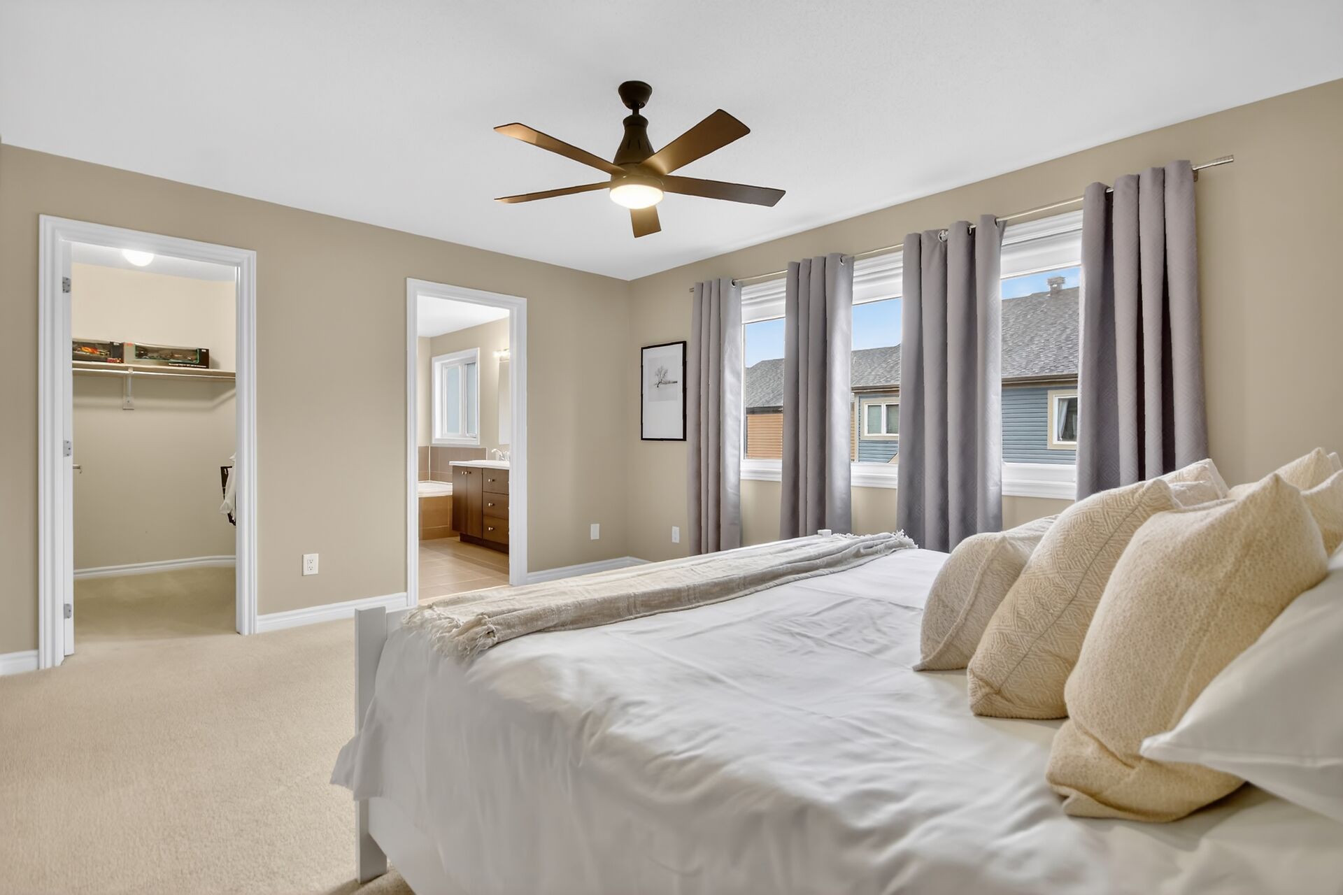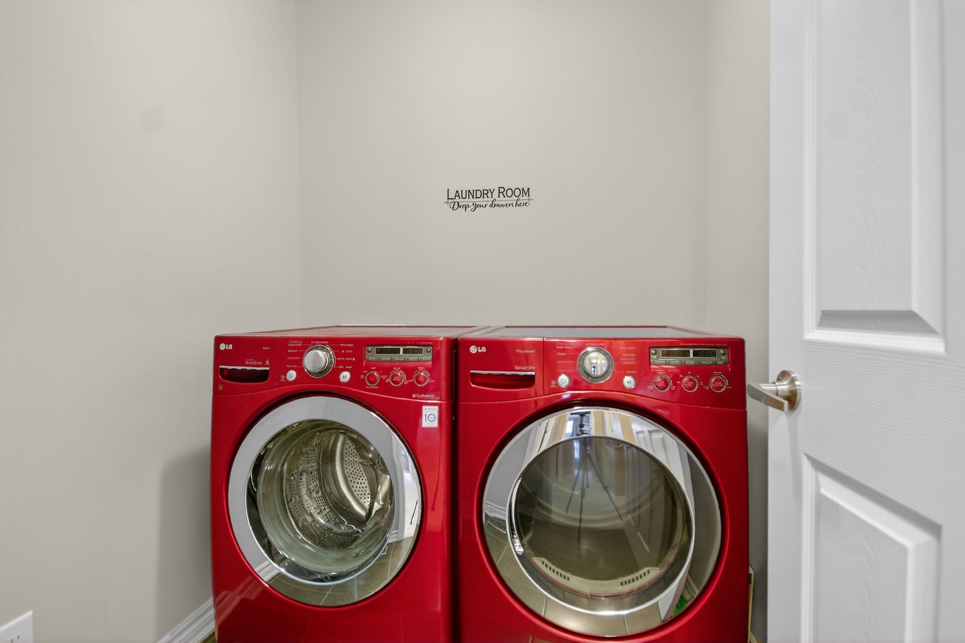 • Spacious kitchen with quartz counters, stainless steel appliances, and breakfast bar.