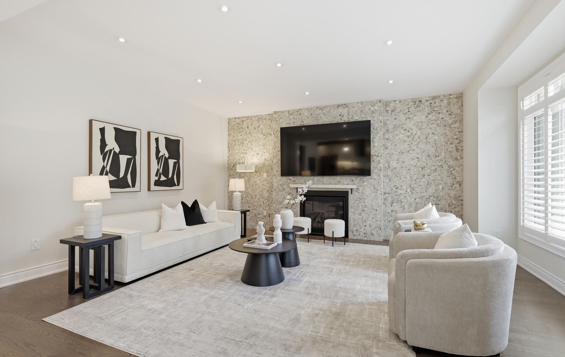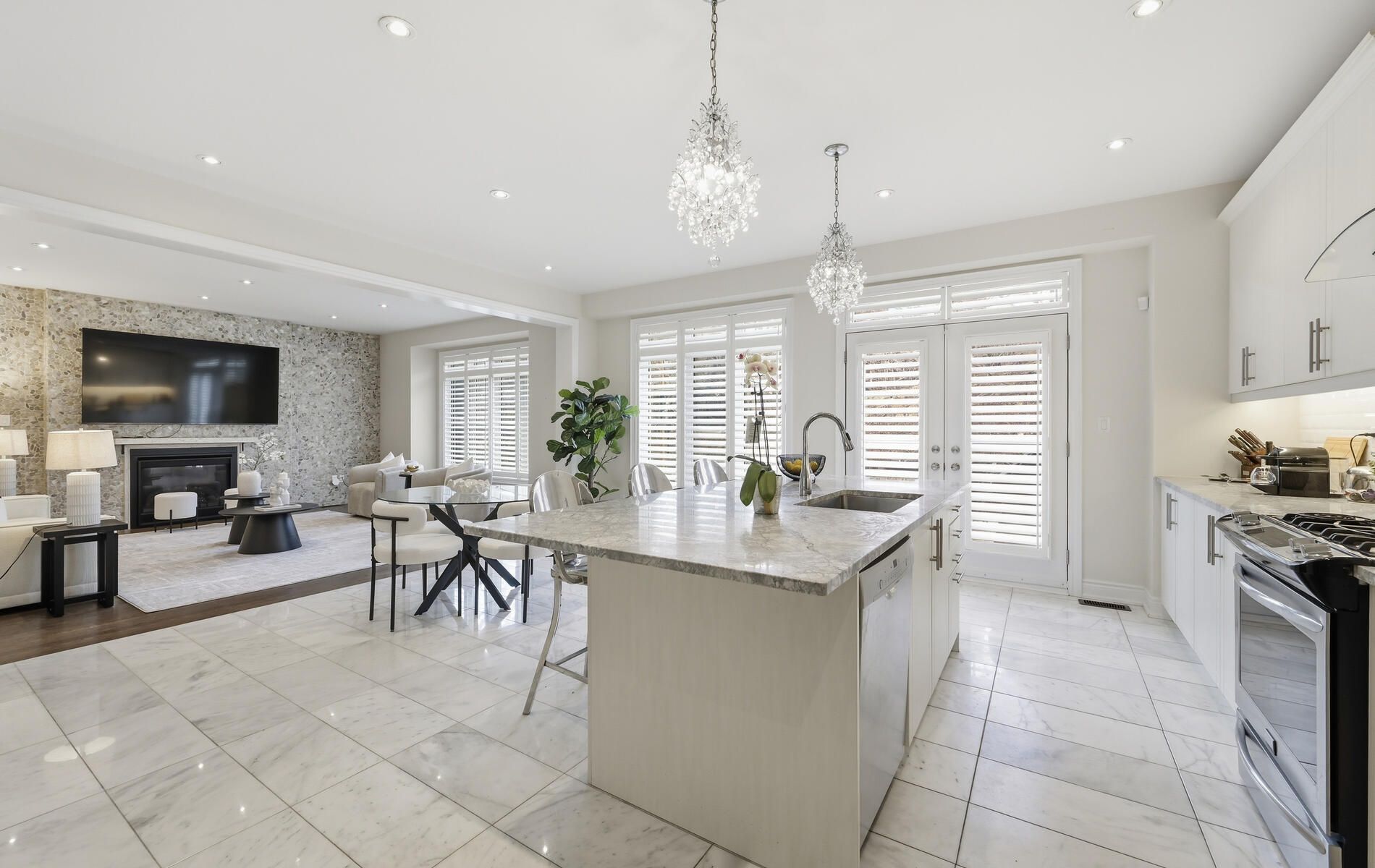• Cozy family room with a gas fireplace and large windows.