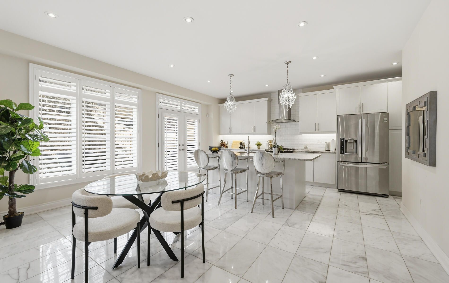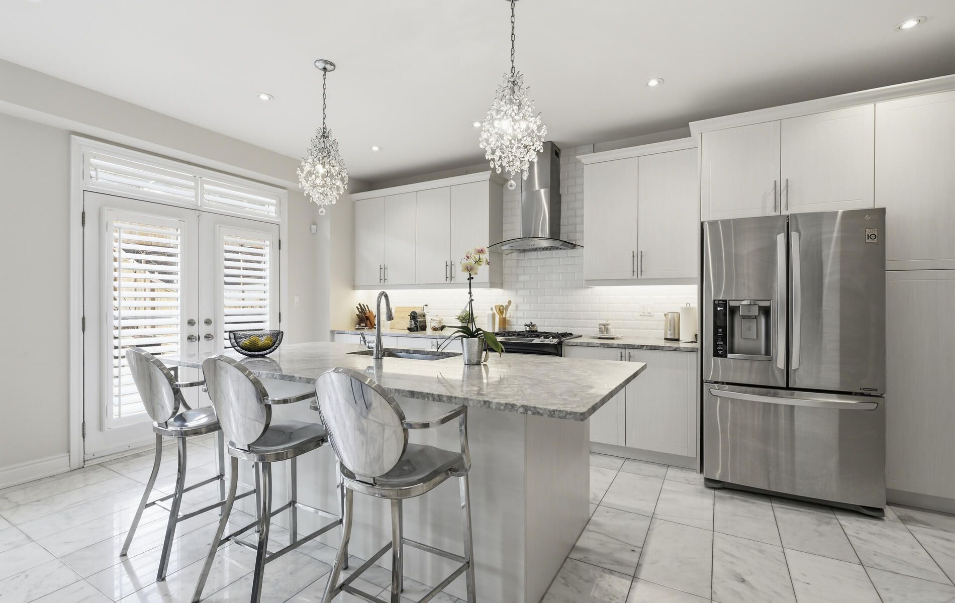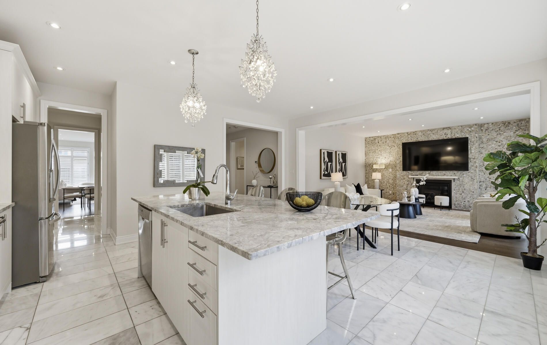• Modern kitchen with stainless steel appliances and walk-through pantry.