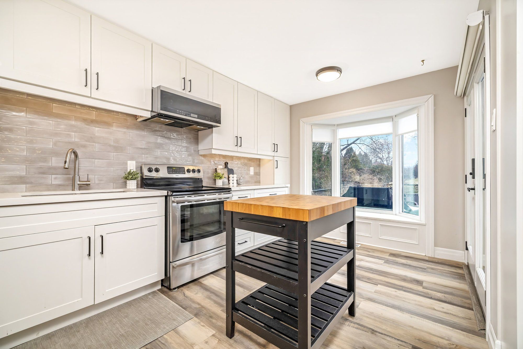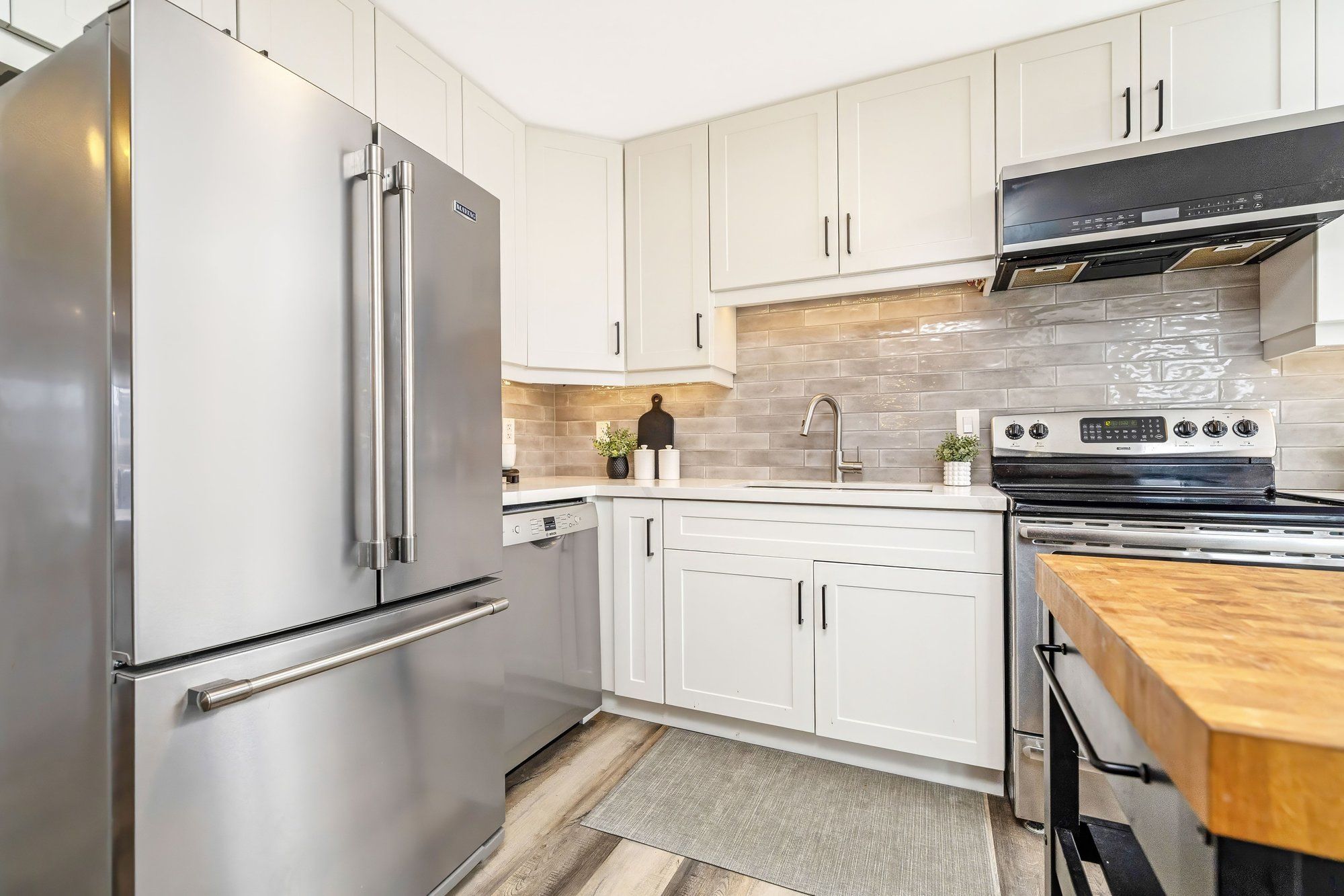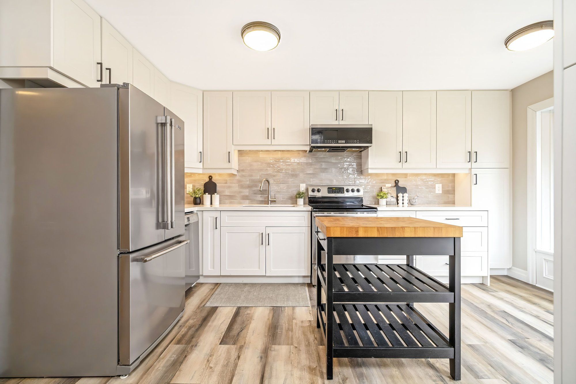 • Modern open concept kitchen with stainless steel appliances and quartz counters.