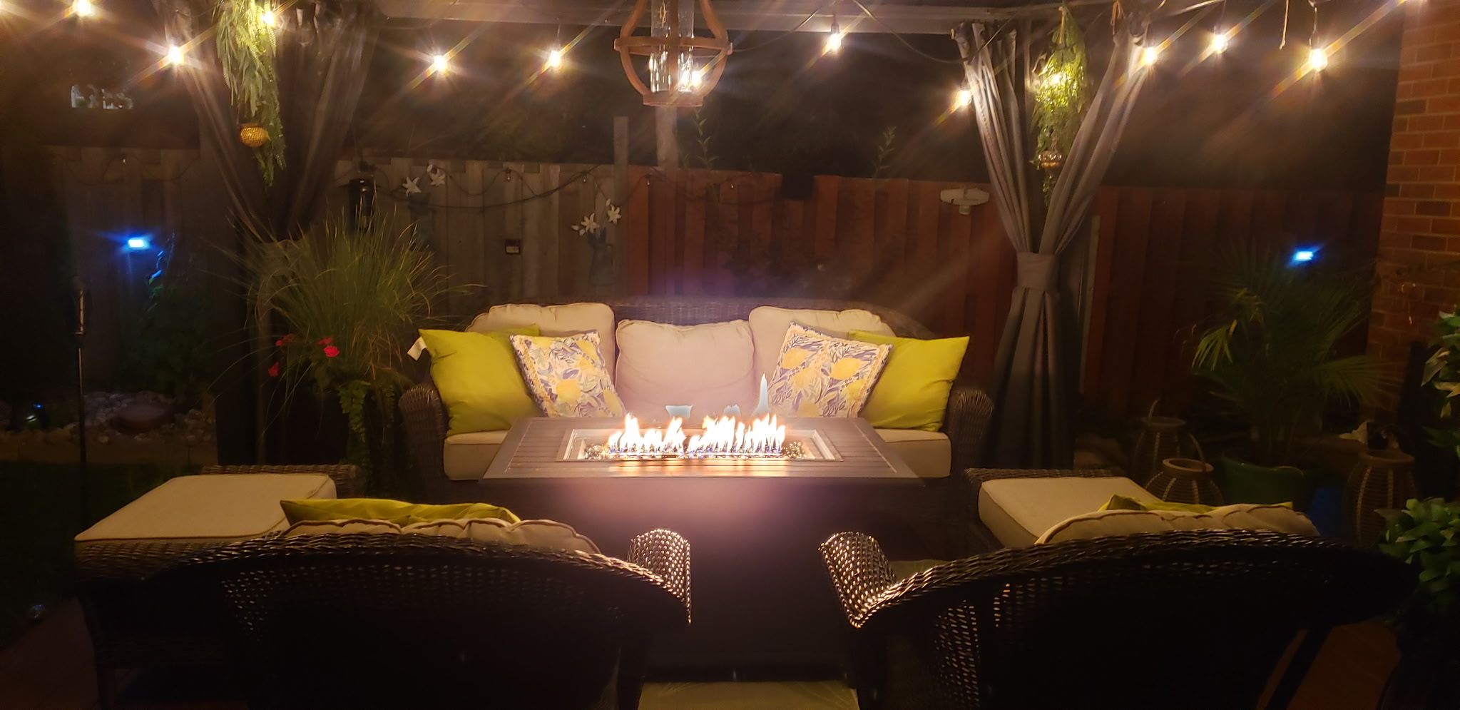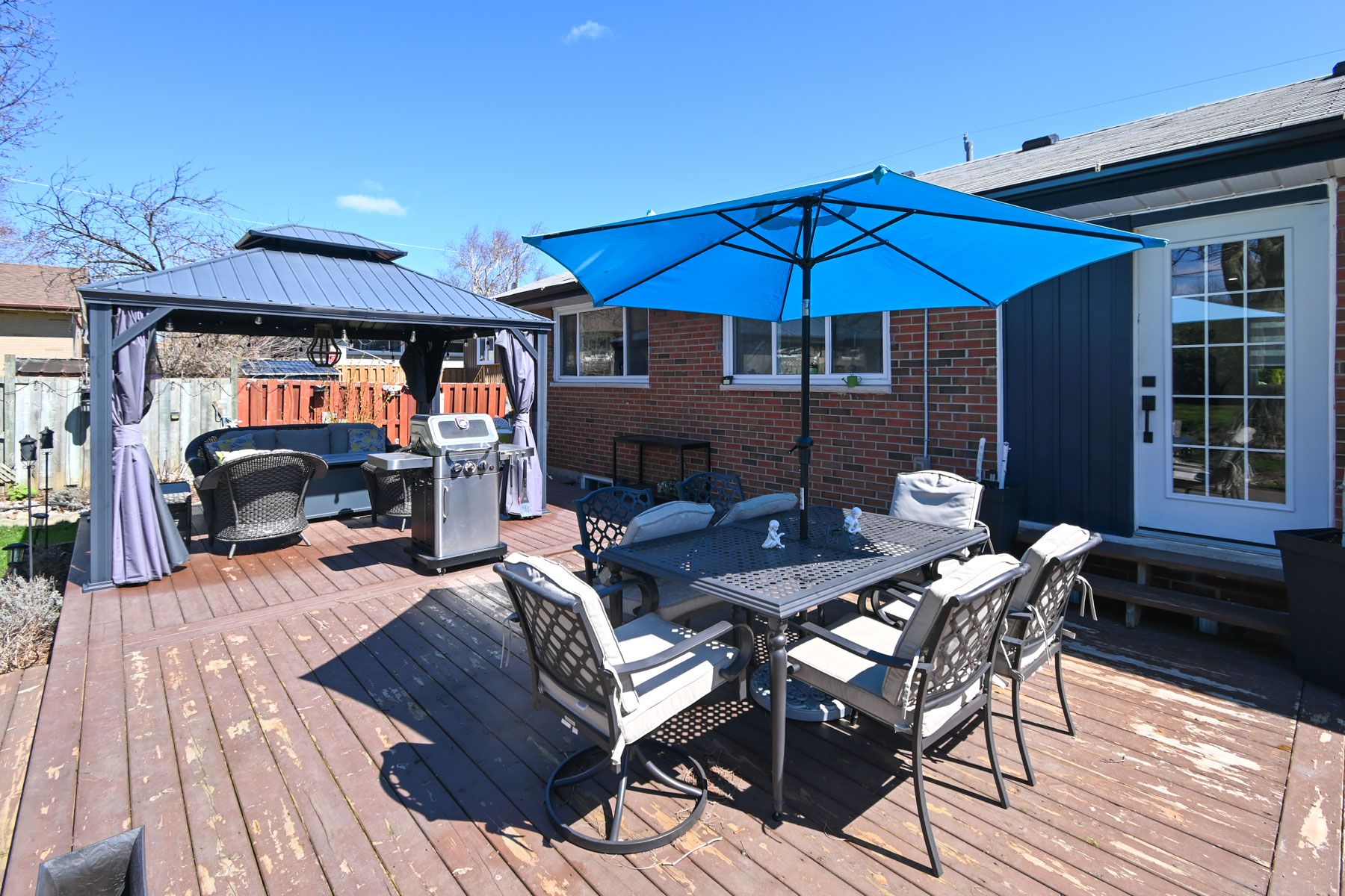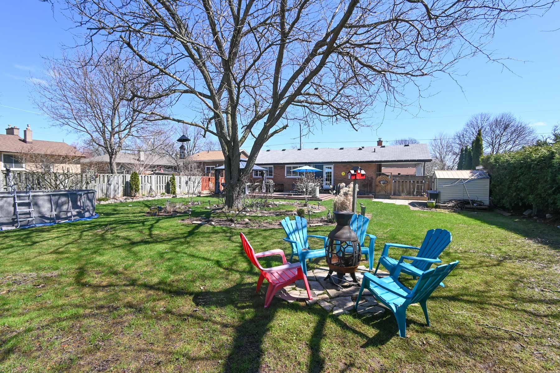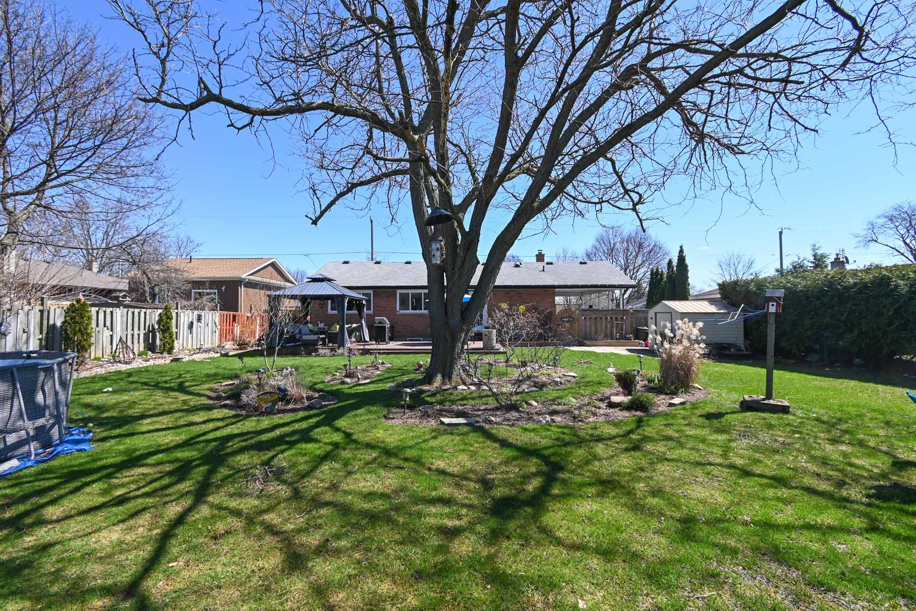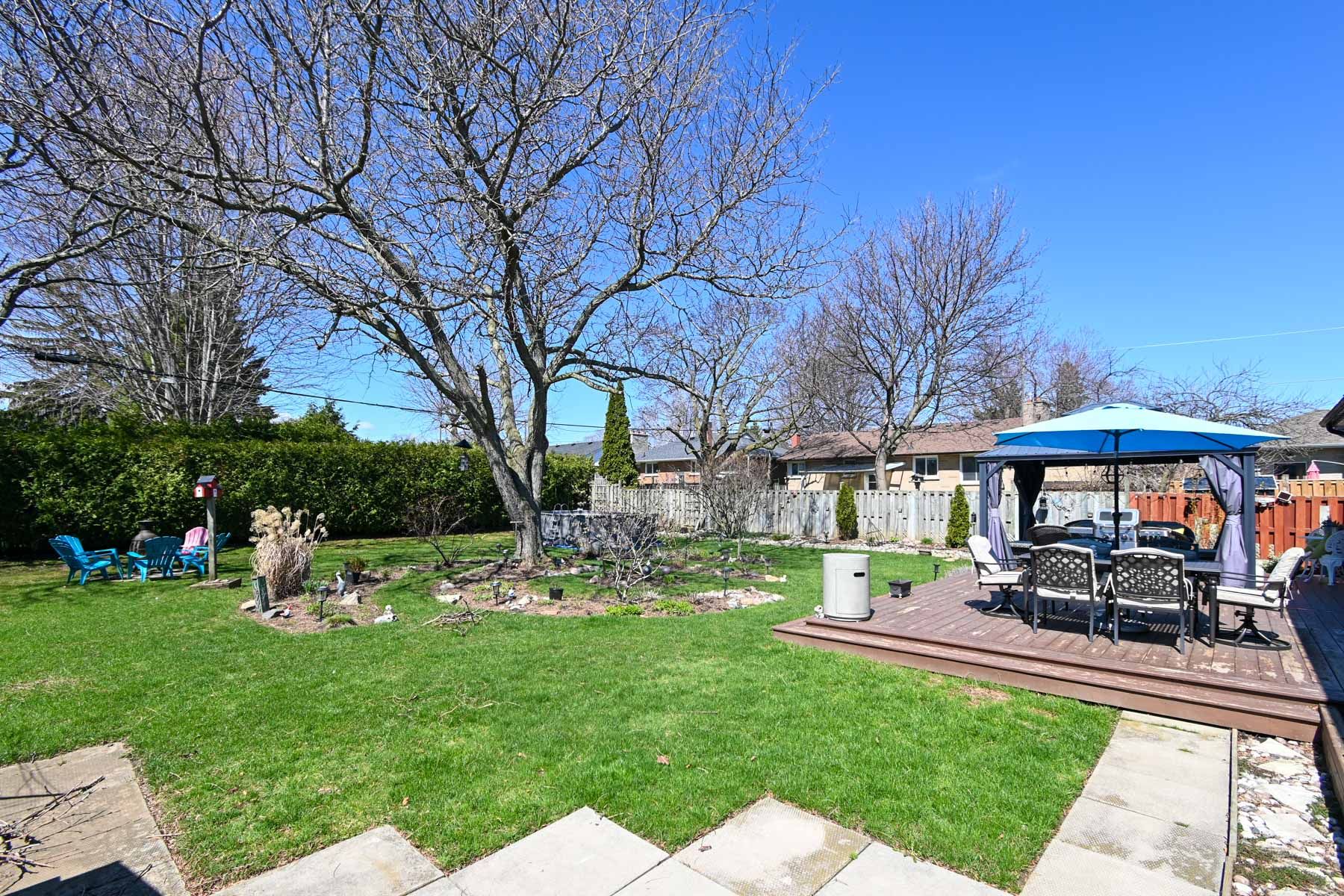 • Treed yard with gazebo, deck, fire table, and garden space.