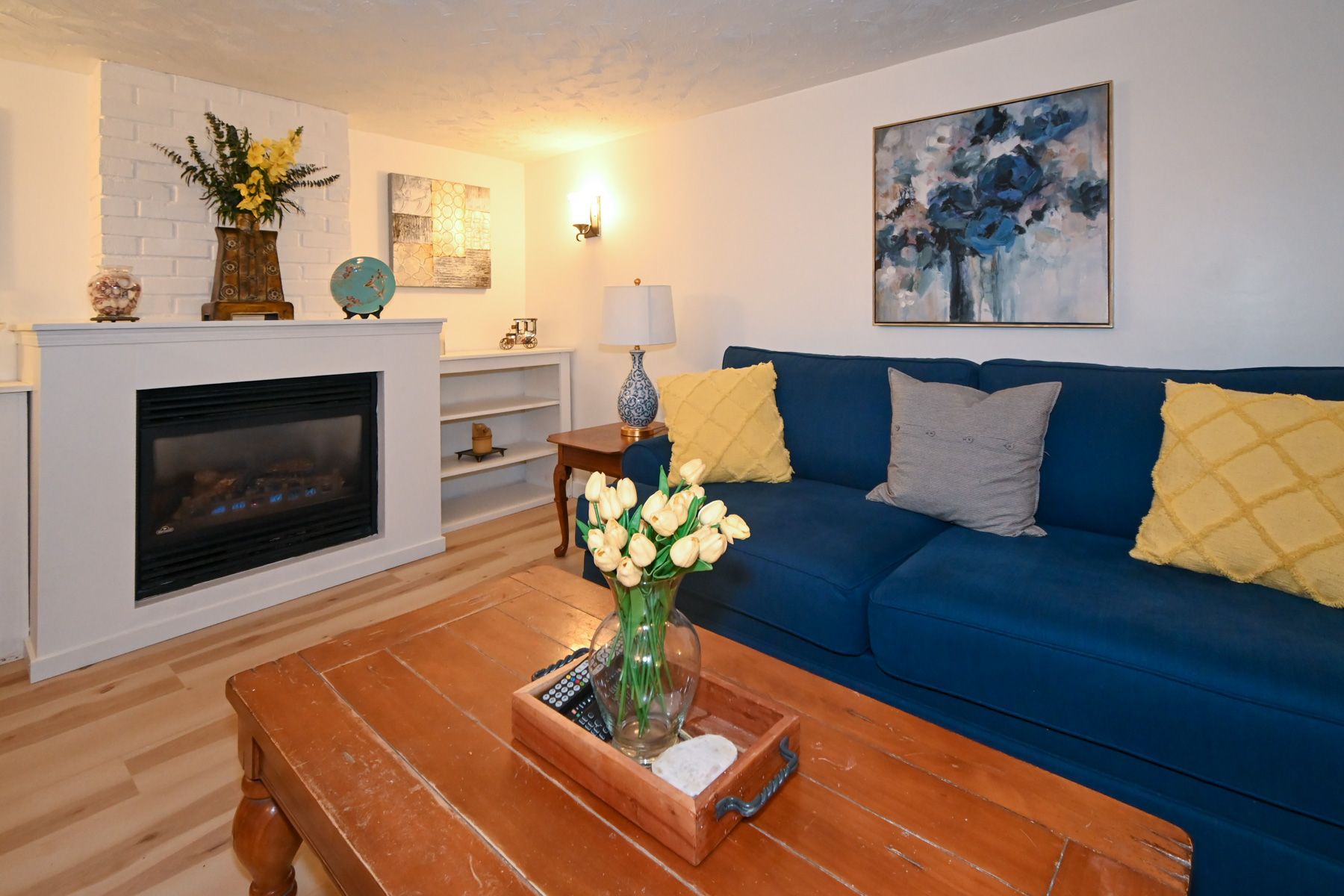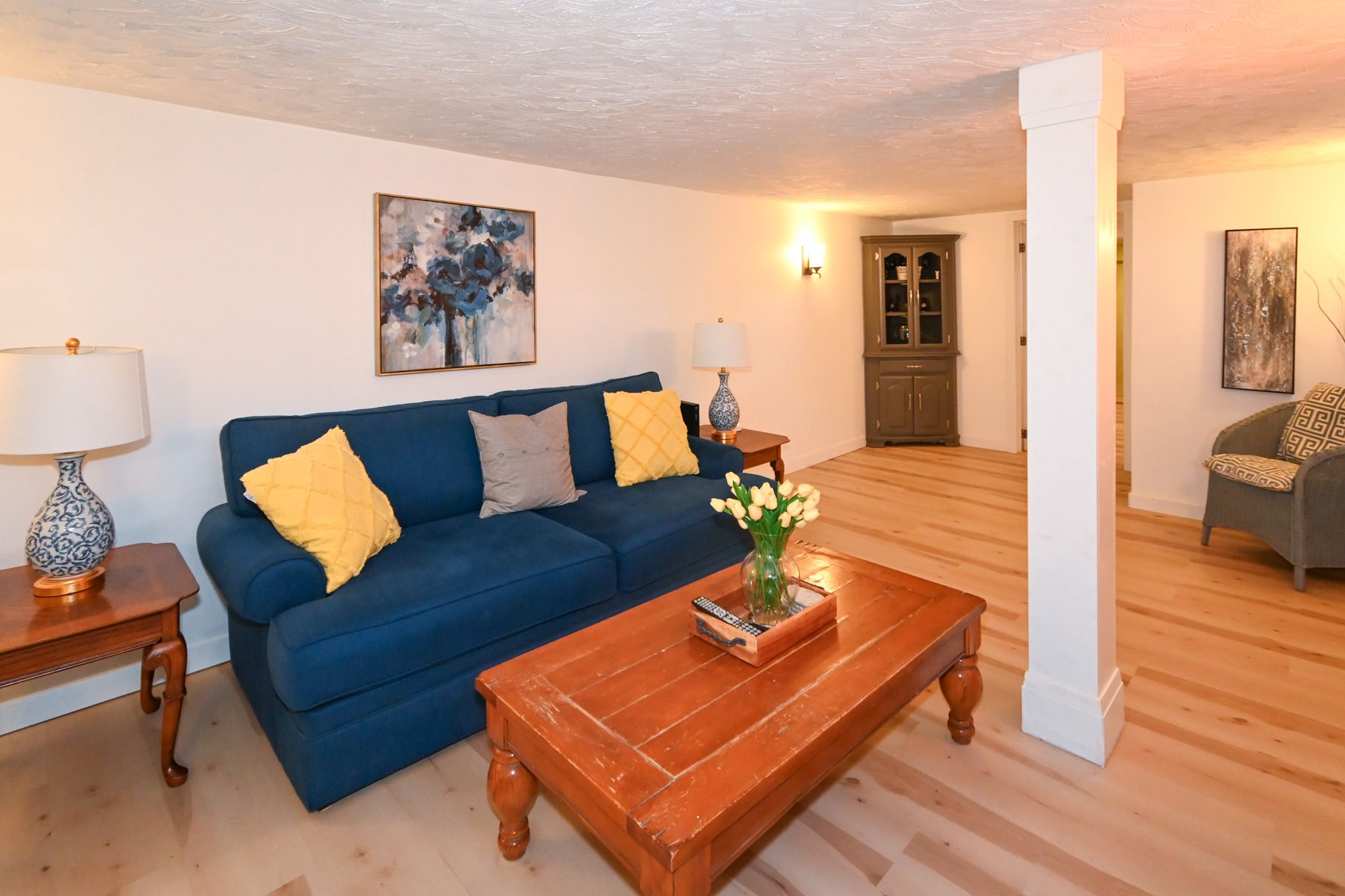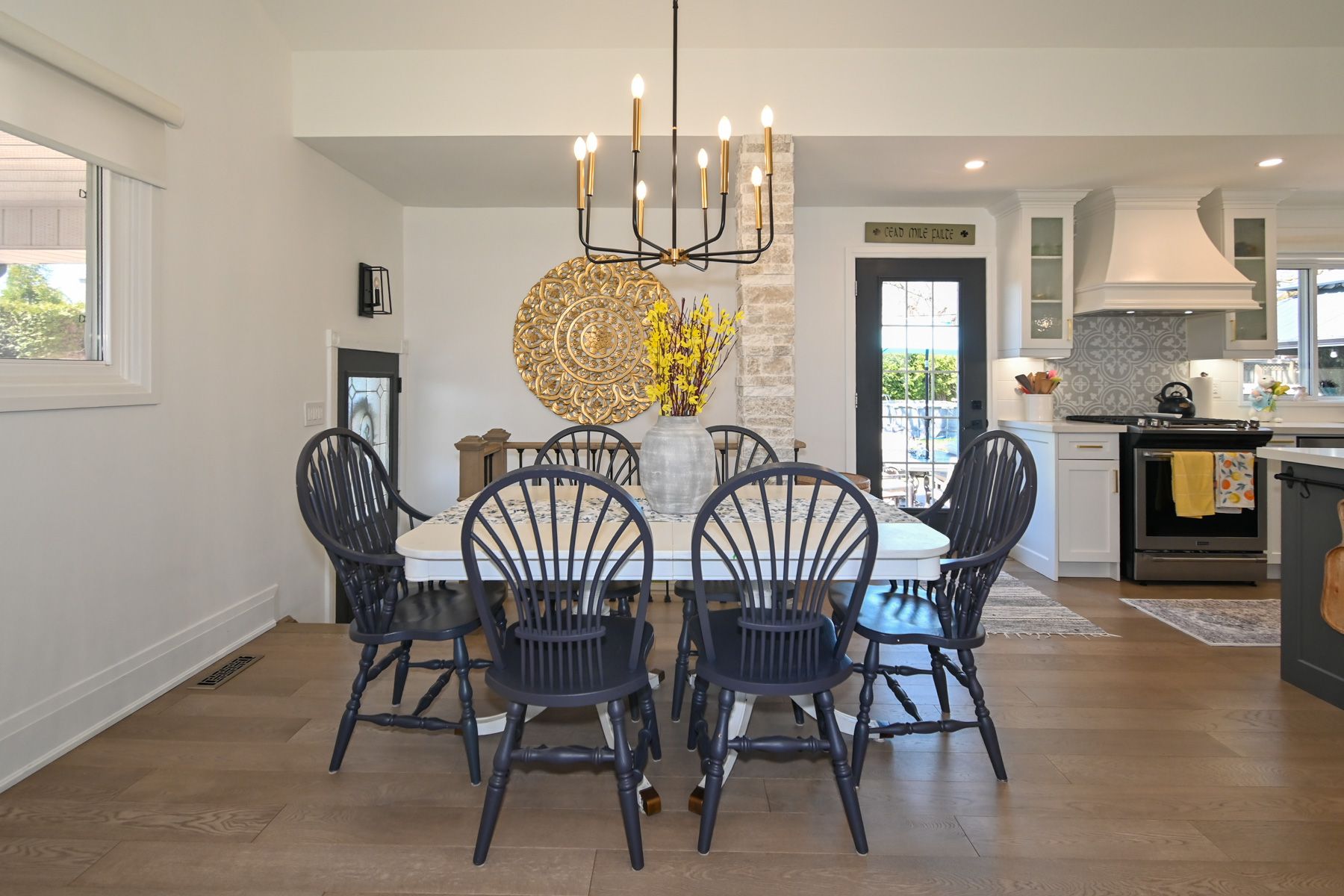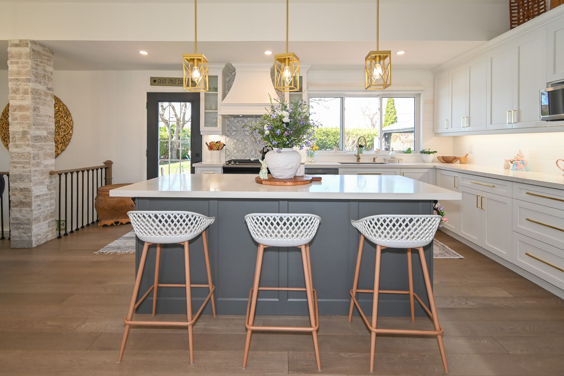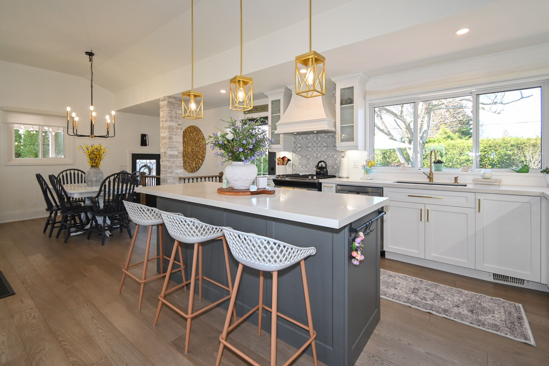 • Open living space with a modern farmhouse style kitchen and large island.