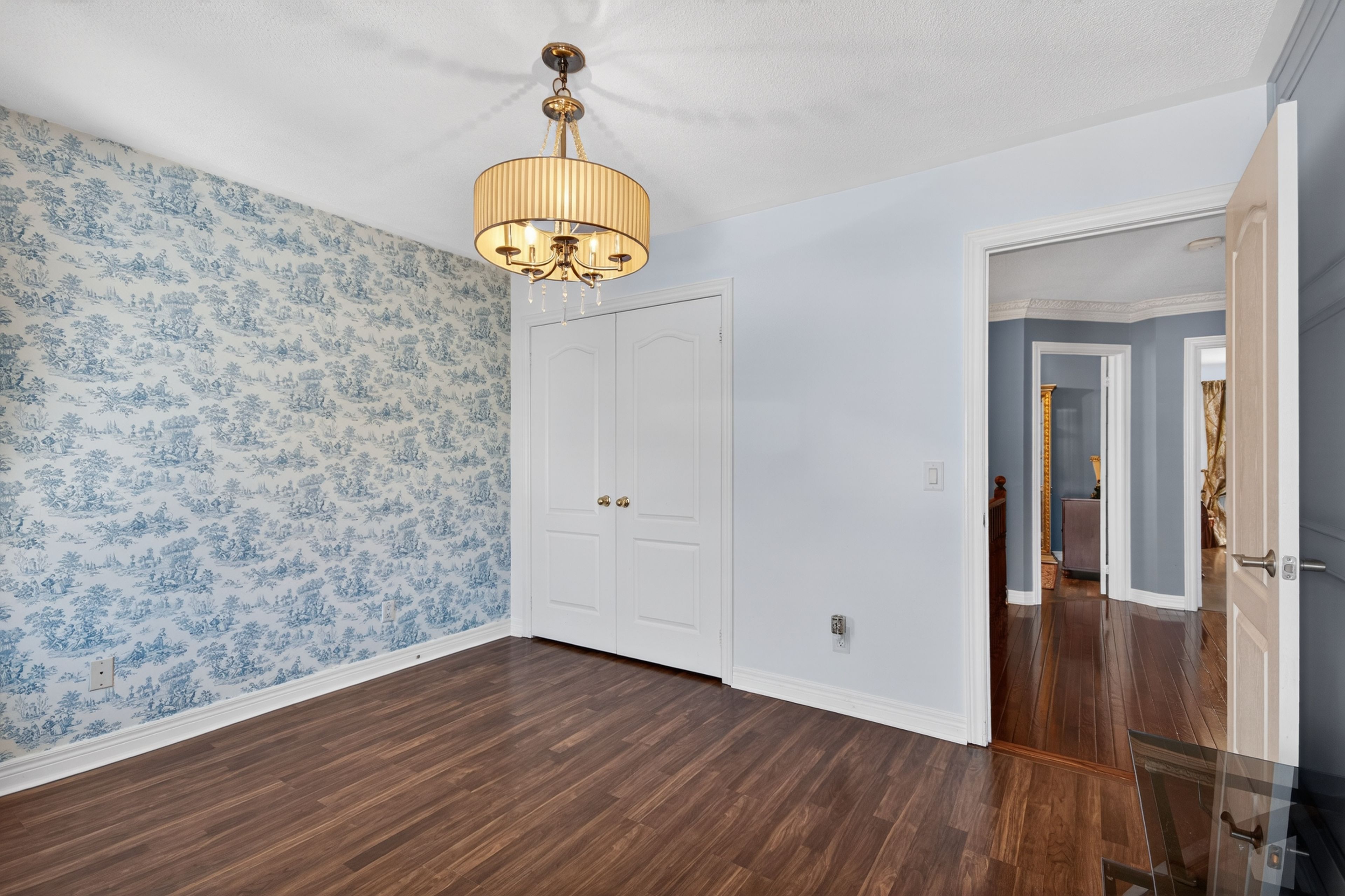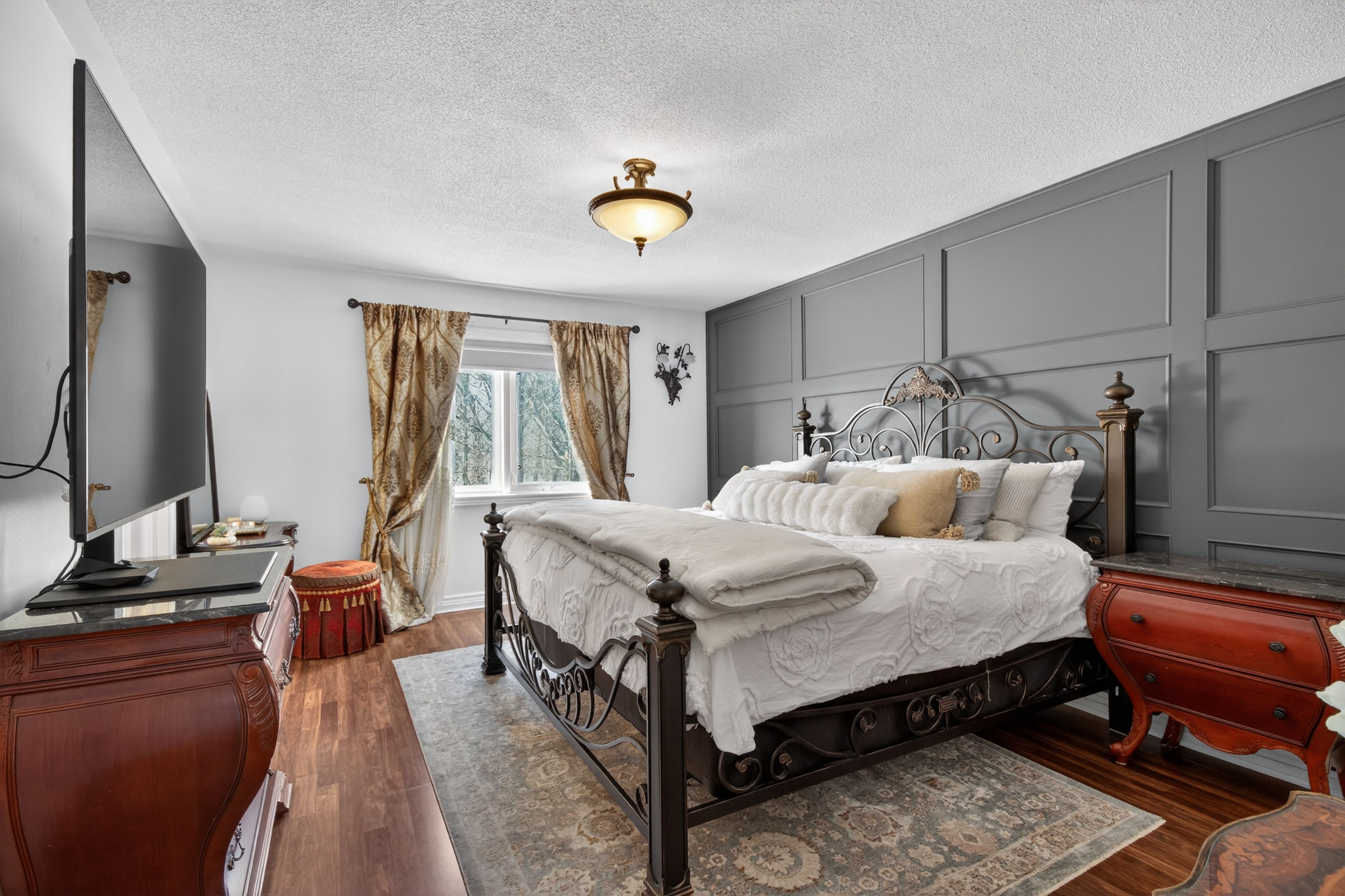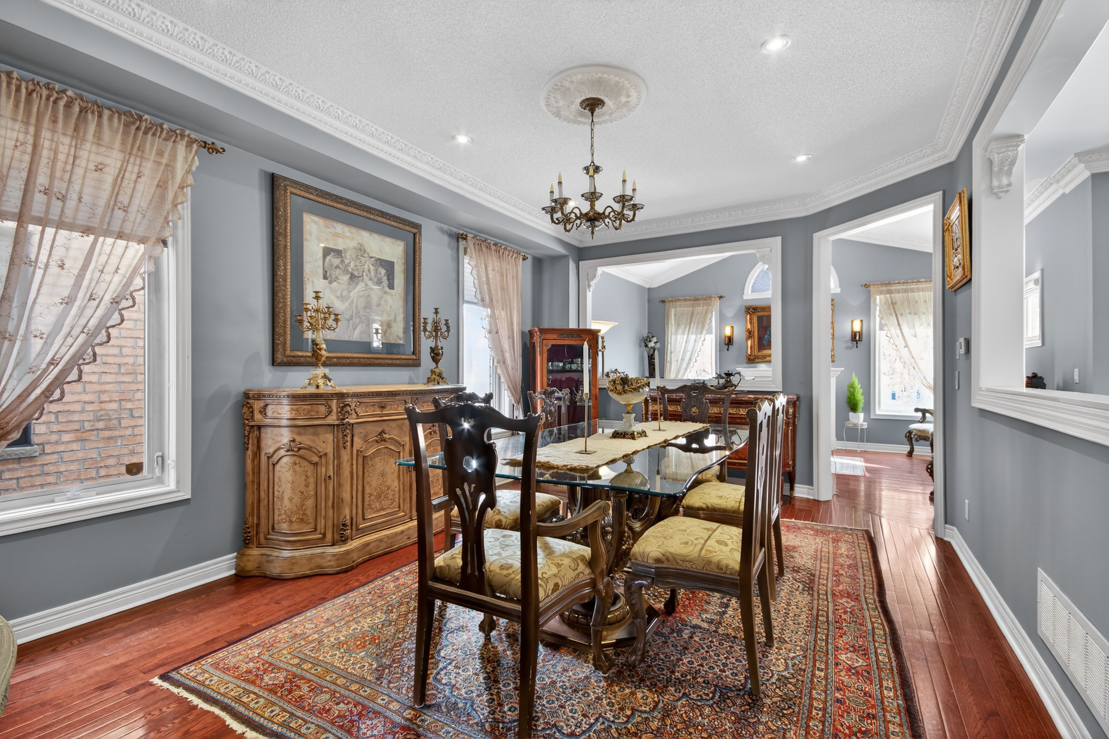 Welcome to one of the most private and beautifully maintained homes in churchill meadows. Set on a premium lot backing directly onto mature forested greenspace, this 4-bedroom, 4-bathdetached residence offers over 3000 sq ft of living space including a fully finished lower level designed for both comfort and entertaining. From the moment you step inside, the pride of ownership is unmistakable. Rich hardwood floors, crown moulding, pot lights and thoughtful upgrades throughout create a home that feels refined yet warm. The custom kitchen features granite counters, tile backsplash, stainless steel appliances and walkout access to a composite deck complete with a full retractable awning - the perfect space for summer dinners, weekend bbqs, and quiet evenings overlooking the treed backdrop. The cathedral-ceiling family room with gas fireplace and oversized picture windows fills the home with natural light while framing the private backyard views. Upstairs, four generous bedrooms offer space for a growing family, including a primary retreat with walk-in closet and 5-piece ensuite. The finished basement feels anything but below grade thanks to the luxurious finishes, extended windows, a 3-piece bath and ample space for recreation, fitness or media enjoyment. The professionally finished 2-car garage with tiled floor and paneled walls adds both function and polish - ideal for vehicles, storage, or a clean workshop setup. Located steps to parks, schools and transit in one of mississauga's most sought-after family communities. This is one to see in person.