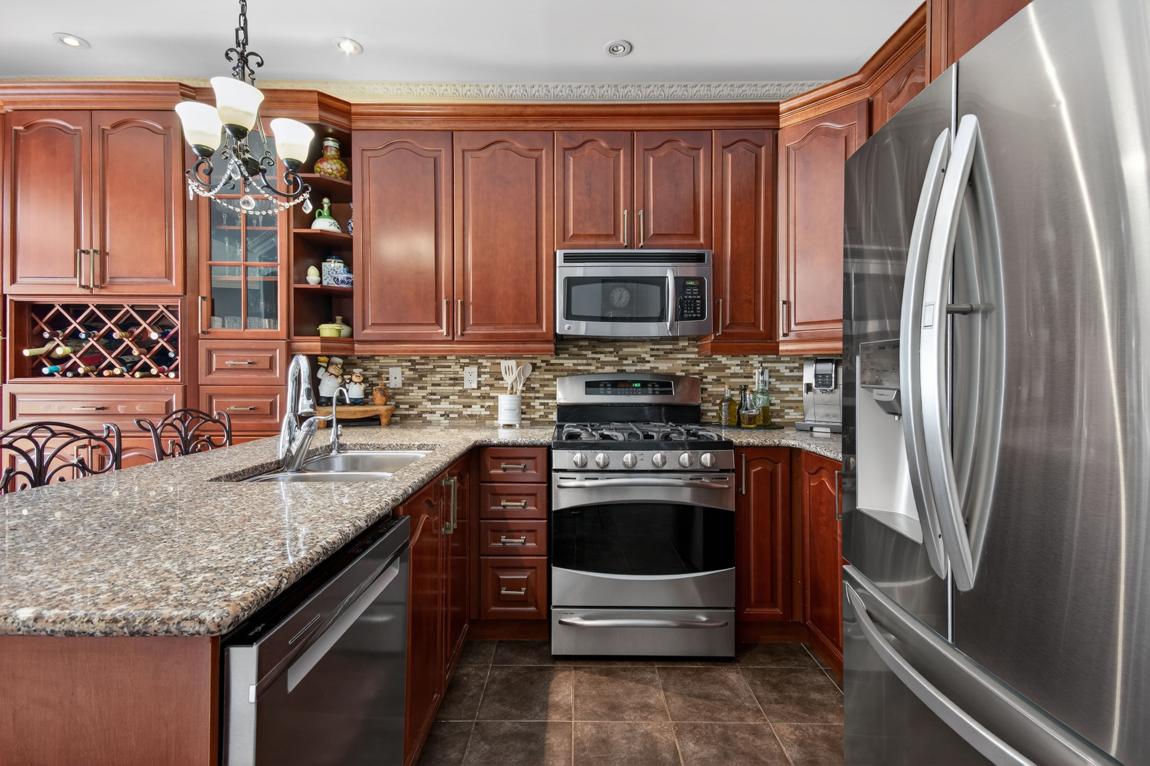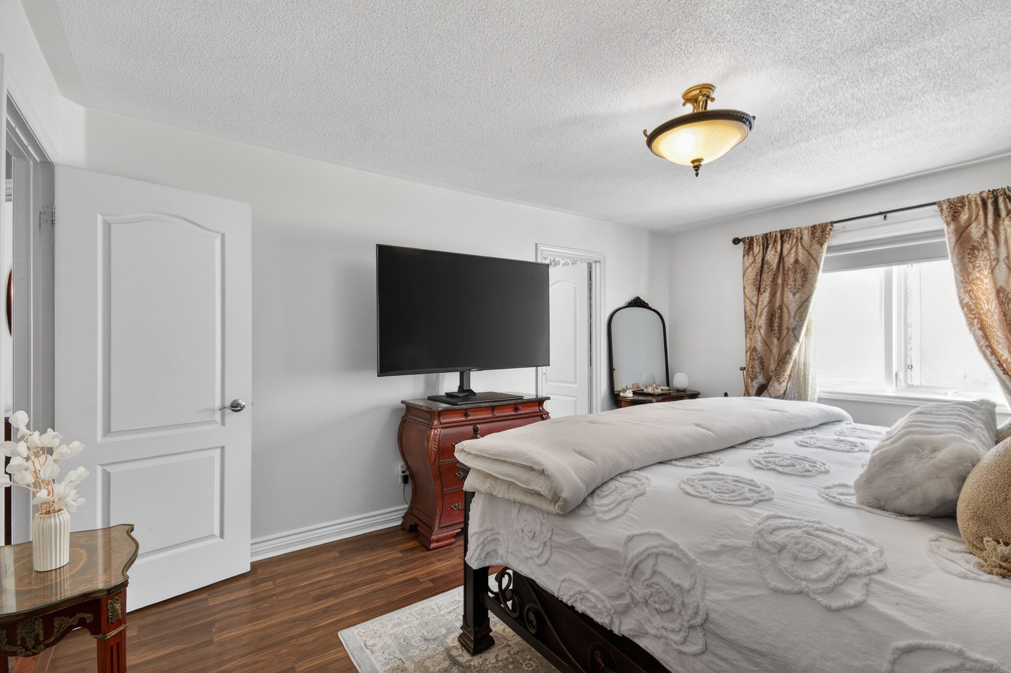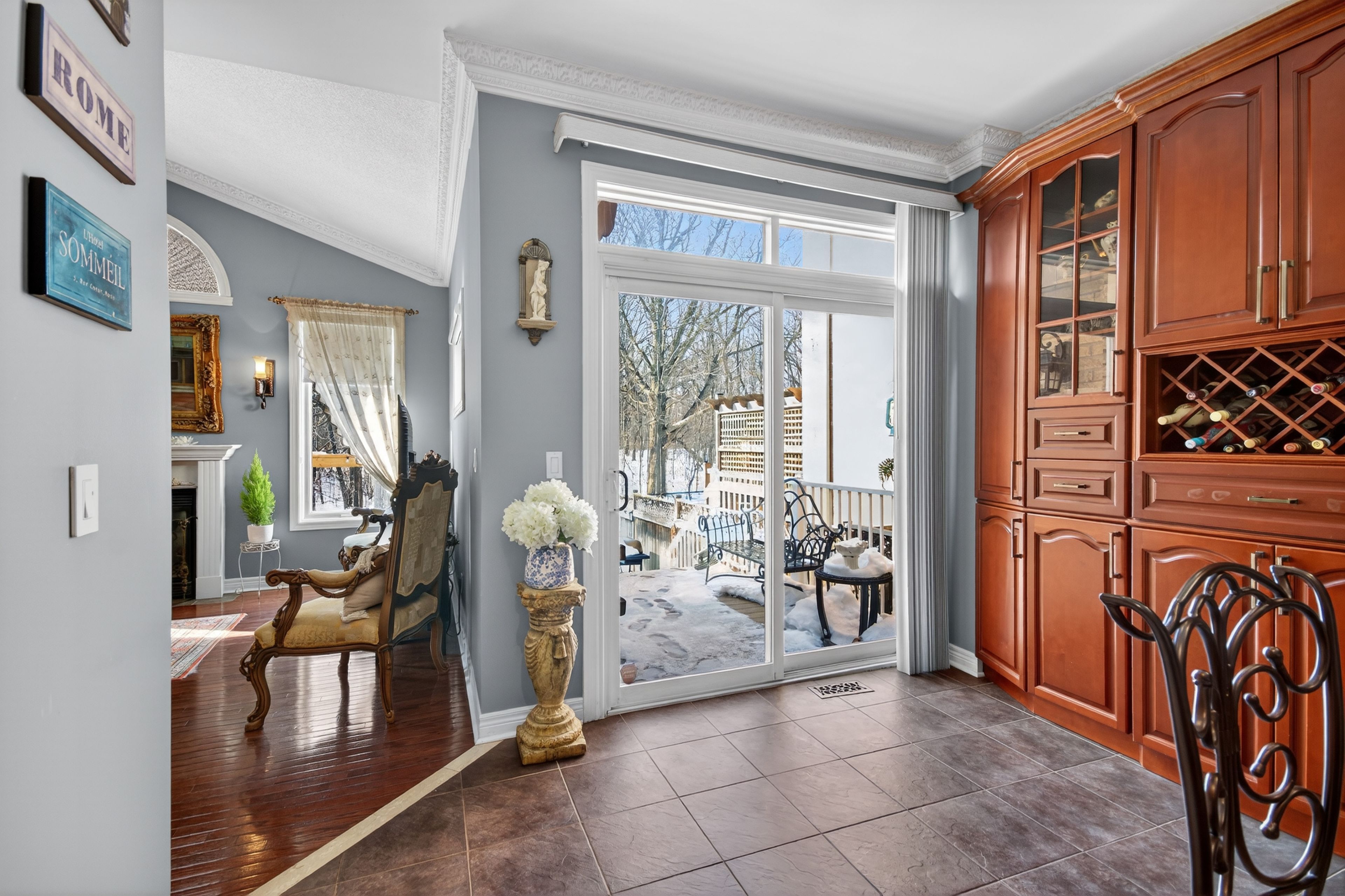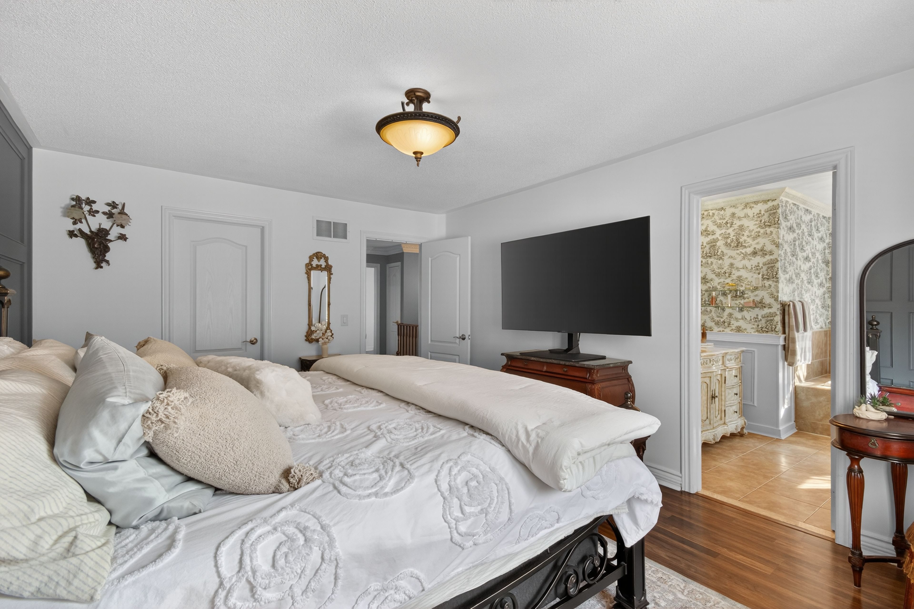 Welcome to one of the most private and beautifully maintained homes in churchill meadows. Set on a premium lot backing directly onto mature forested greenspace, this 4-bedroom, 4-bathdetached residence offers over 3000 sq ft of living space including a fully finished lower level designed for both comfort and entertaining. From the moment you step inside, the pride of ownership is unmistakable. Rich hardwood floors, crown moulding, pot lights and thoughtful upgrades throughout create a home that feels refined yet warm. The custom kitchen features granite counters, tile backsplash, stainless steel appliances and walkout access to a composite deck complete with a full retractable awning - the perfect space for summer dinners, weekend bbqs, and quiet evenings overlooking the treed backdrop. The cathedral-ceiling family room with gas fireplace and oversized picture windows fills the home with natural light while framing the private backyard views. Upstairs, four generous bedrooms offer space for a growing family, including a primary retreat with walk-in closet and 5-piece ensuite. The finished basement feels anything but below grade thanks to the luxurious finishes, extended windows, a 3-piece bath and ample space for recreation, fitness or media enjoyment. The professionally finished 2-car garage with tiled floor and paneled walls adds both function and polish - ideal for vehicles, storage, or a clean workshop setup. Located steps to parks, schools and transit in one of mississauga's most sought-after family communities. This is one to see in person.